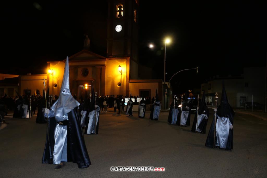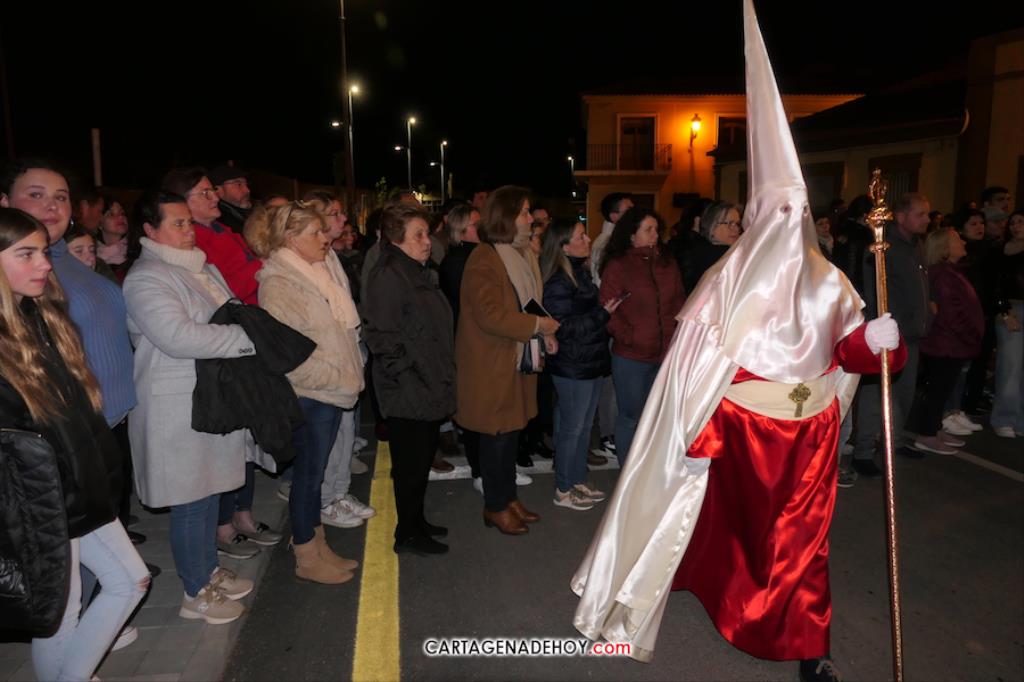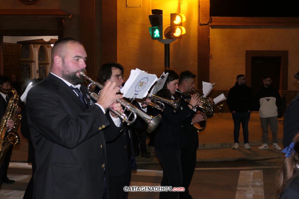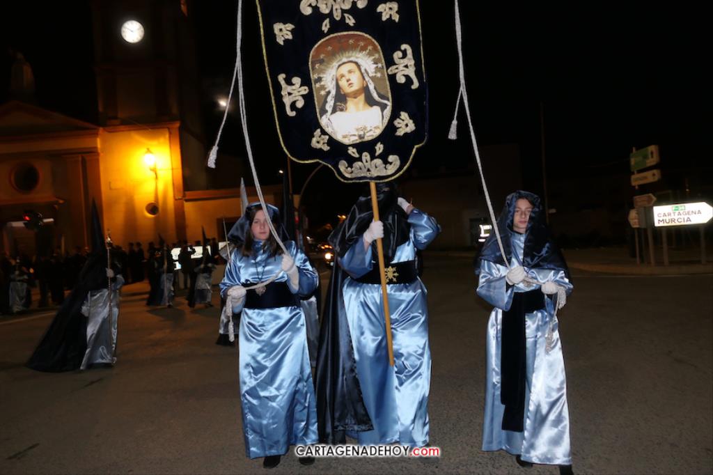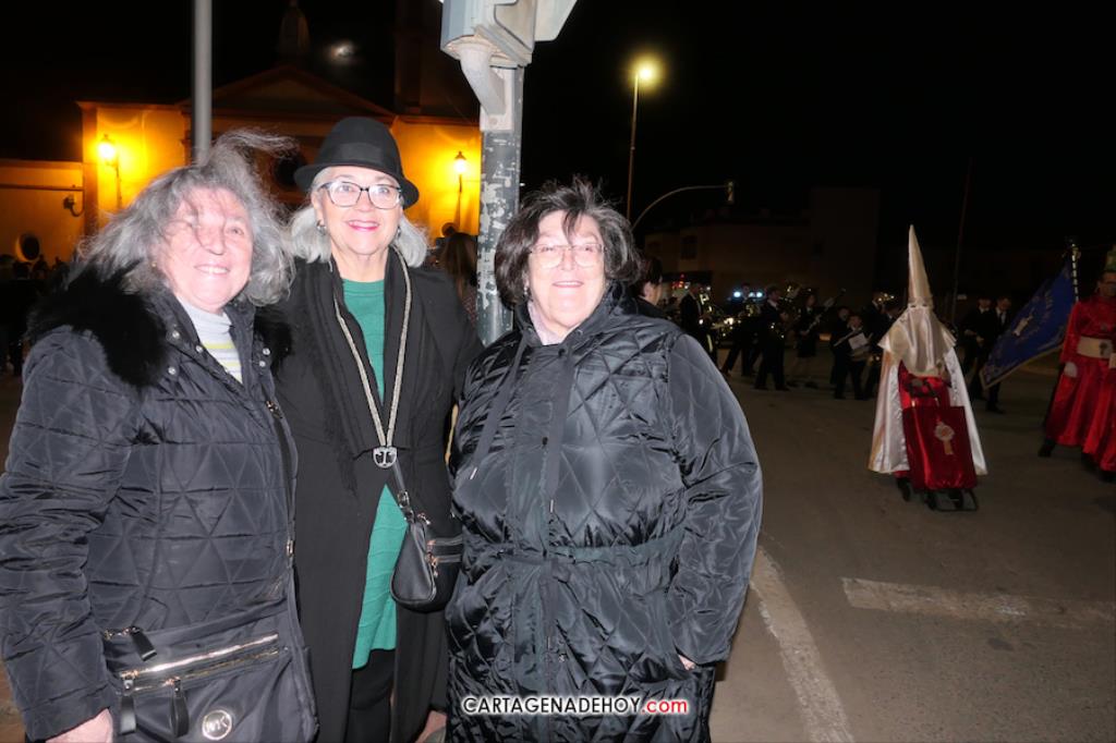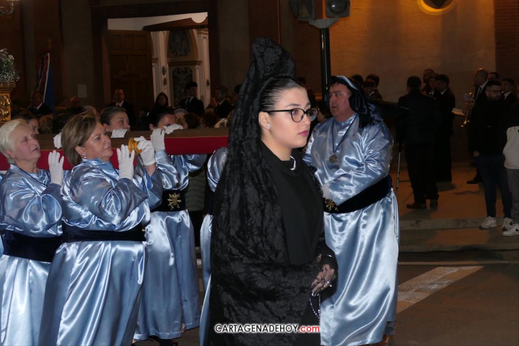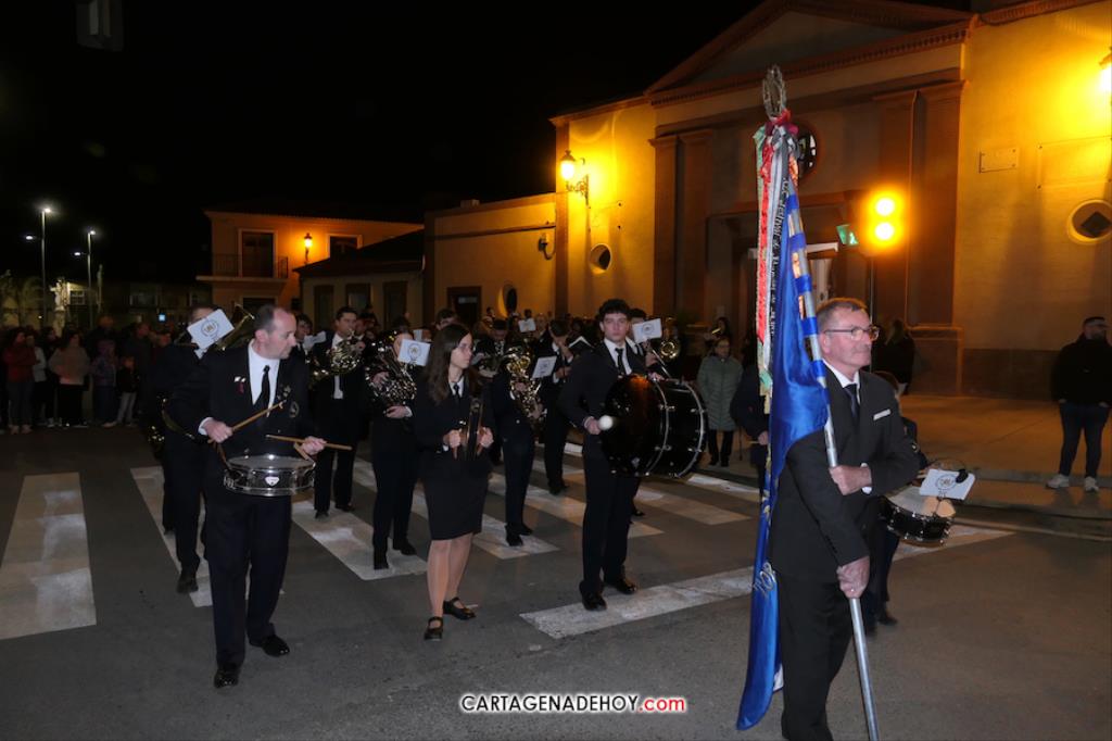 El cortejo repite el recorrido que fijó el pasado año, saliendo hacia la izquierda y tomando la calle Santa Florentina (RM-311). Enseguida sale la Dolorosa, esta vez llevada por costaleras. El viento incomoda a las penitentes al agitar capuces y túnicas, pero no altera su buen hacer. Detrás va el párroco, Daniel Díaz; los concejales Toñi Pérez y Enrique Pérez Abellán (MC) y la banda de música, que se ha dividido en dos partes, una entre los dos tronos y otra en cola.