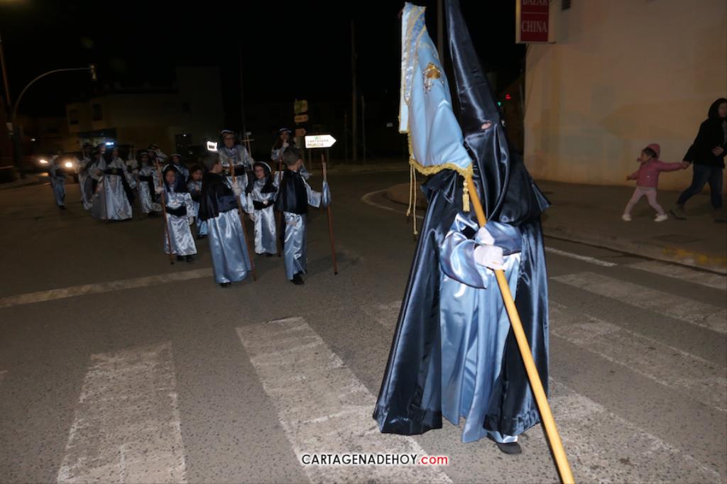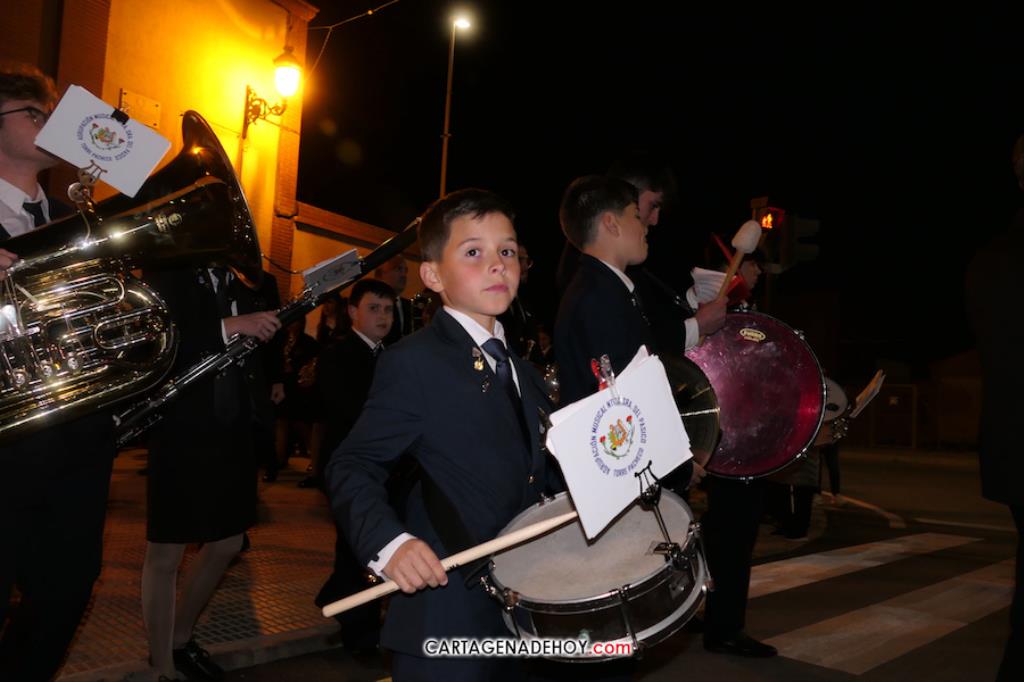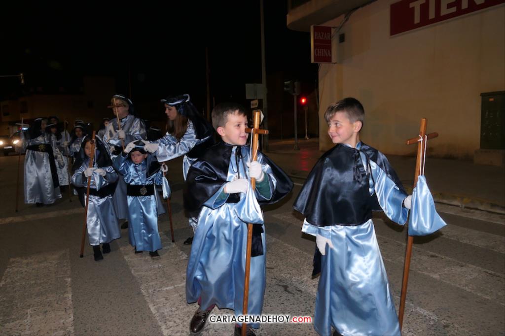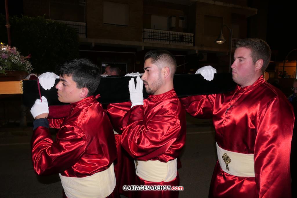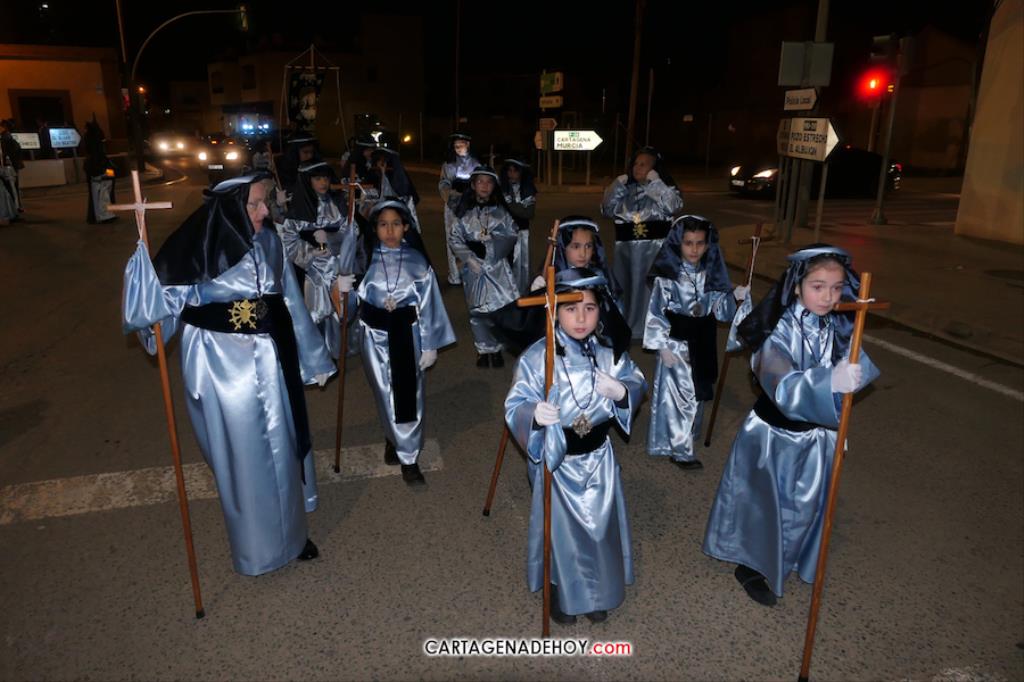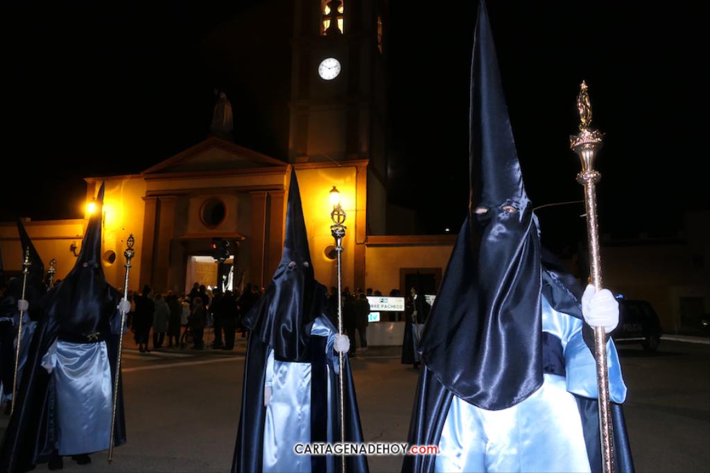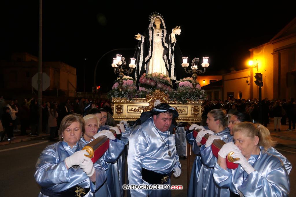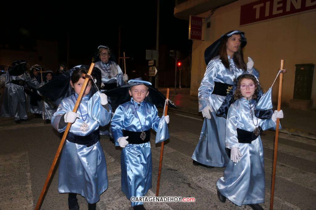El cortejo repite el recorrido que fijó el pasado año, saliendo hacia la izquierda y tomando la calle Santa Florentina (RM-311). Enseguida sale la Dolorosa, esta vez llevada por costaleras. El viento incomoda a las penitentes al agitar capuces y túnicas, pero no altera su buen hacer. Detrás va el párroco, Daniel Díaz; los concejales Toñi Pérez y Enrique Pérez Abellán (MC) y la banda de música, que se ha dividido en dos partes, una entre los dos tronos y otra en cola.