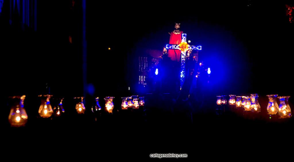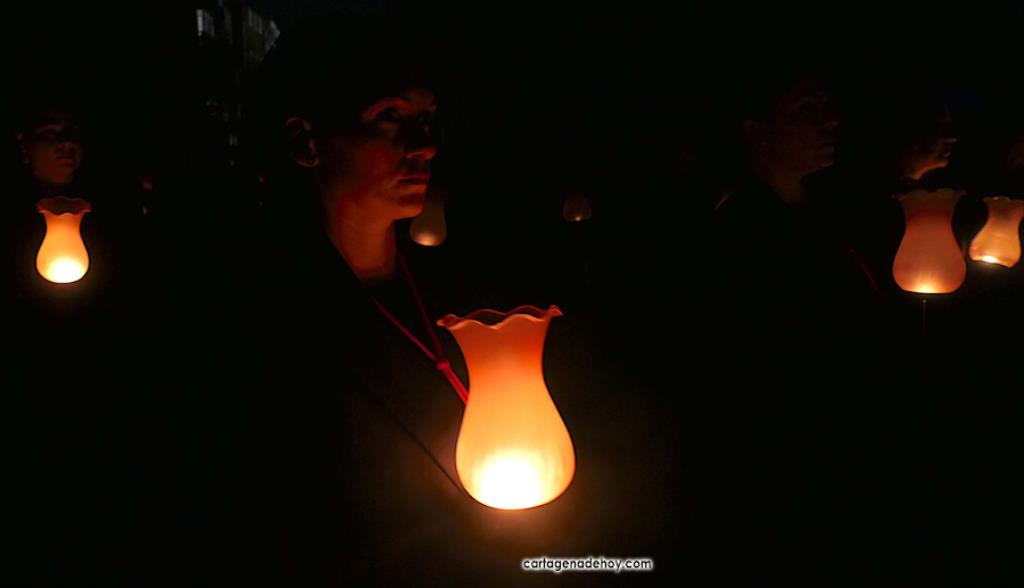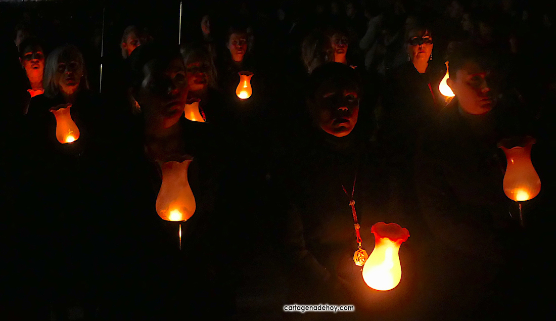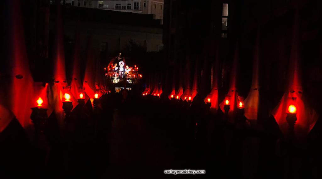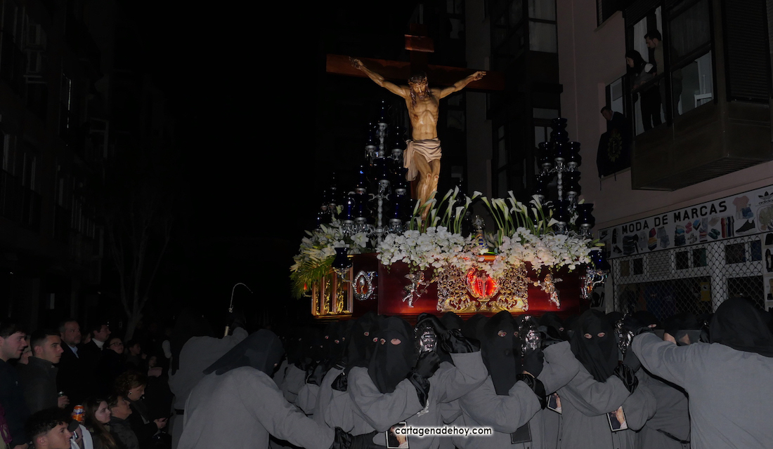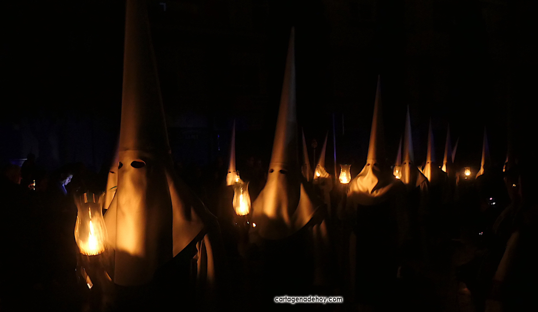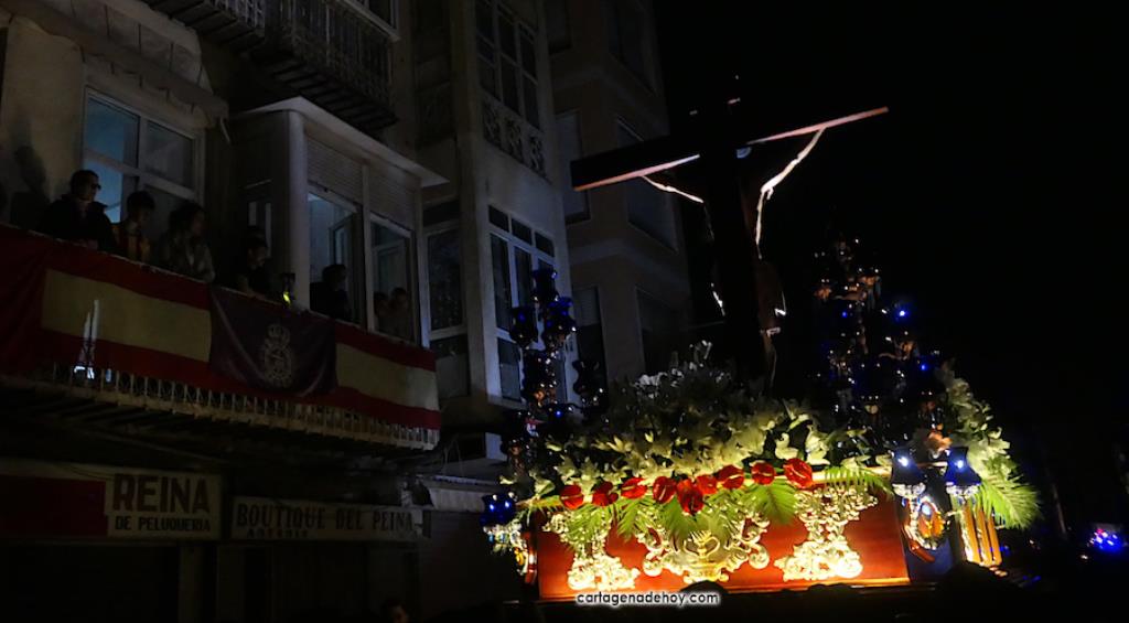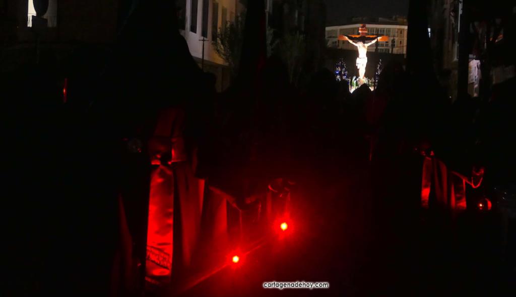 Merecían los californios una noche tranquila después del agua del domingo, la incertidumbre del martes y el vendaval del miércoles. El día no lo fue, pues fue un jueves de vientos, aunque no tan fuertes como la noche anterior. Sin embargo, al llegar la noche amainó mucho y el desfile de la muerte de Cristo se celebró sin problema alguno. Apuntar que, a diferencia de años anteriores, se adelantó algo la salida y también la masiva presencia de público, que, salvo por la oscuridad, más bien parecía un Miércoles Santo durante el magno desfile californio.