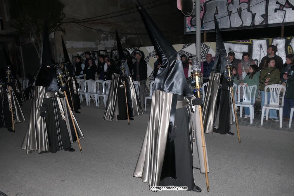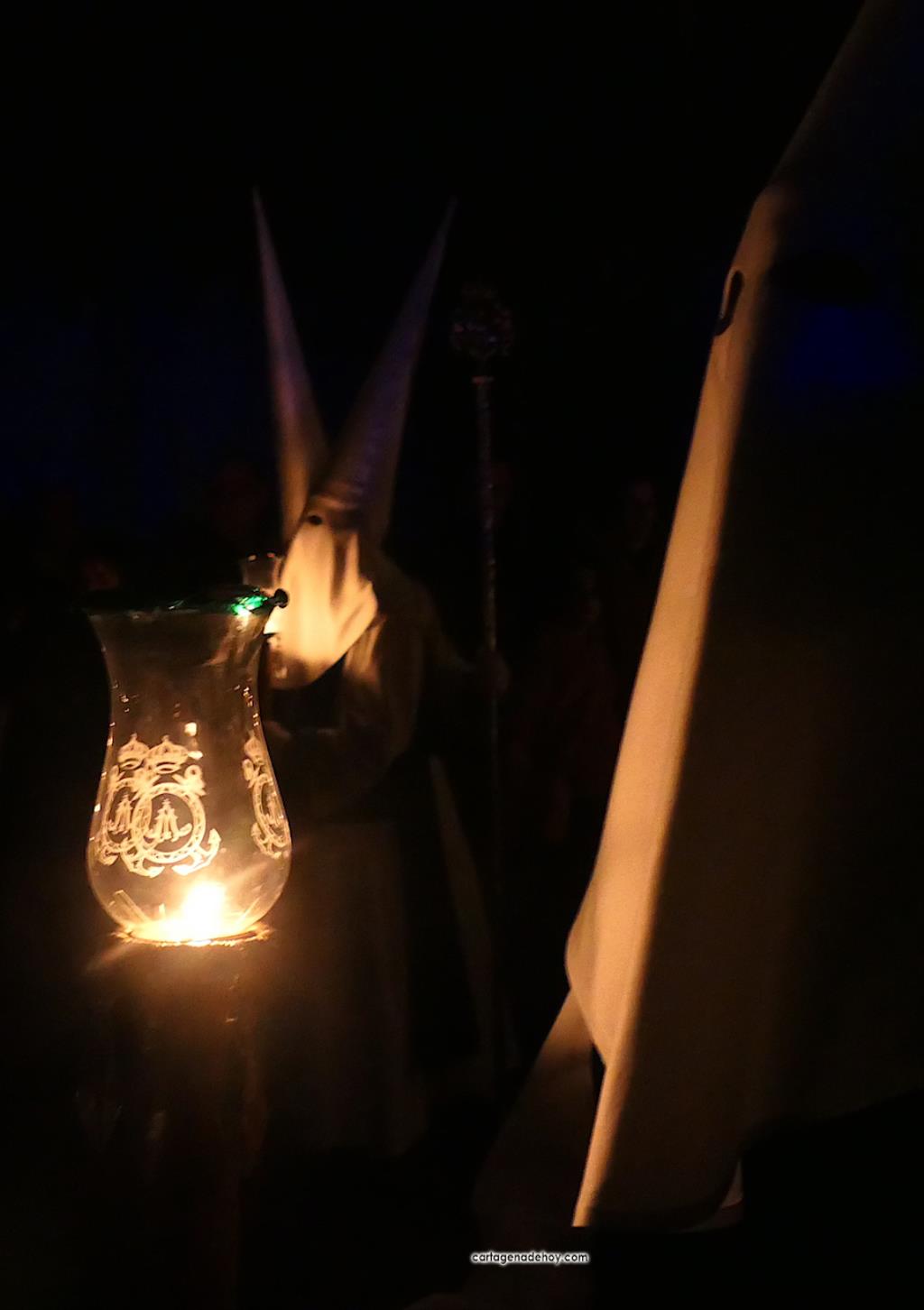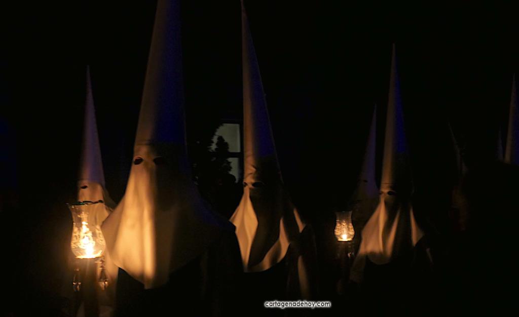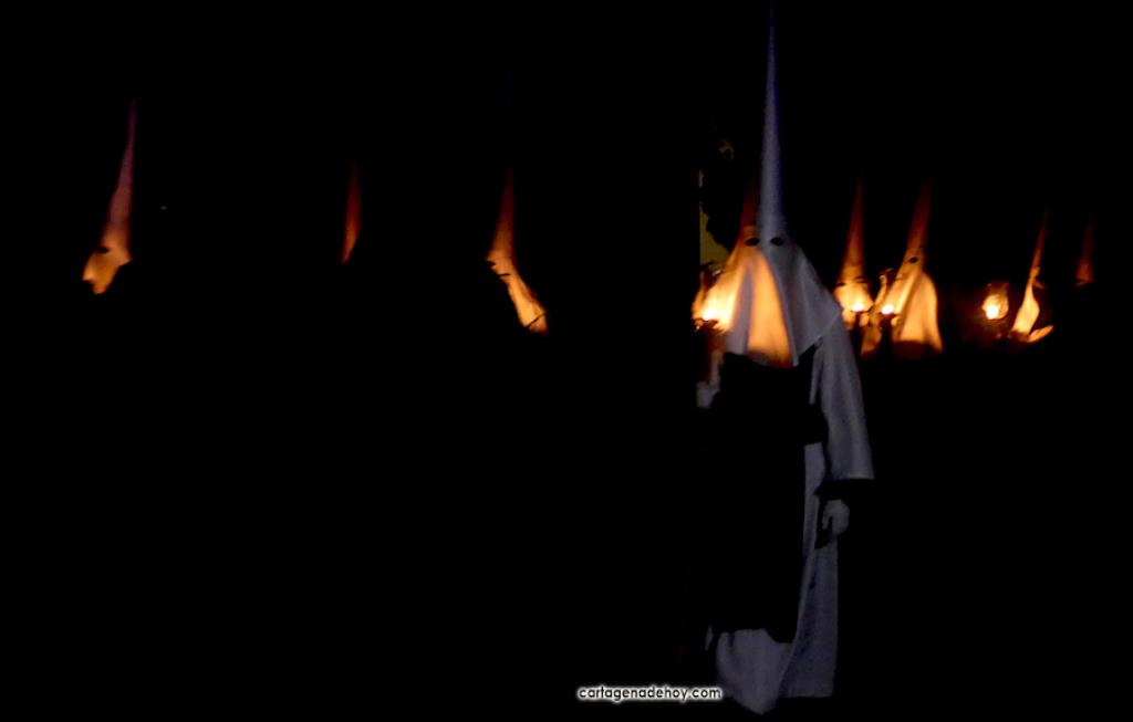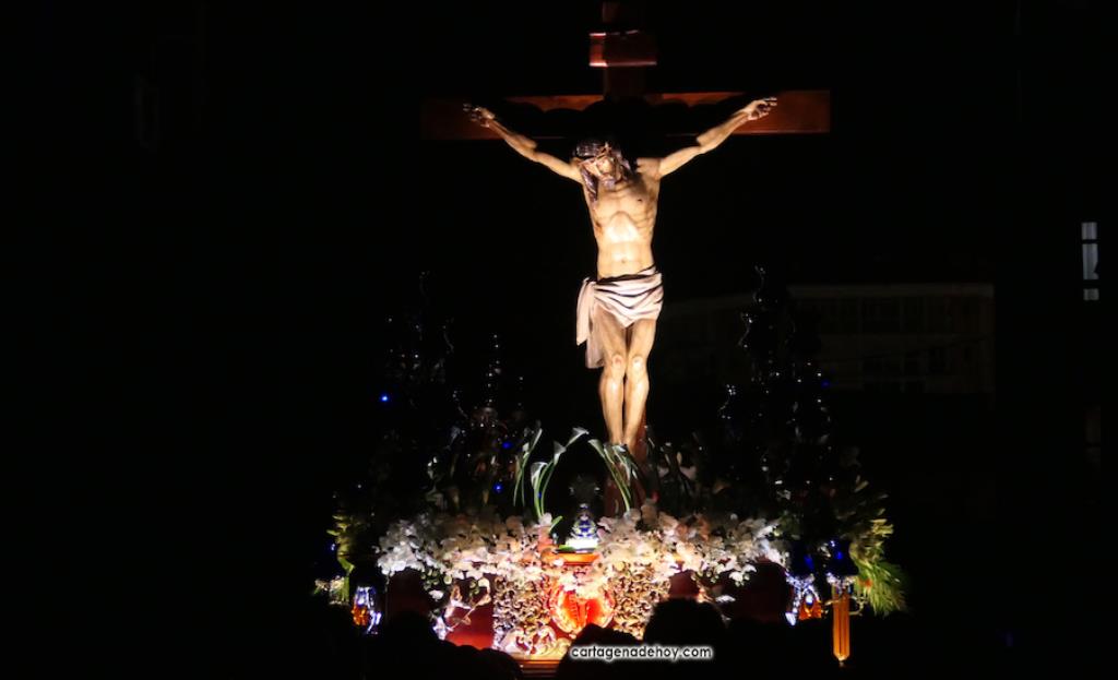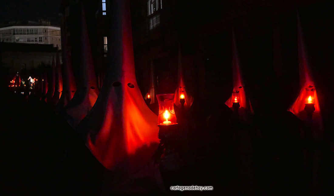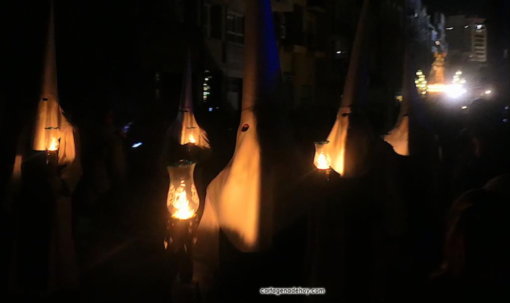 Merecían los californios una noche tranquila después del agua del domingo, la incertidumbre del martes y el vendaval del miércoles. El día no lo fue, pues fue un jueves de vientos, aunque no tan fuertes como la noche anterior. Sin embargo, al llegar la noche amainó mucho y el desfile de la muerte de Cristo se celebró sin problema alguno. Apuntar que, a diferencia de años anteriores, se adelantó algo la salida y también la masiva presencia de público, que, salvo por la oscuridad, más bien parecía un Miércoles Santo durante el magno desfile californio.