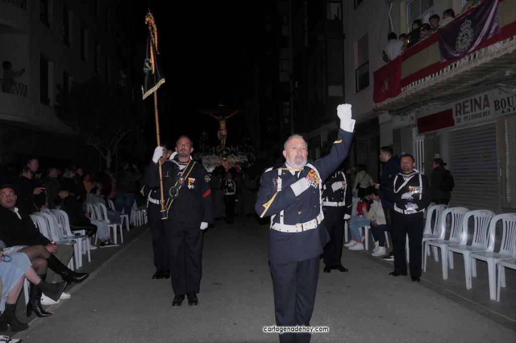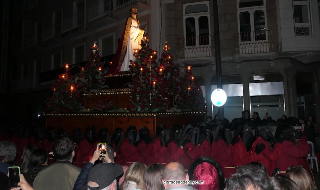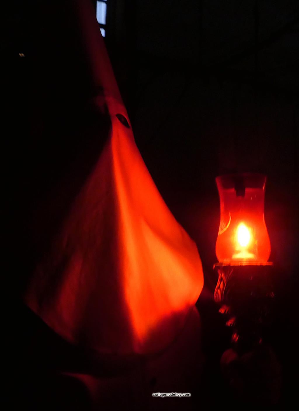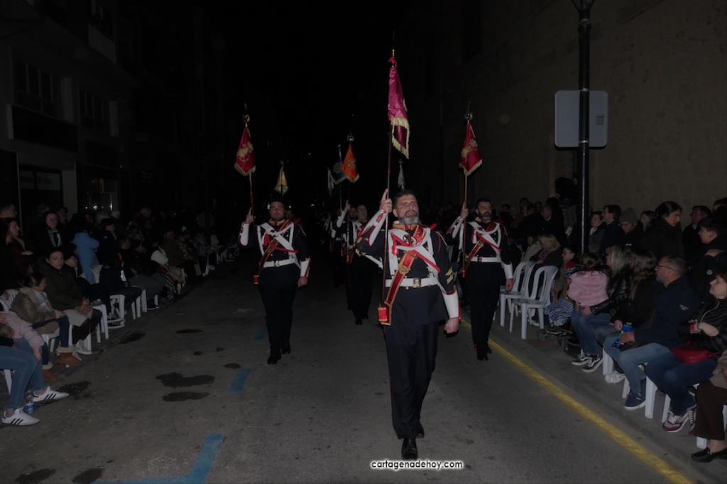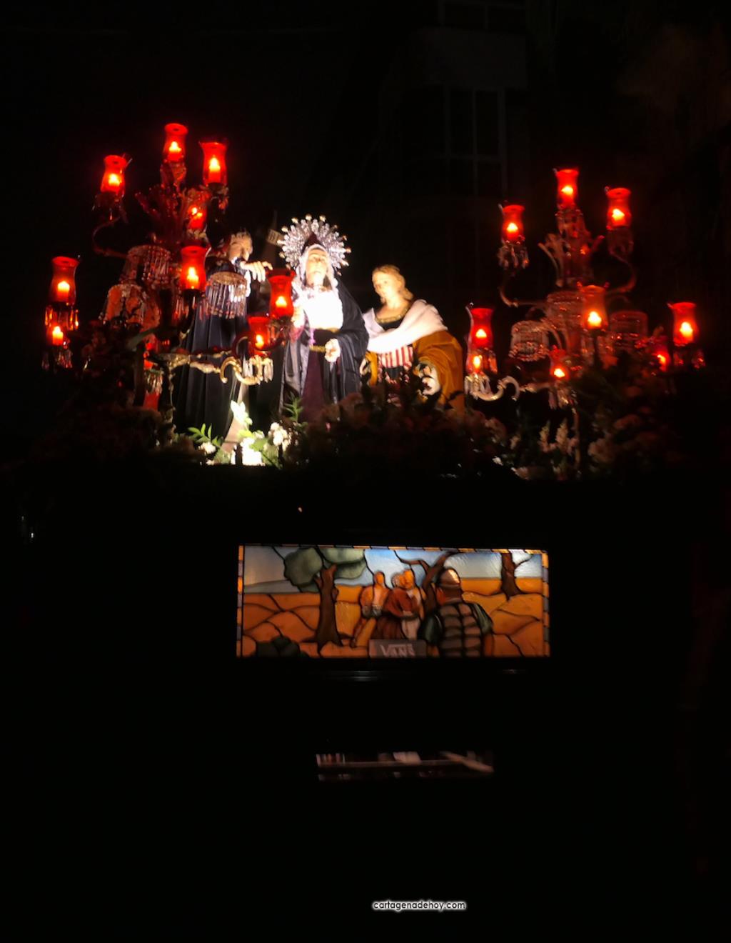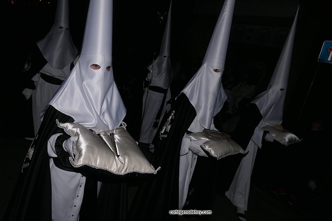 Merecían los californios una noche tranquila después del agua del domingo, la incertidumbre del martes y el vendaval del miércoles. El día no lo fue, pues fue un jueves de vientos, aunque no tan fuertes como la noche anterior. Sin embargo, al llegar la noche amainó mucho y el desfile de la muerte de Cristo se celebró sin problema alguno. Apuntar que, a diferencia de años anteriores, se adelantó algo la salida y también la masiva presencia de público, que, salvo por la oscuridad, más bien parecía un Miércoles Santo durante el magno desfile californio.