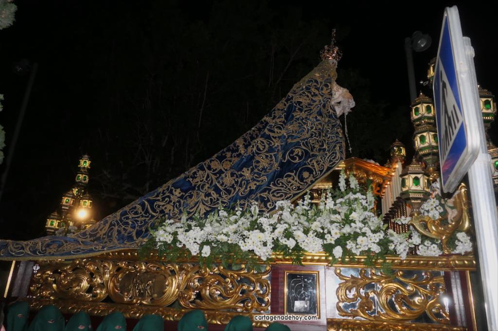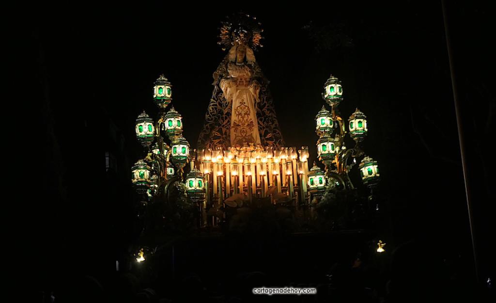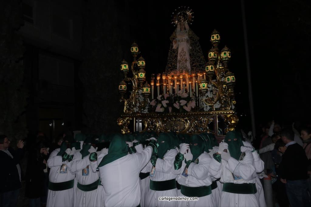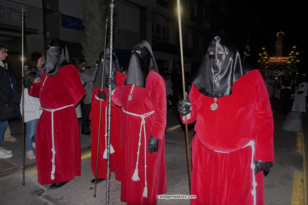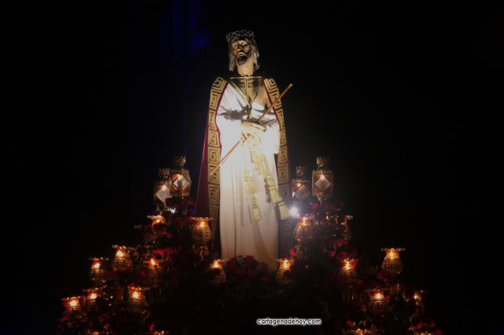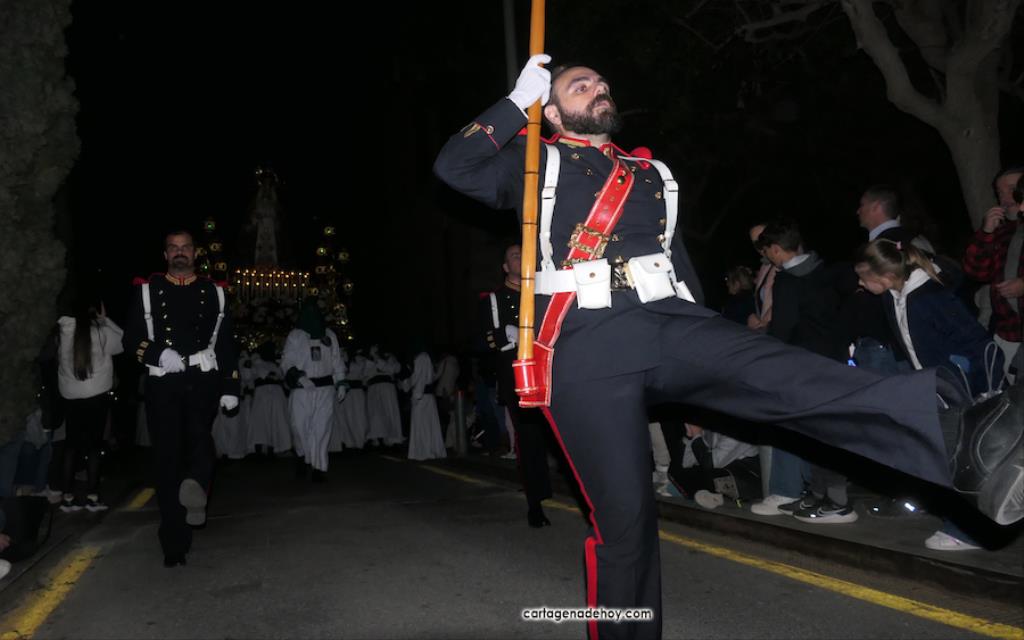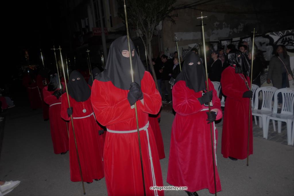 Merecían los californios una noche tranquila después del agua del domingo, la incertidumbre del martes y el vendaval del miércoles. El día no lo fue, pues fue un jueves de vientos, aunque no tan fuertes como la noche anterior. Sin embargo, al llegar la noche amainó mucho y el desfile de la muerte de Cristo se celebró sin problema alguno. Apuntar que, a diferencia de años anteriores, se adelantó algo la salida y también la masiva presencia de público, que, salvo por la oscuridad, más bien parecía un Miércoles Santo durante el magno desfile californio.