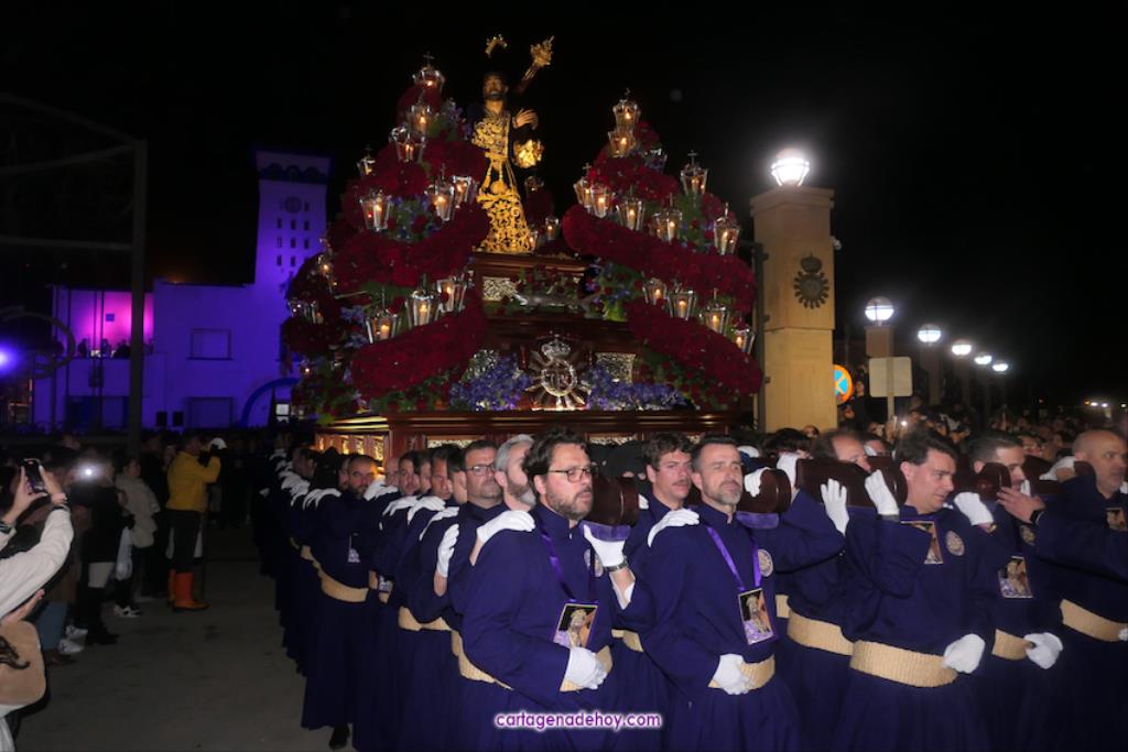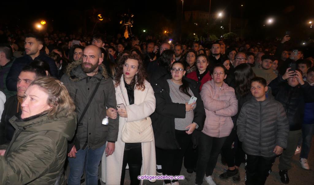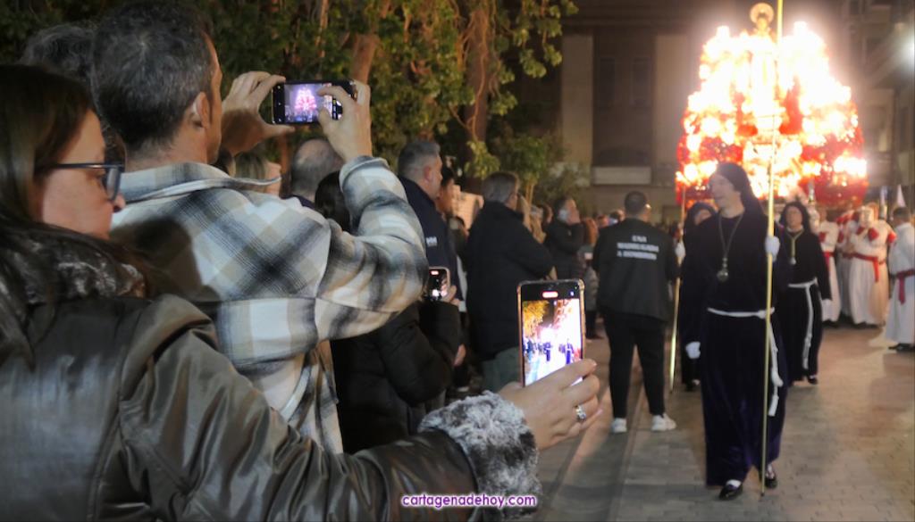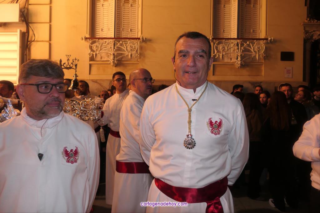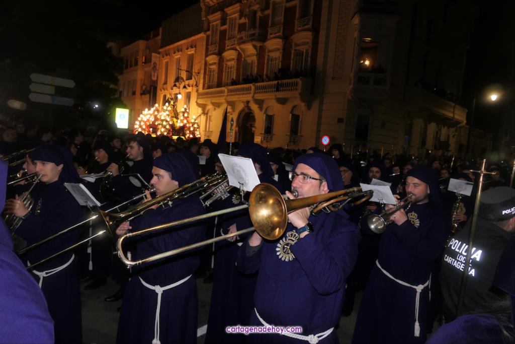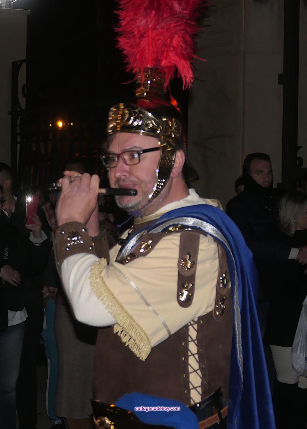 El tiempo respetó y volvió a ser ‘la madrugada de cada año en la que Cartagena no duerme’ con miles de personas de trasiego por la ciudad para ver salir a las diferentes procesiones, siendo el culmen cuando el Nazareno se encuentro con su madre, ‘La Pequeñica’. En la imagen, salida del Jesús desde la Pescadería con el sonido de la caracola.