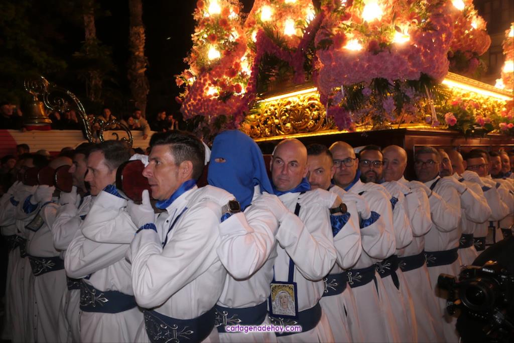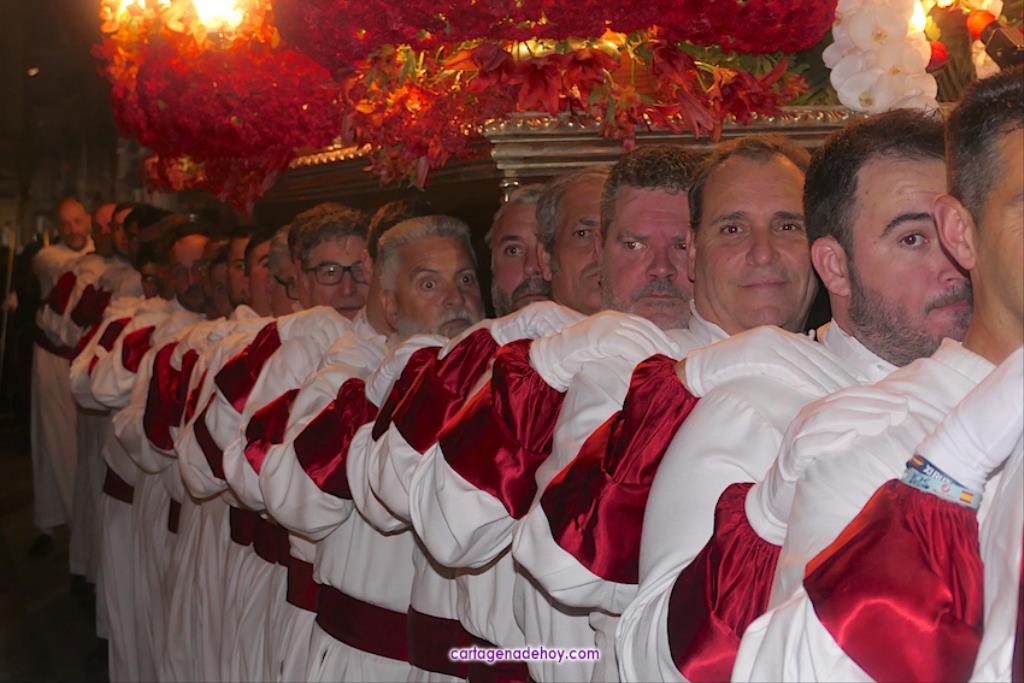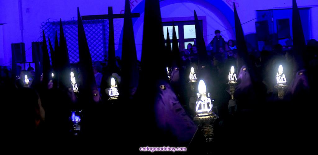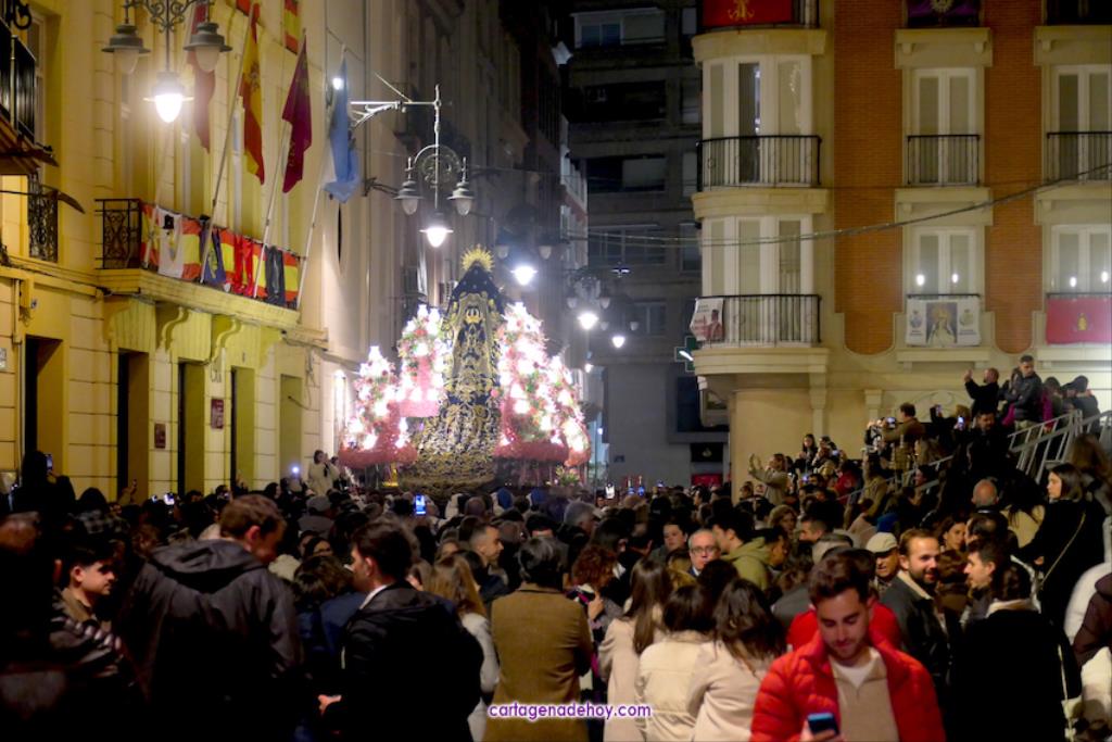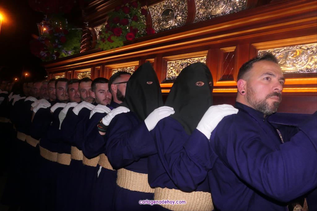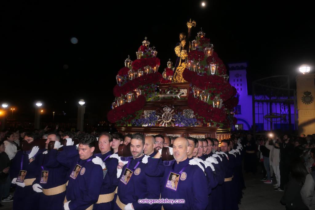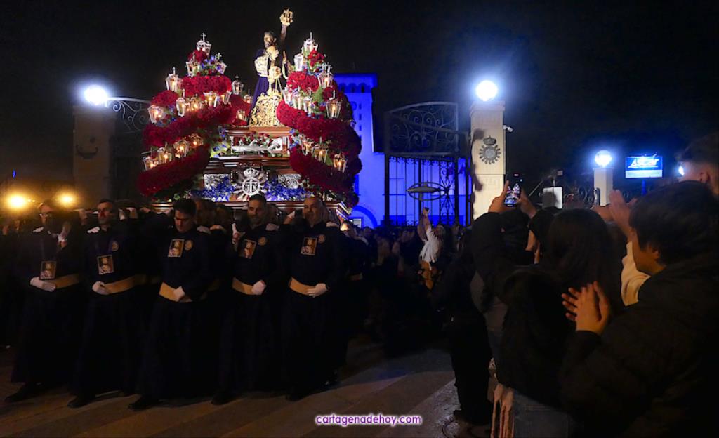 El tiempo respetó y volvió a ser ‘la madrugada de cada año en la que Cartagena no duerme’ con miles de personas de trasiego por la ciudad para ver salir a las diferentes procesiones, siendo el culmen cuando el Nazareno se encuentro con su madre, ‘La Pequeñica’. En la imagen, salida del Jesús desde la Pescadería con el sonido de la caracola.