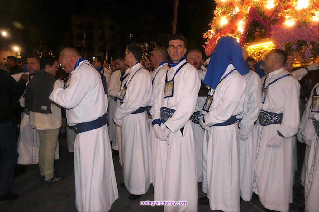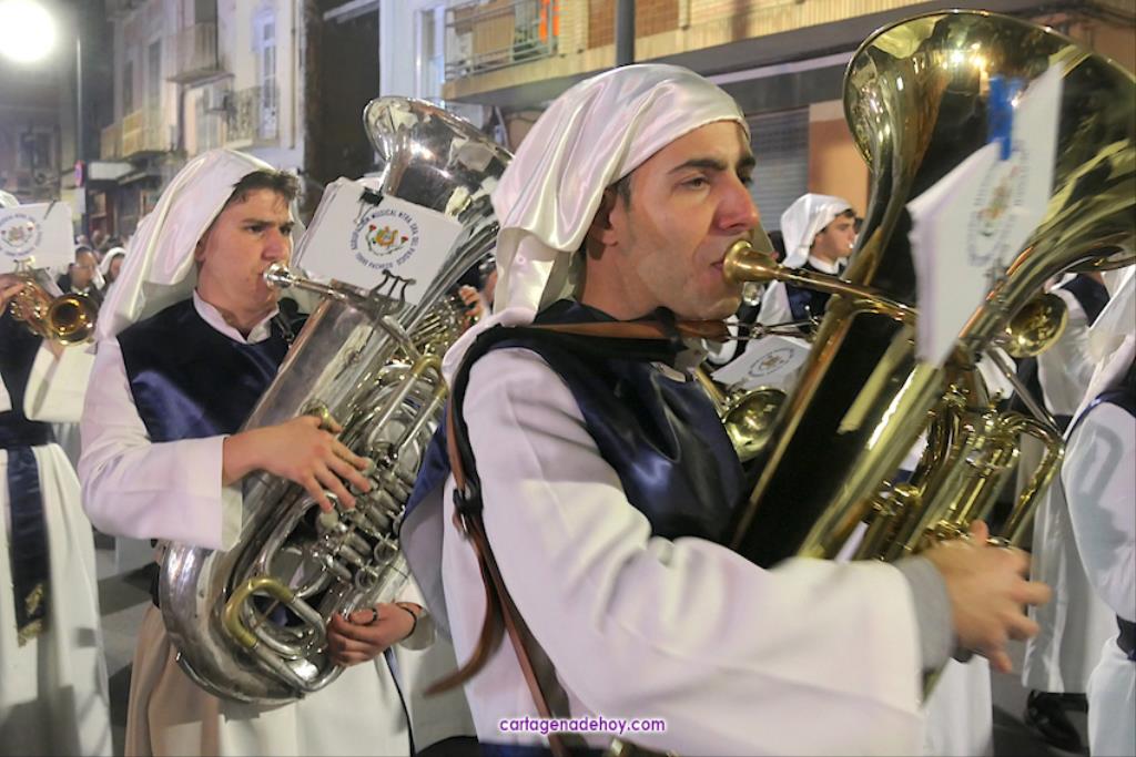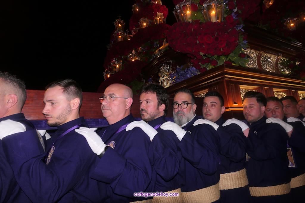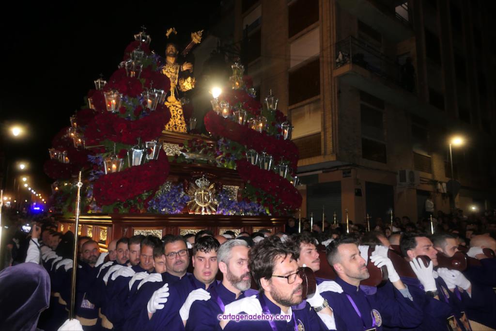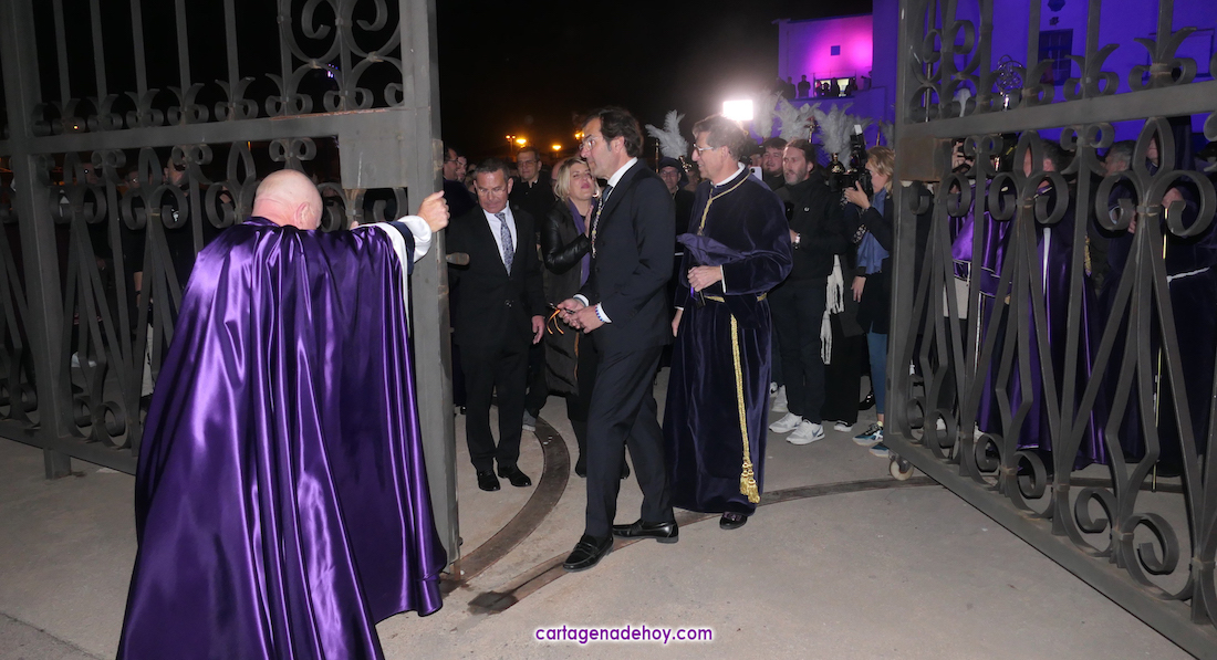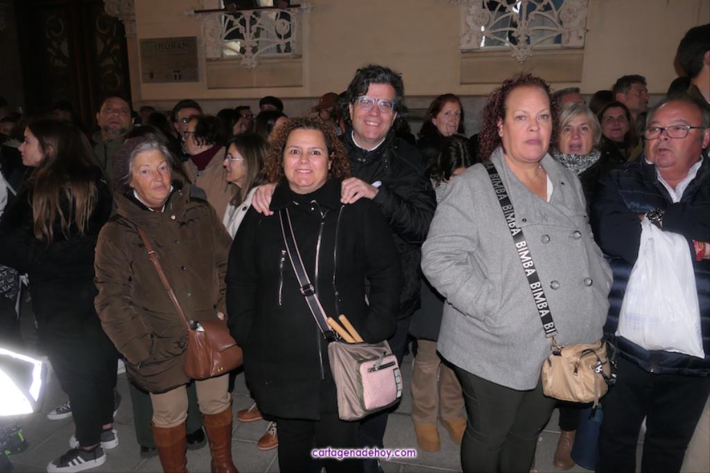 El tiempo respetó y volvió a ser ‘la madrugada de cada año en la que Cartagena no duerme’ con miles de personas de trasiego por la ciudad para ver salir a las diferentes procesiones, siendo el culmen cuando el Nazareno se encuentro con su madre, ‘La Pequeñica’. En la imagen, salida del Jesús desde la Pescadería con el sonido de la caracola.