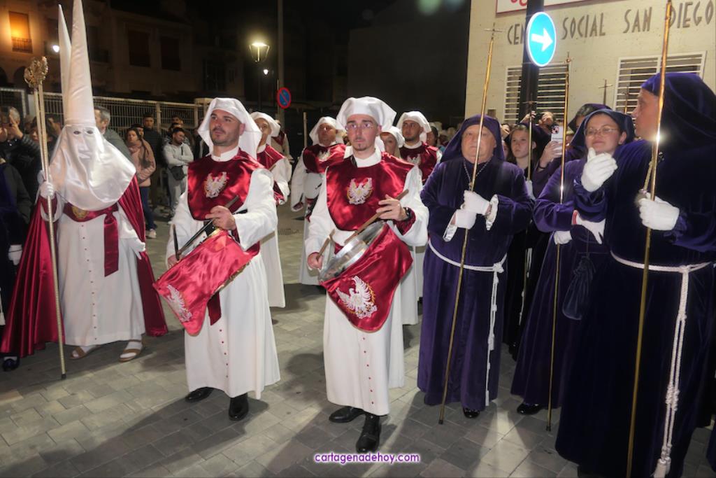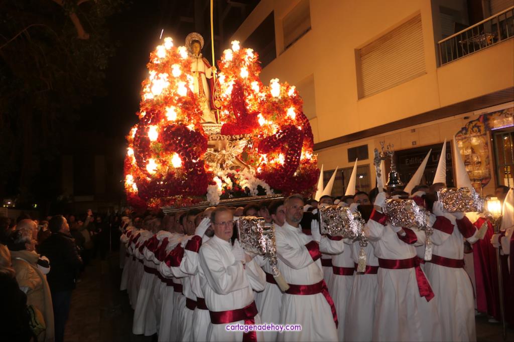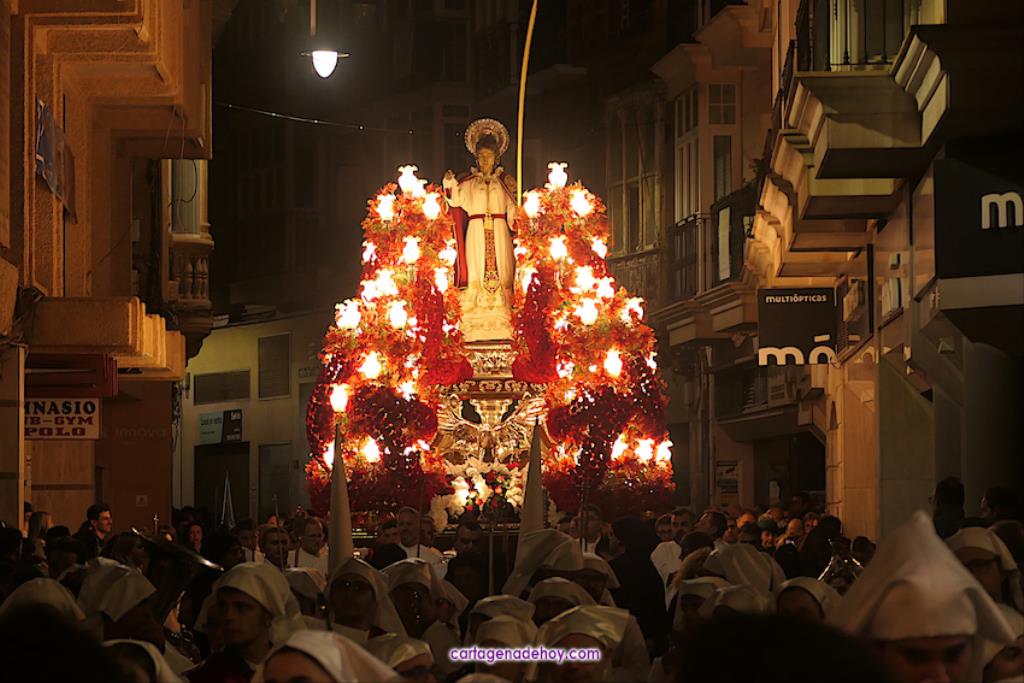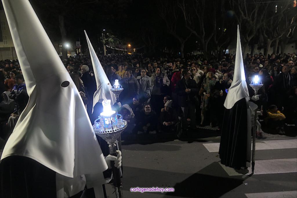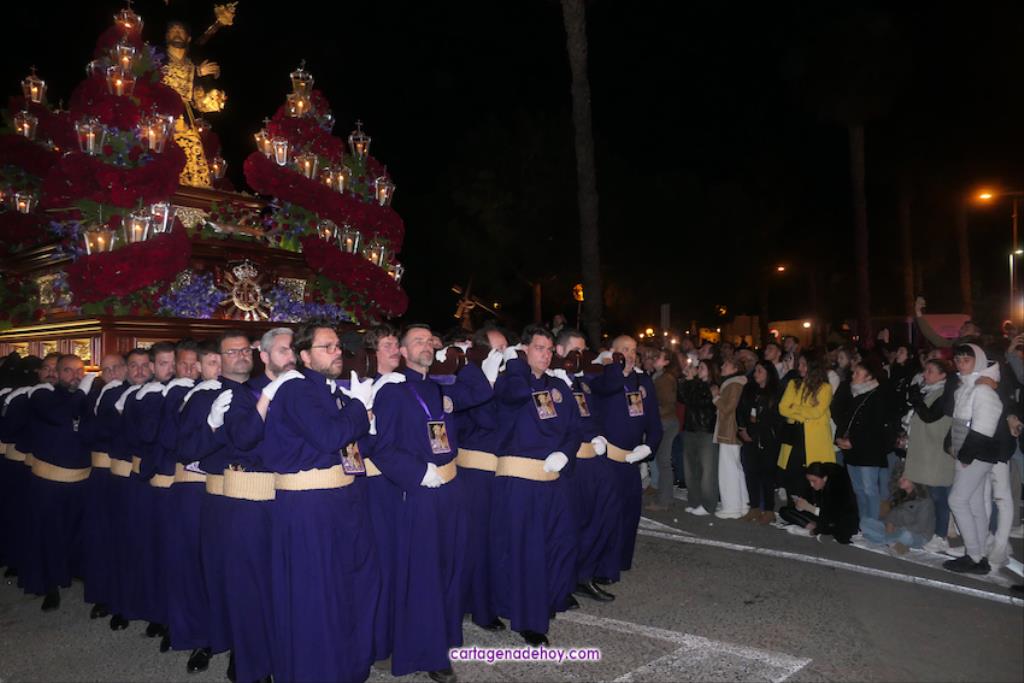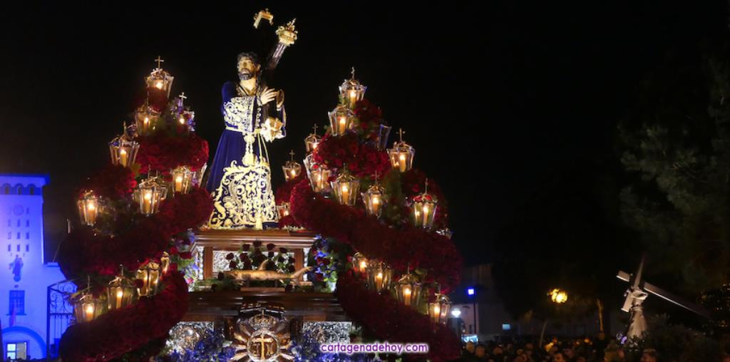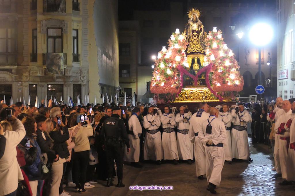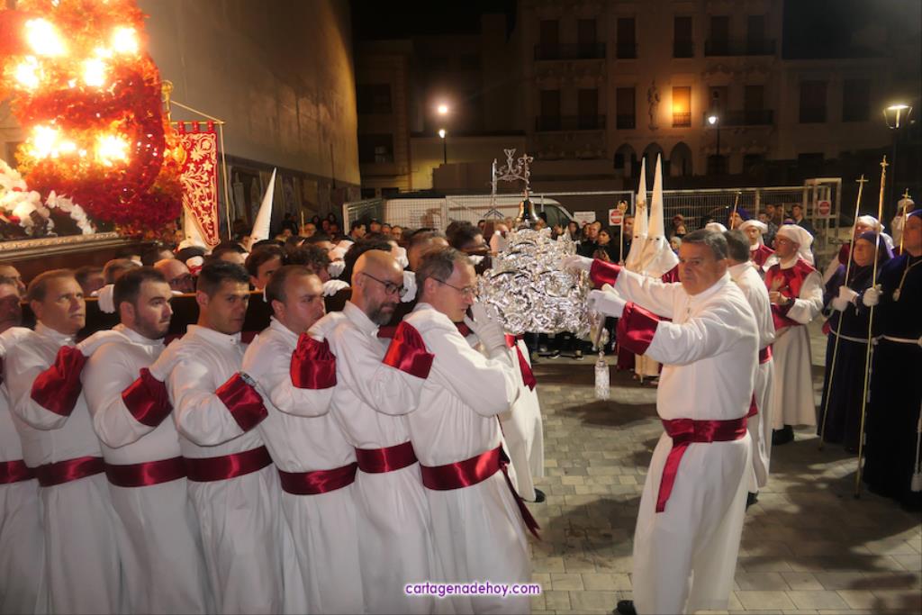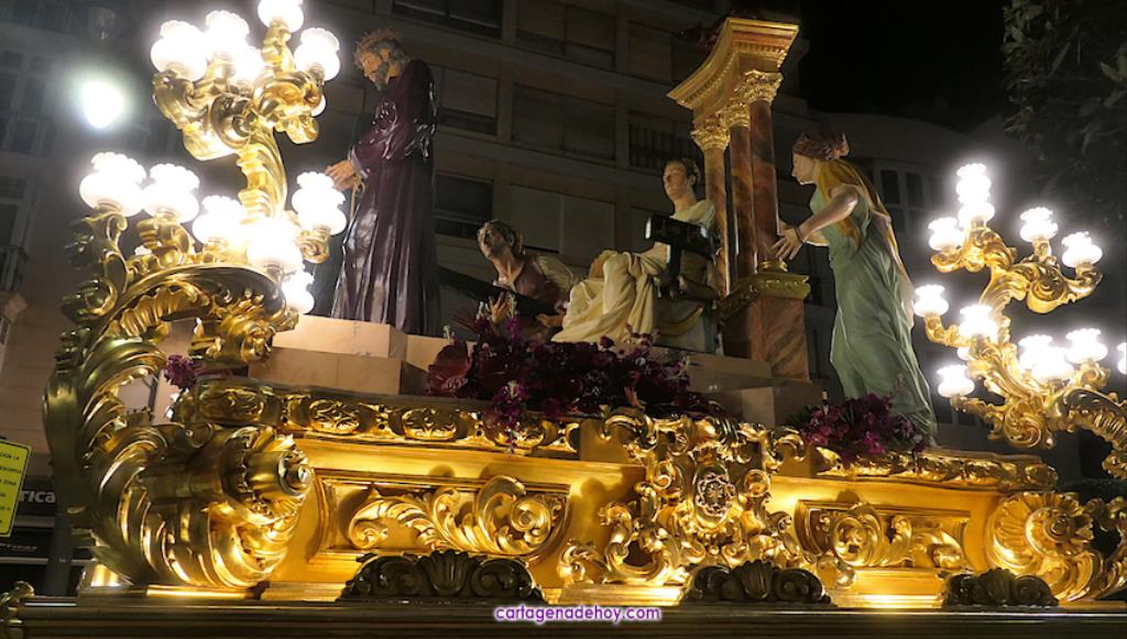 Los tronos ya son los siguientes en la formación. Primero va el Medinaceli, seguido por los primeros que se pusieron en marcha esta madrugada (a las dos desde Santa María): Condena de Jesús y Primera Caída. También lo hizo la Verónica, única agrupación exclusivamente femenina de la Semana Santa de Cartagena, pero en este caso su tercio y trono se detienen junto al desaparecido Cine Central para incorporarse más tarde al cortejo.