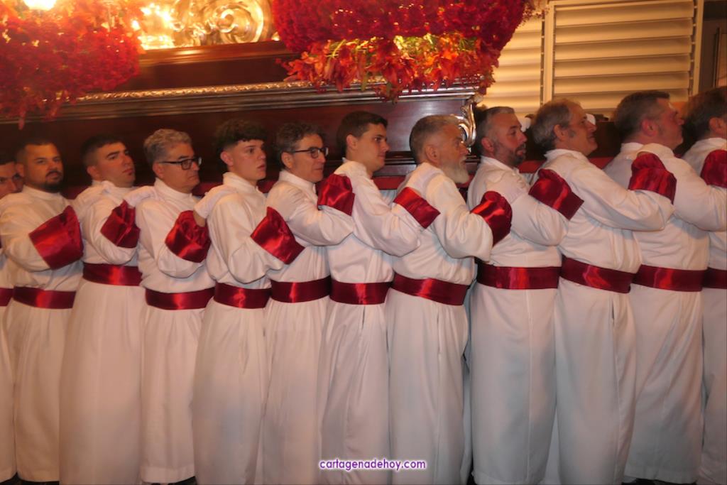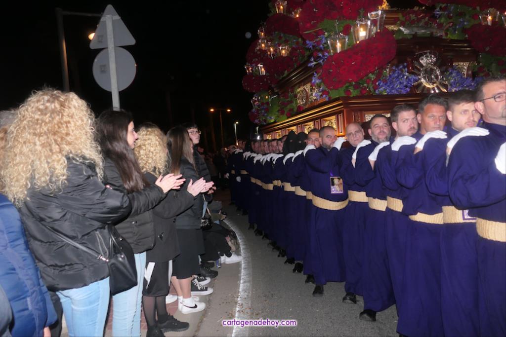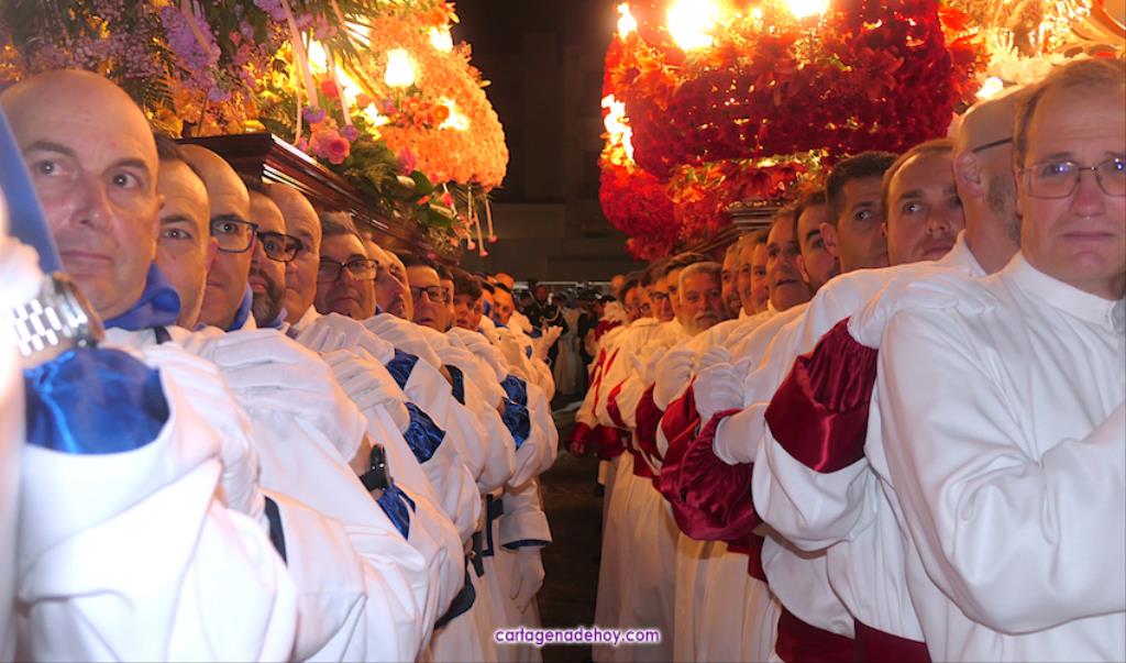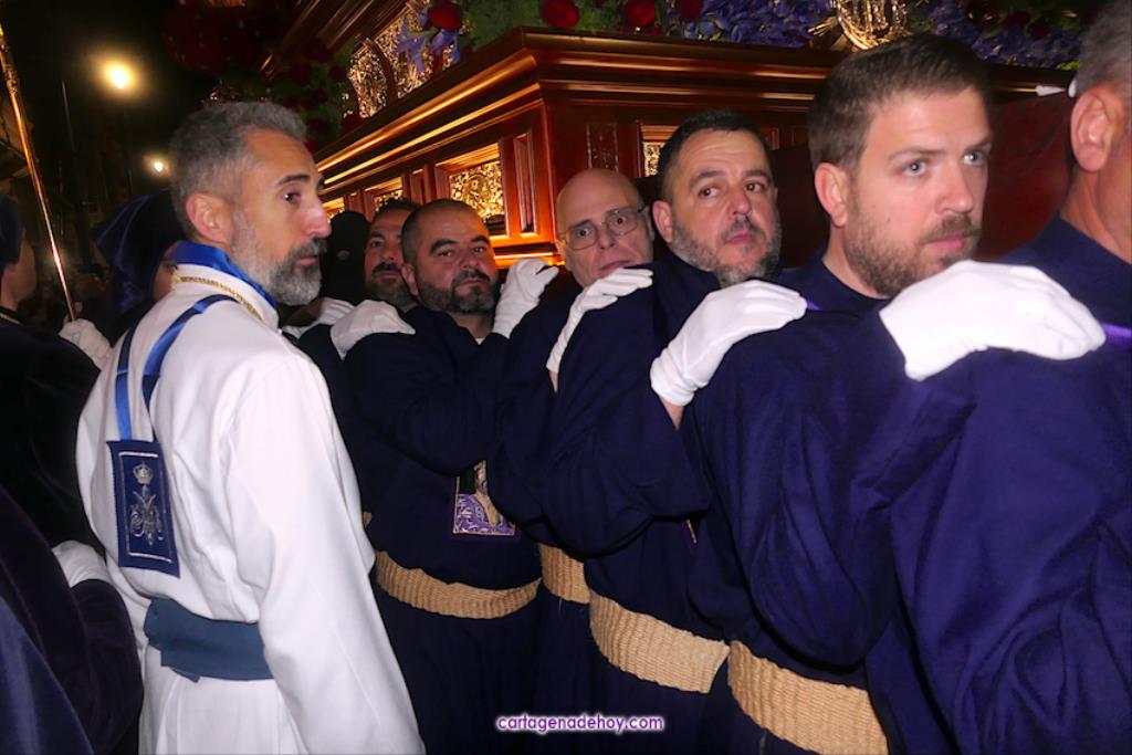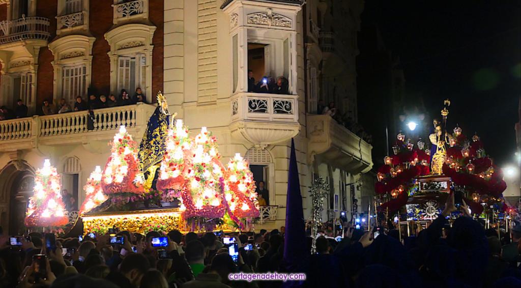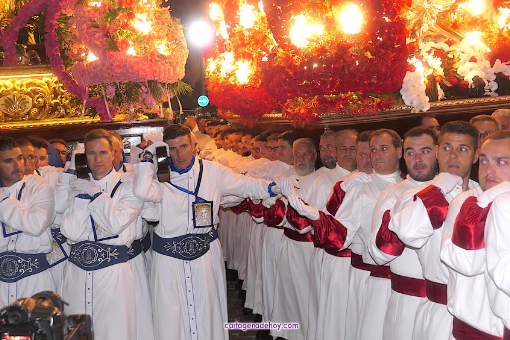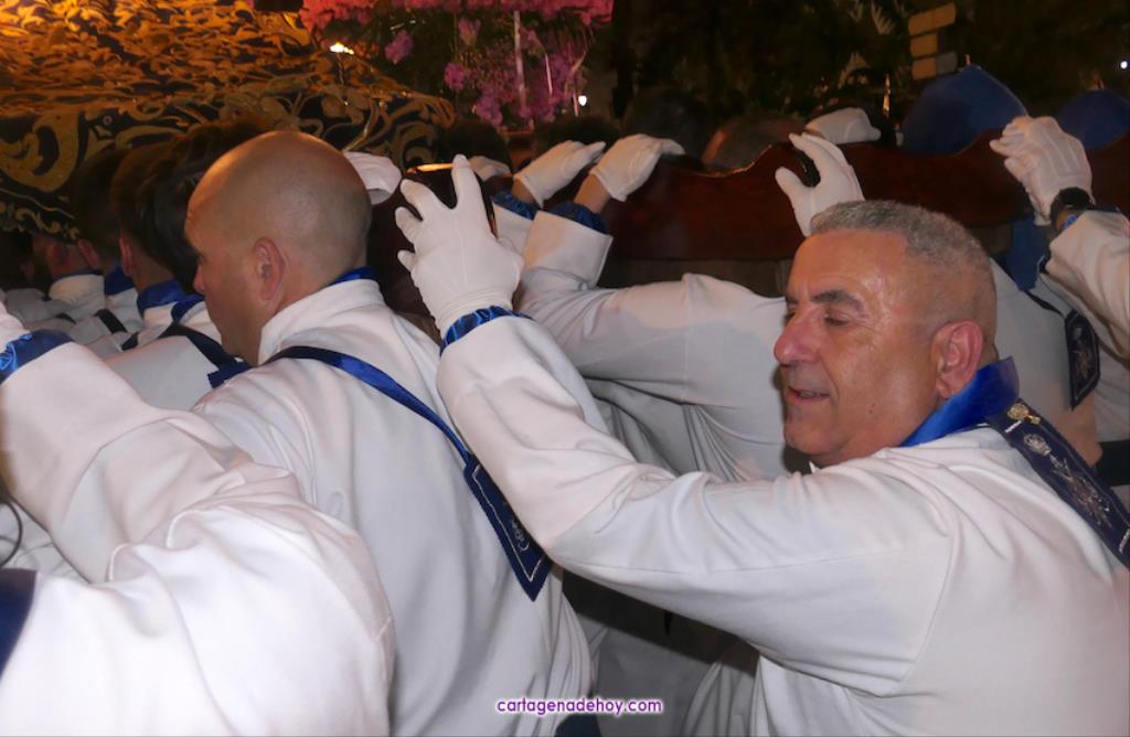 Momento especial es cuando los portapasos de ambos tronos contactan sus manos mientras la madre de Jesús va al encuentro de su hijo en la esquina del Palacio de Aguirre. Lo hace con apenas cinco minutos de retraso, apenas perceptibles.
