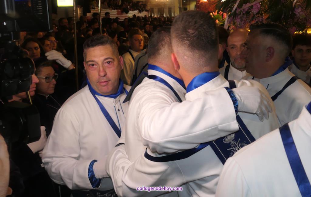 El tiempo respeta y una multitud da la bienvenida al Jesús con su madero, el cual cruza la reja de la Pescadería con el sonido de caracola que hace sonar José María Méndez, quien escasas horas antes ha participado en la procesión de Cabo de Palos.