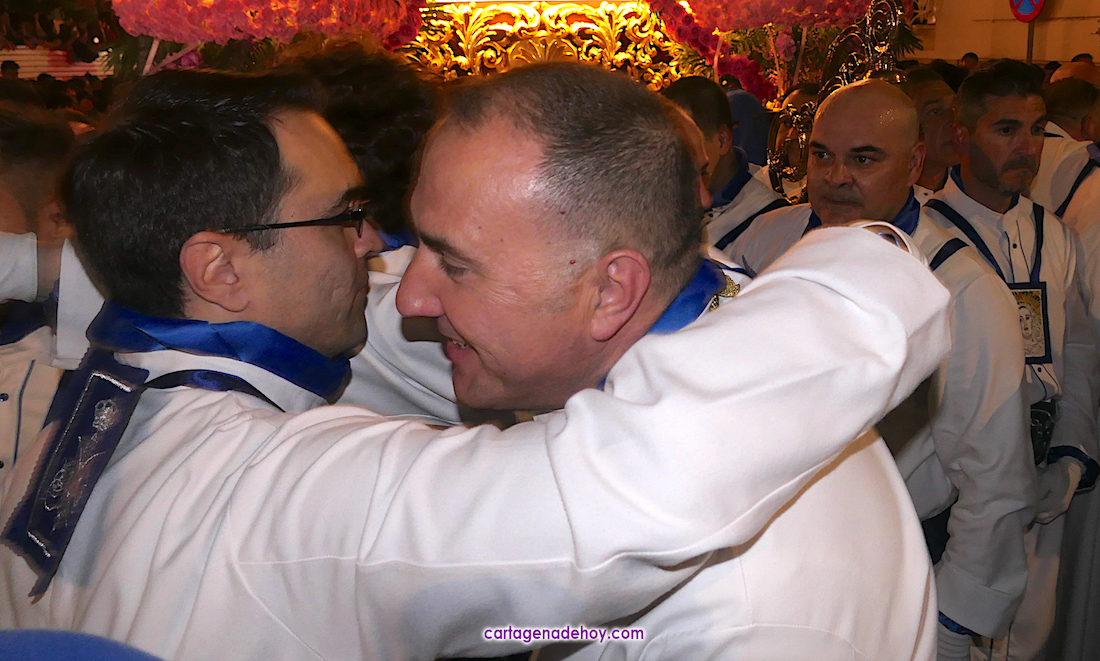 Llega el ansiado momento del ‘Encuentro’ cuando los portapasos de las puntas de las varas conectan. La inmensa multitud comienza a cantar la Salve y suena el himno de España. Cuando el júbilo parece relajarse, comienza a escucharse una de las saetas (con el jerezano Alberto Sánchez 'El Almendro' desde el balcón del Palacio Aguirre) que jalonan el recorrido de esta noche. Todo ha salido bien, como reflejan los abrazos de los portapasos.