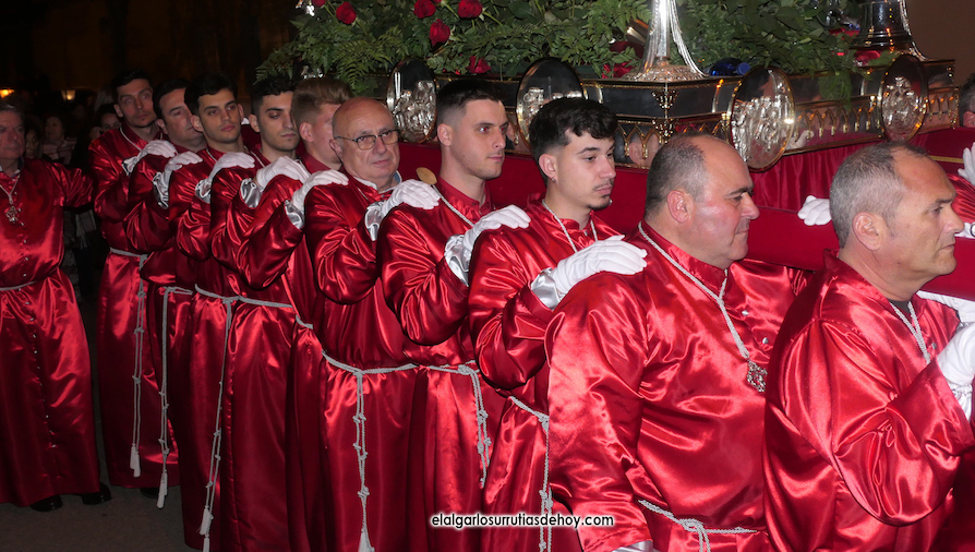 La 'Procesión del silencio' sigue subiendo de nivel con las novedades de cada edición, que en esta ocasión ha sido el estreno de los vestuarios que otorgan uniformidad a sus tres tercios, dentro de un cortejo pasionario del que se despide Anastasio Guerrero, junto a su directiva, como presidente de la Agrupación de la Semana Santa de El Algar.