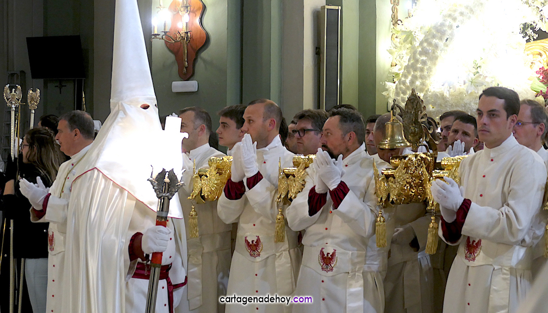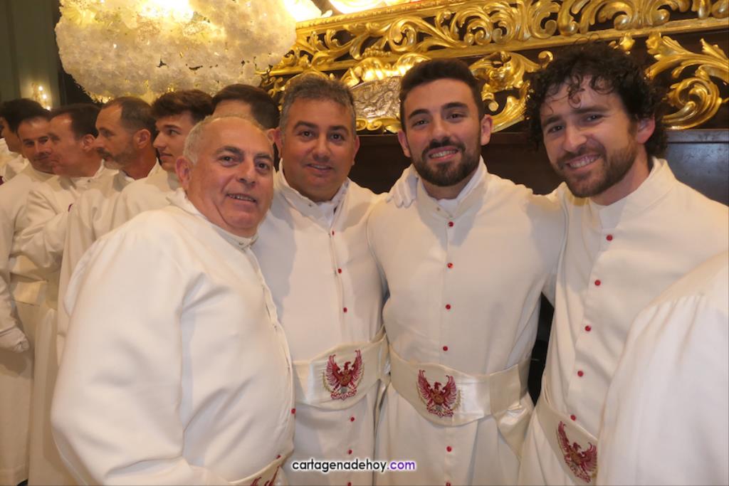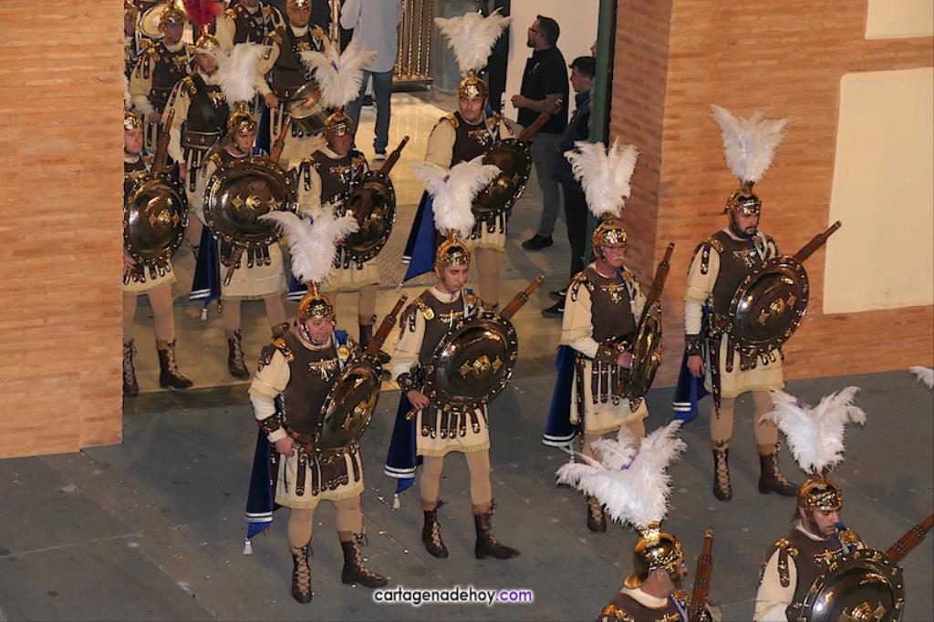 Precisamente, este año se ha cumplido el 25 aniversario de la salida en hombros de la santa, al igual que el mismo tiempo de los hachotes del tercio del Santo Cáliz que diseñó Diego Paredes. También han sido novedades la limpieza y restauración de las cubre faldetas del trono del Nazareno y las plumas blancas en los cascos de escuadras y oficiales de los romanos.