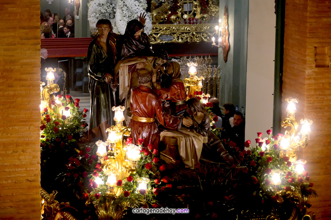 El hijo de Dios morirá como humano y será bajado de la cruz (Descendimiento) y entregado a su madre (Virgen de la Piedad), para más tarde ser enterrado (Santo Enterramiento), siendo visto a continuación yacente (Santo Sepulcro), que es la imagen que preside esta procesión. María Magdalena, San Juan y Virgen de la Soledad muestran el dolor en los siguientes tronos, que son los que cierran.