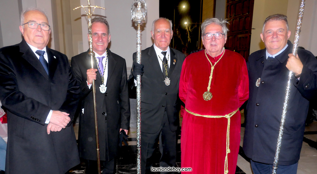 Pepe Castillo (informador taurino), Matías Barco (presidente de la Asociación 'Cartagena por la Caridad), José Felipe Rubio (presidente de la Asociación Canónica del Cristo de la Divina Misericordia), José Cortado (hermano mayor de la Cofradía del Cristo de los Mineros) y León García (vicepresidente de la Asociación Canónica del Cristo de la Divina Misericordia) tras la 'Procesión del Cristo de los Mineros' de La Unión.