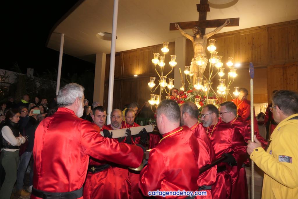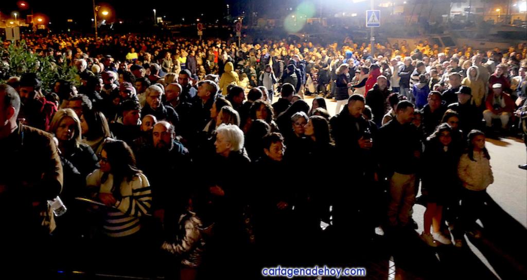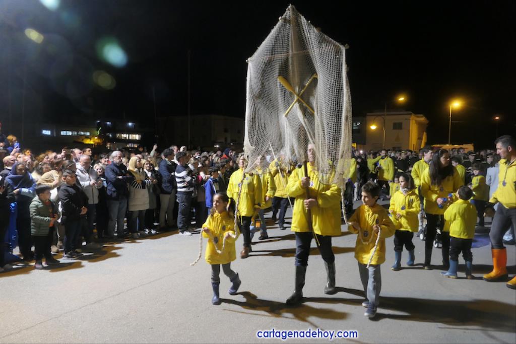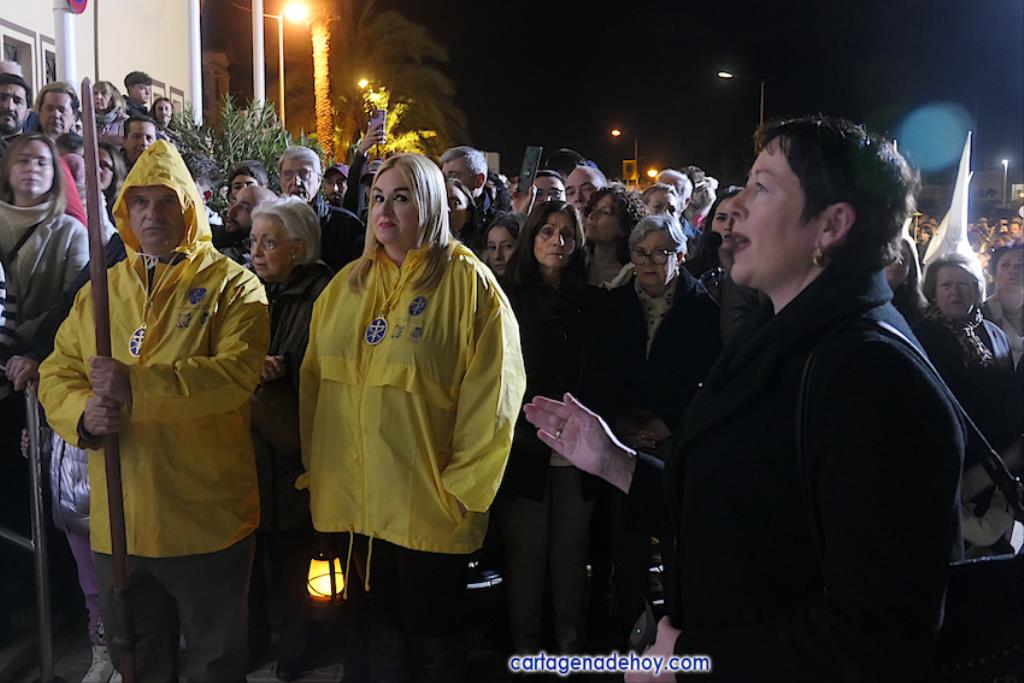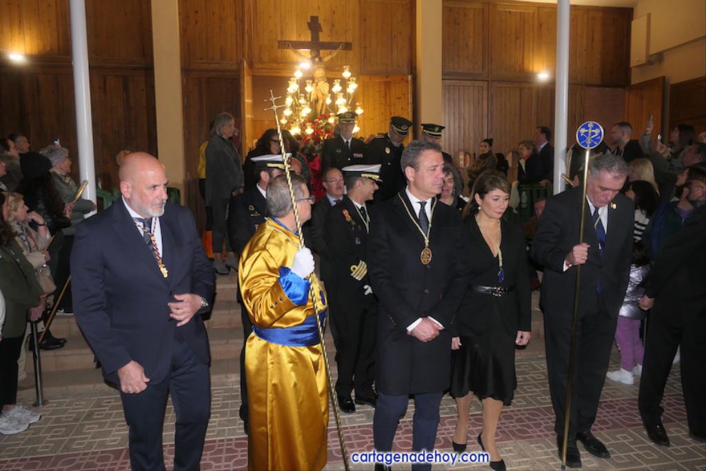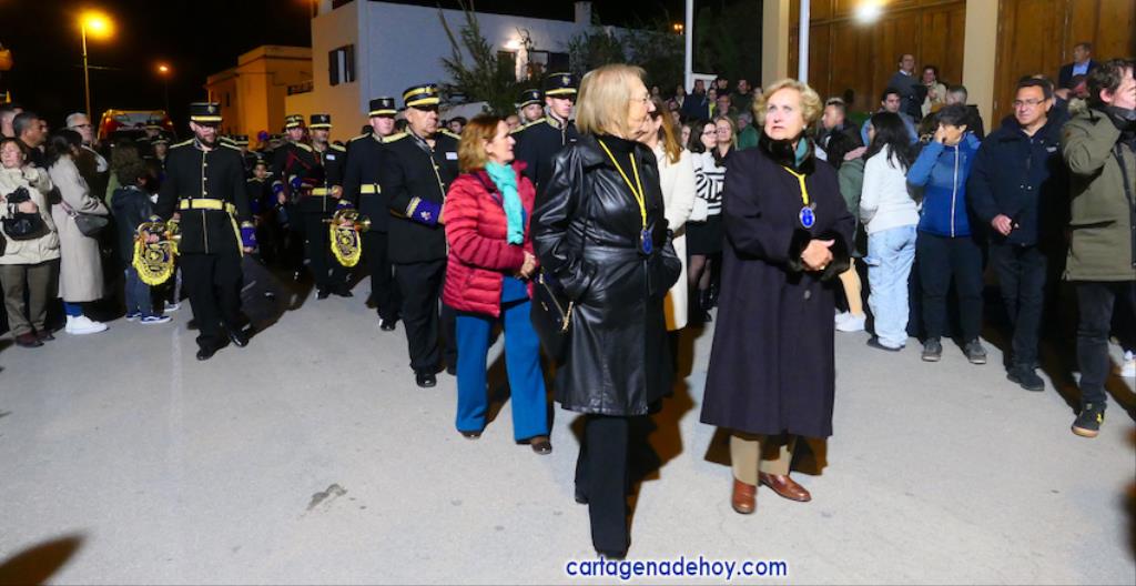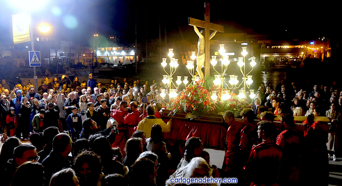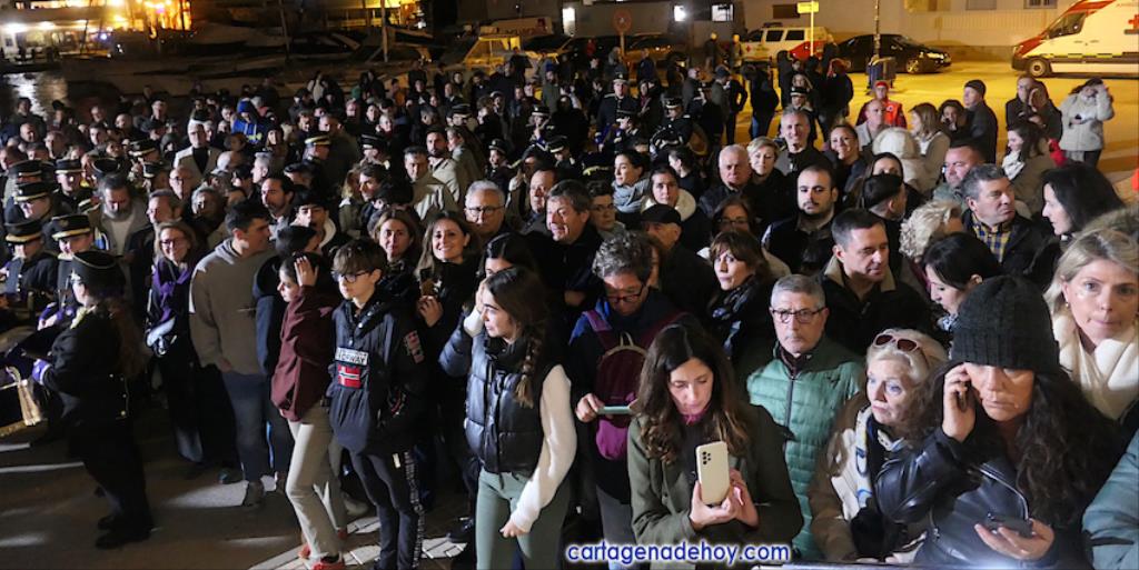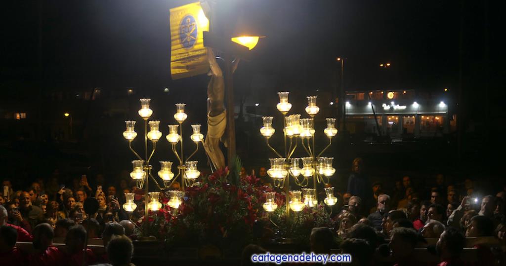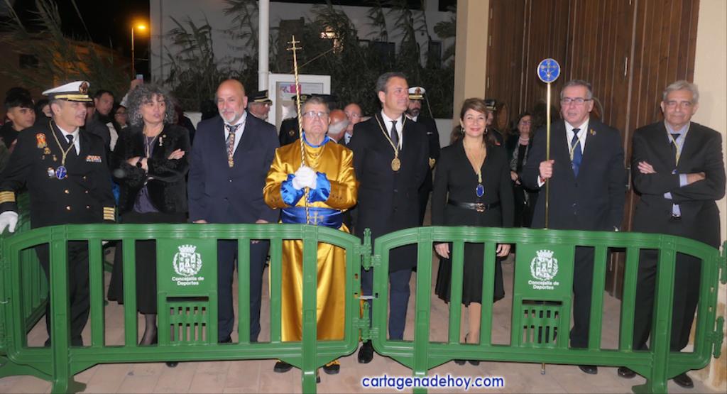 Es la noche de la muerte de Jesucristo, en este caso como Cristo de los Pescadores, quien cruza el pórtico de la iglesia a continuación, situándose por delante el protocolo con el hermano mayor, Pedro Solano; el pregonero de este año, Gonzalo Wandosell; la rectora de la UPCT, Beatriz Miguel; los ediles Cristina Mora y López Pretel, el consejero antes aludido y representantes militares de Marina.