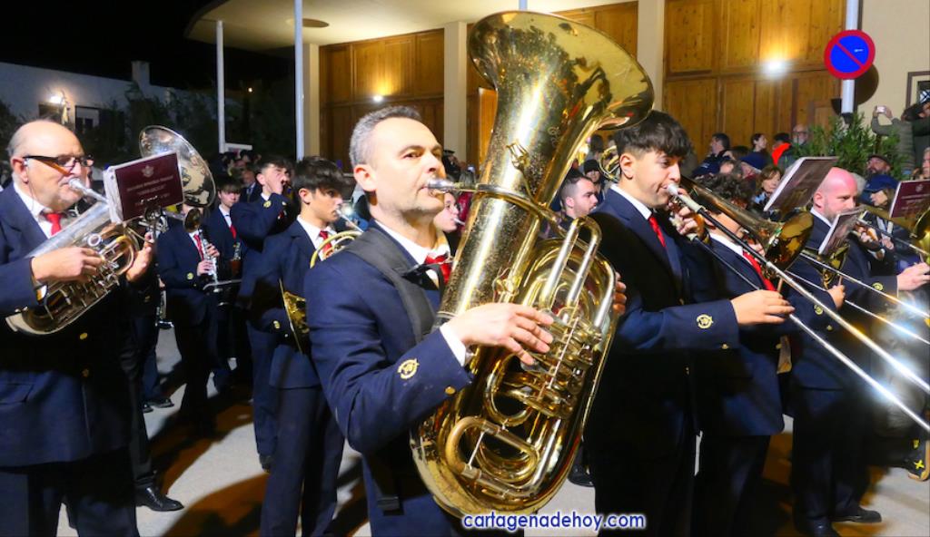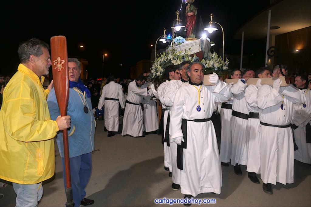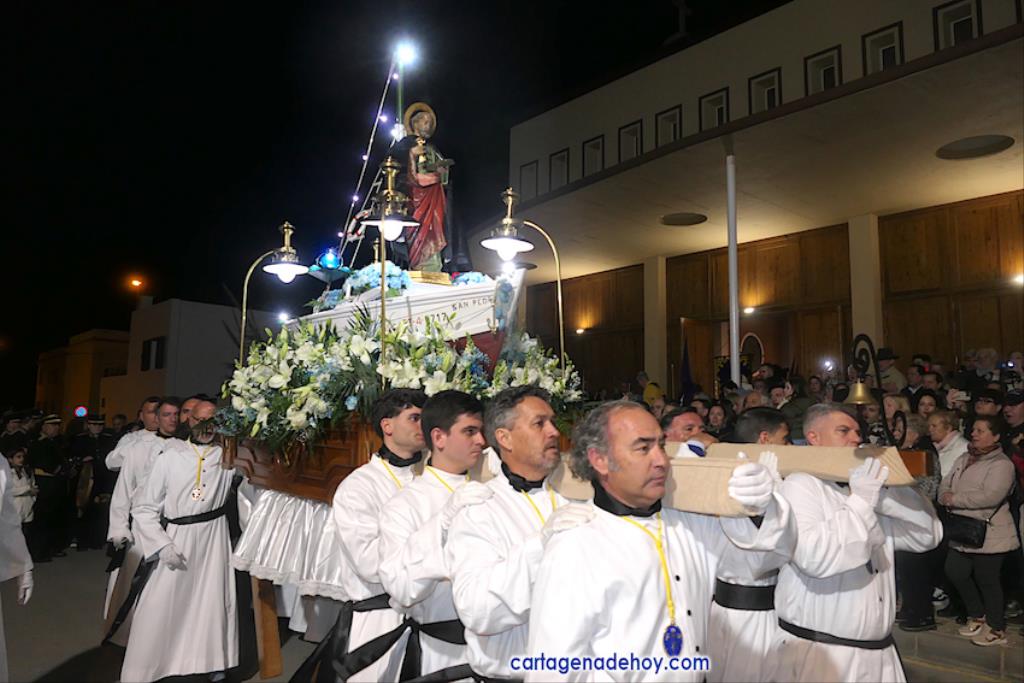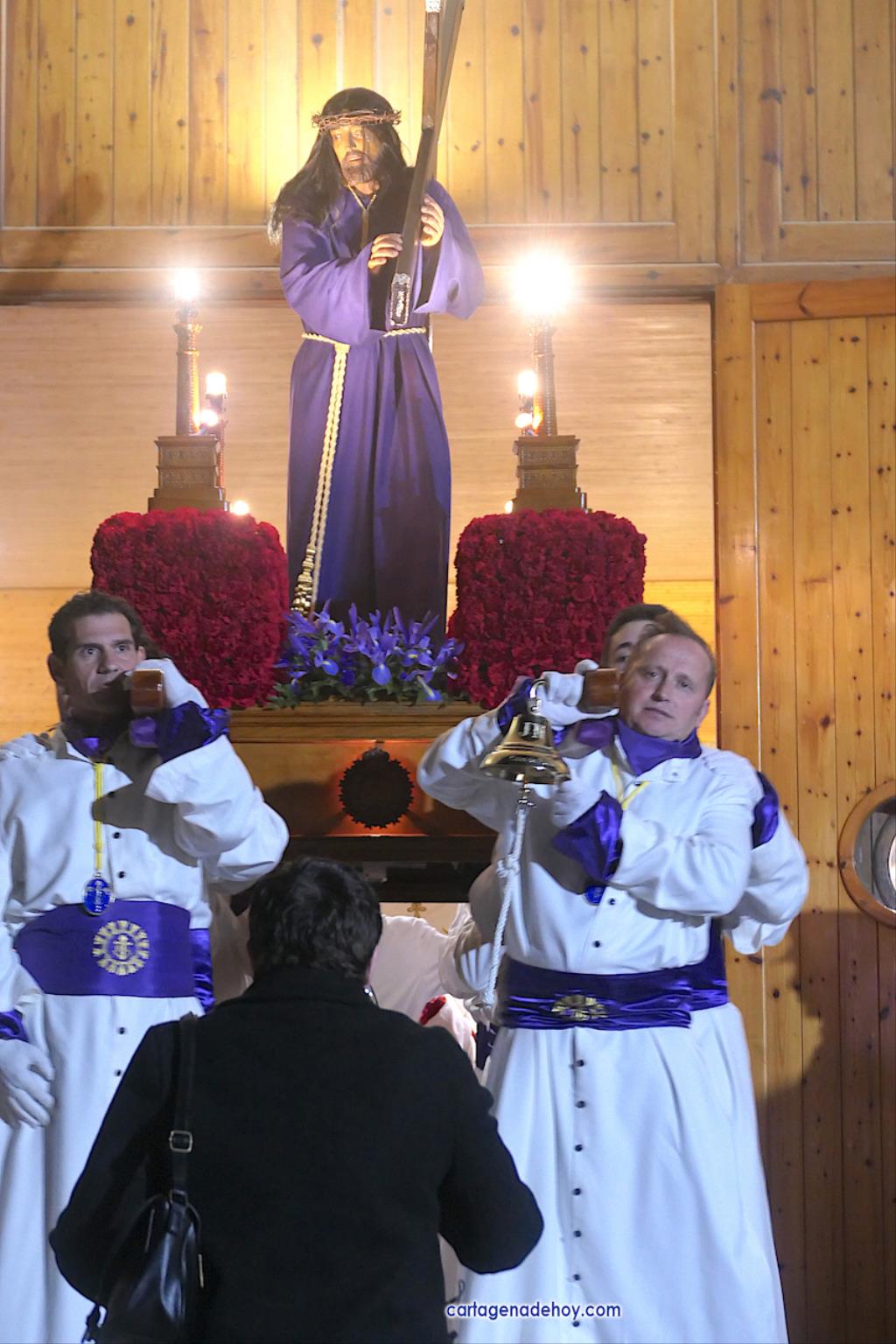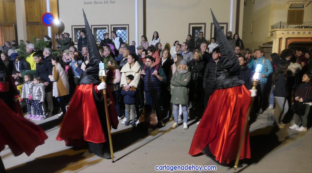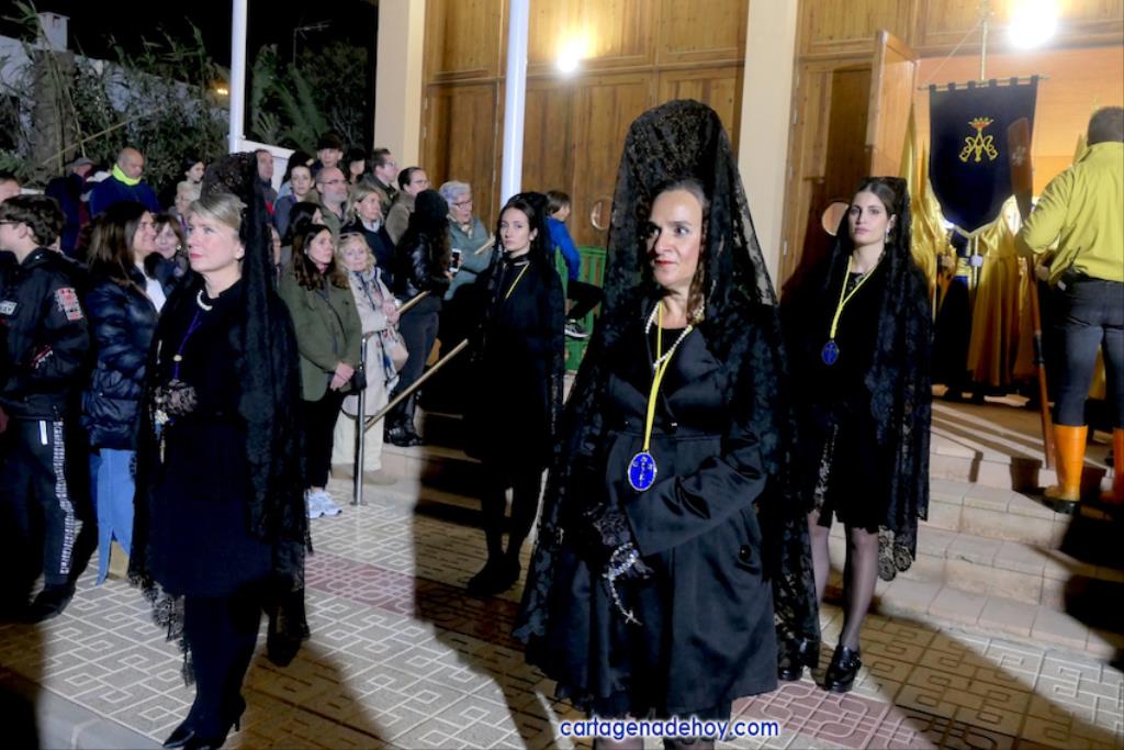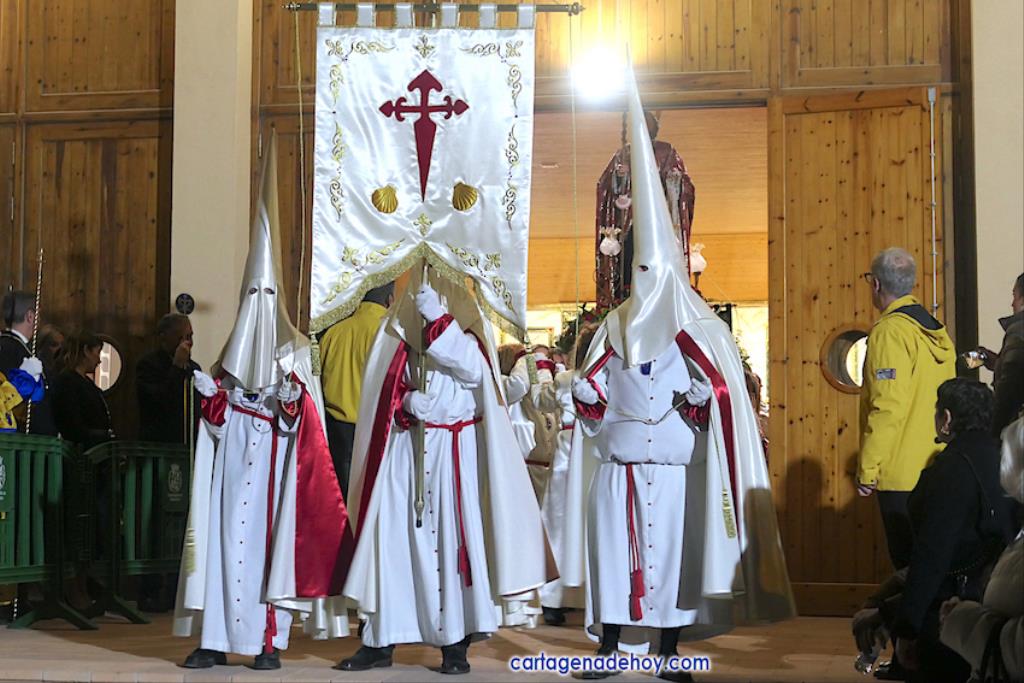 Es la noche de la muerte de Jesucristo, en este caso como Cristo de los Pescadores, quien cruza el pórtico de la iglesia a continuación, situándose por delante el protocolo con el hermano mayor, Pedro Solano; el pregonero de este año, Gonzalo Wandosell; la rectora de la UPCT, Beatriz Miguel; los ediles Cristina Mora y López Pretel, el consejero antes aludido y representantes militares de Marina.