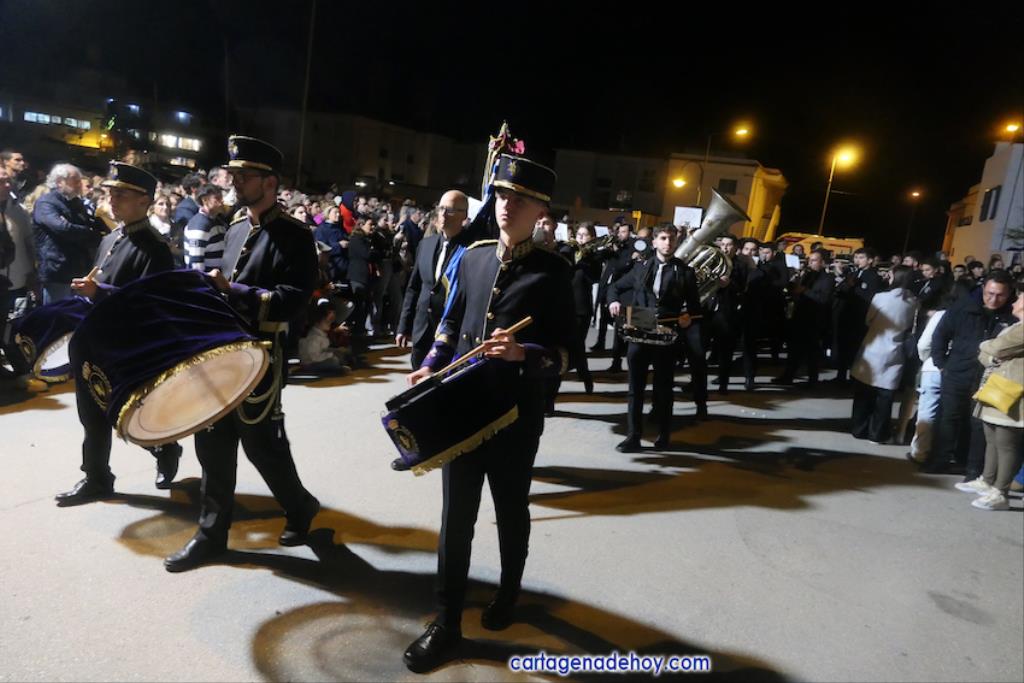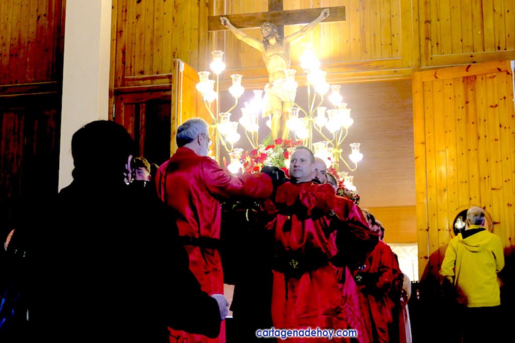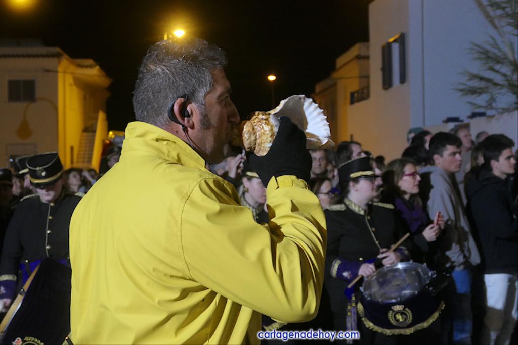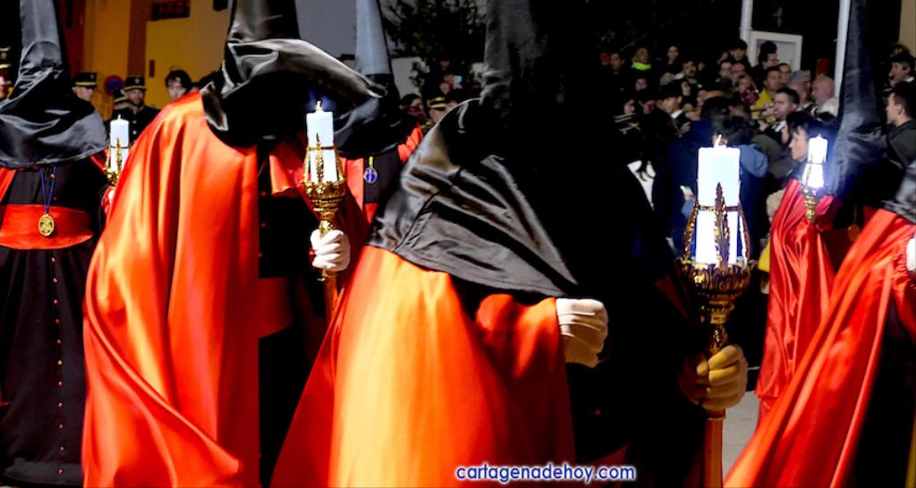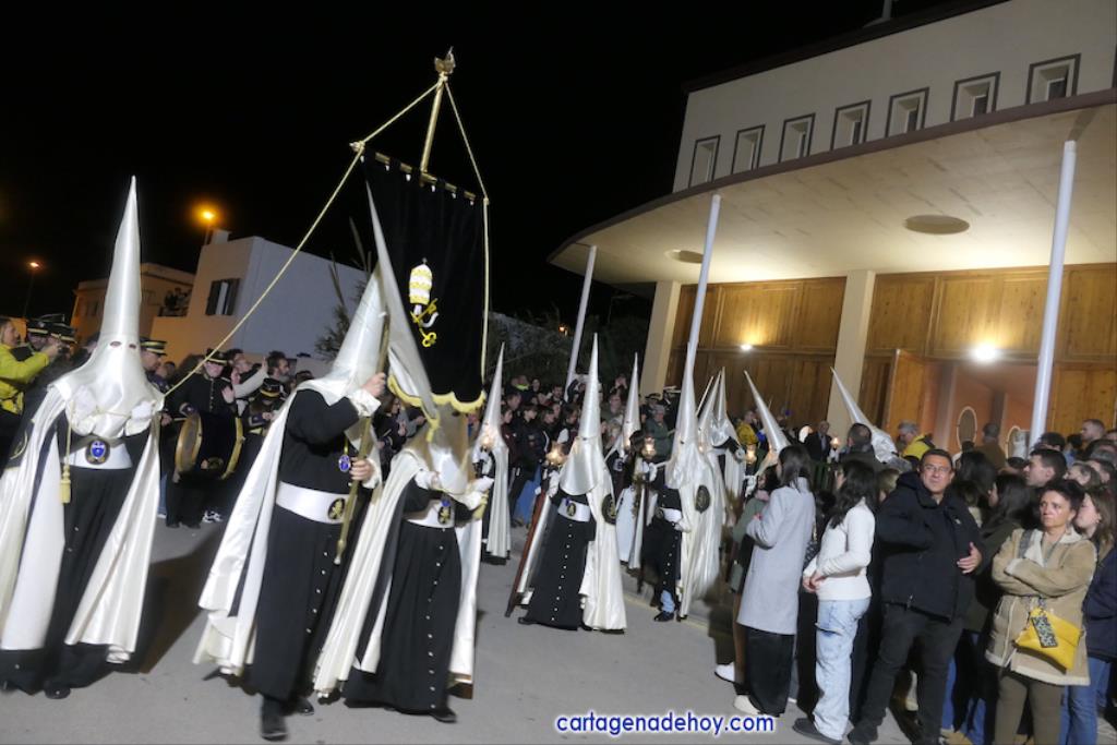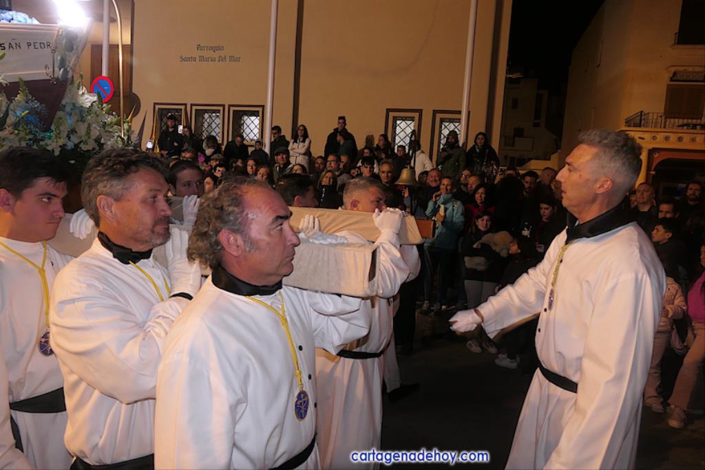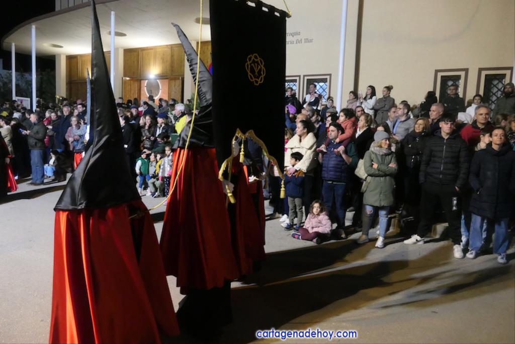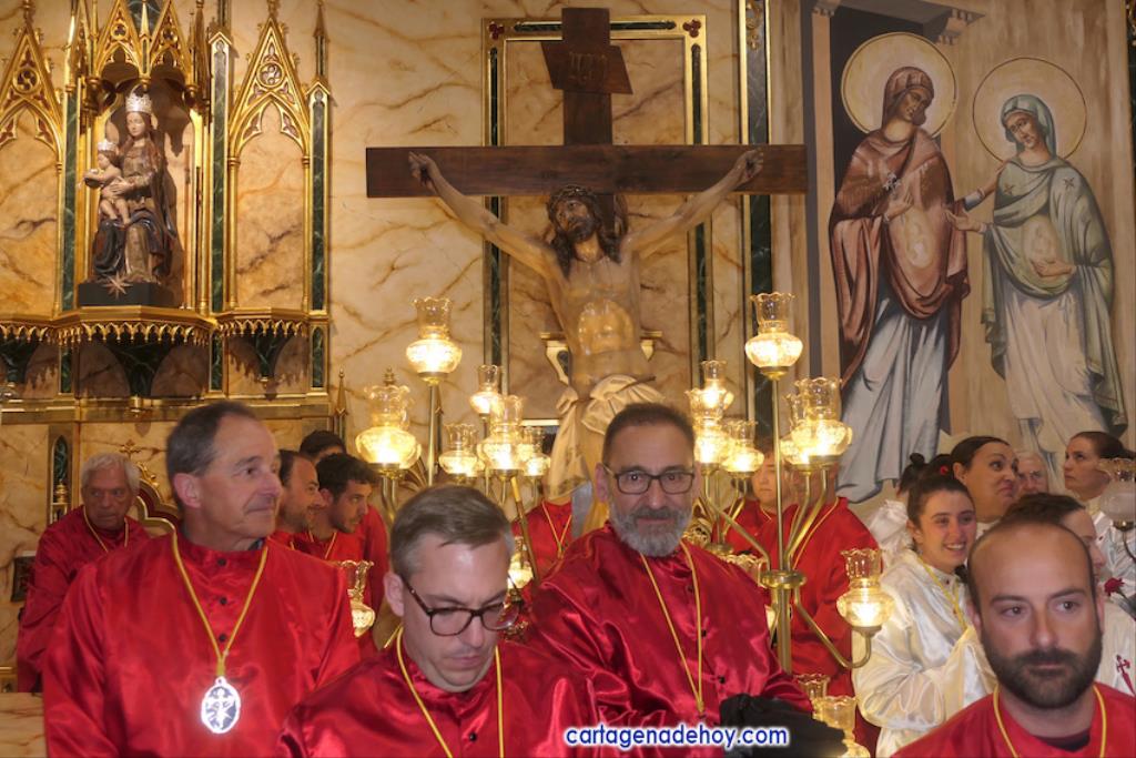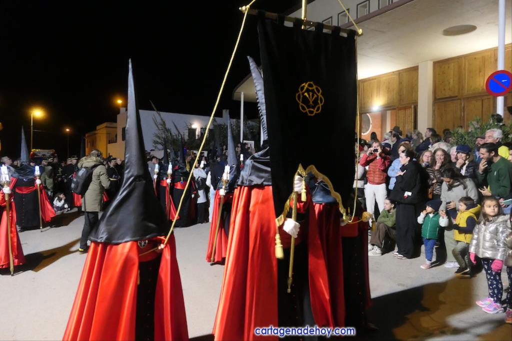 Es la noche de la muerte de Jesucristo, en este caso como Cristo de los Pescadores, quien cruza el pórtico de la iglesia a continuación, situándose por delante el protocolo con el hermano mayor, Pedro Solano; el pregonero de este año, Gonzalo Wandosell; la rectora de la UPCT, Beatriz Miguel; los ediles Cristina Mora y López Pretel, el consejero antes aludido y representantes militares de Marina.