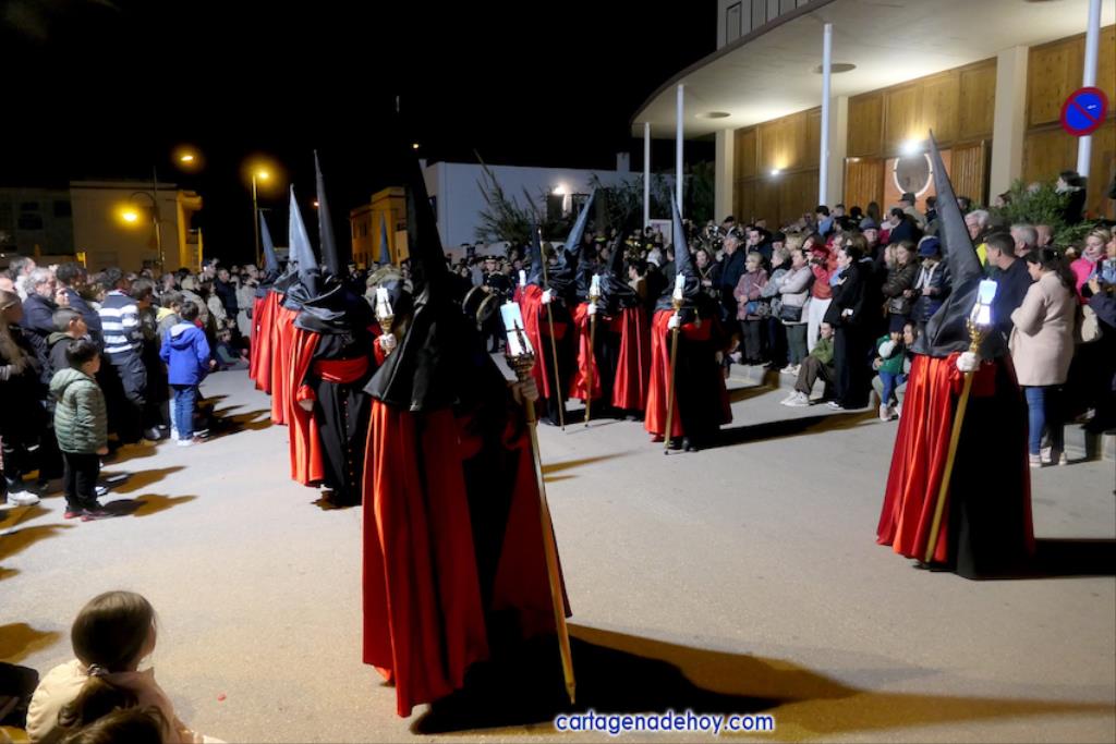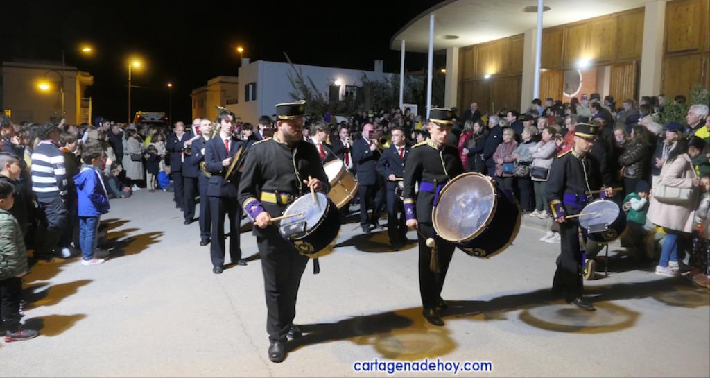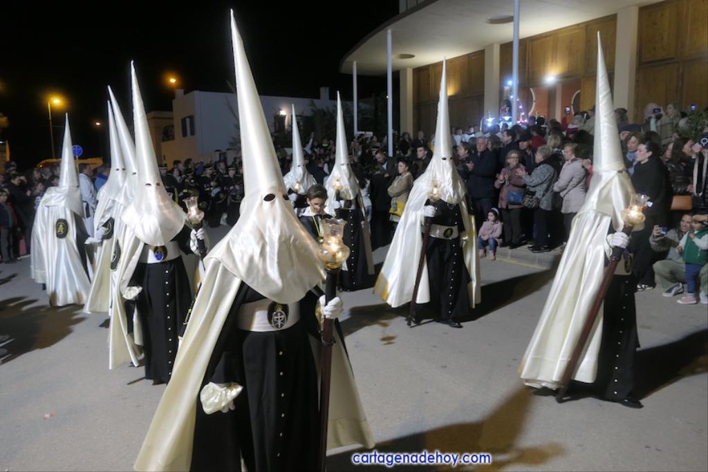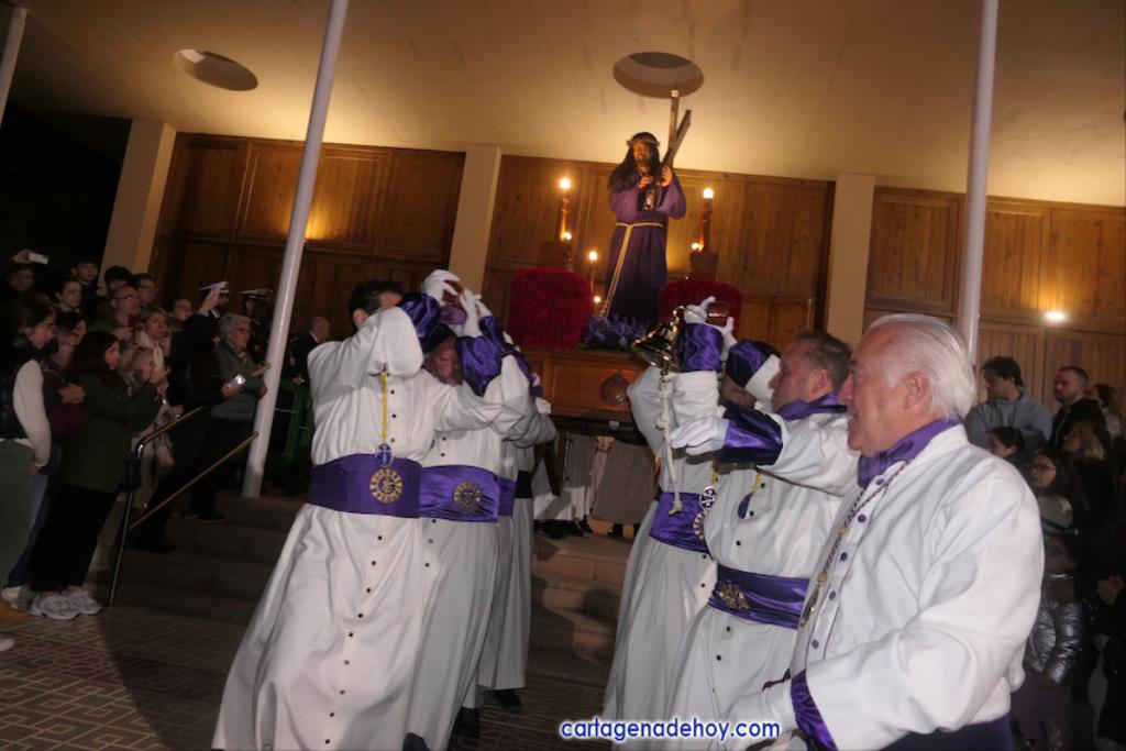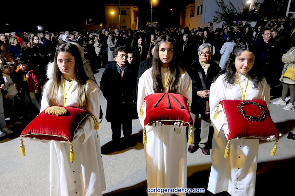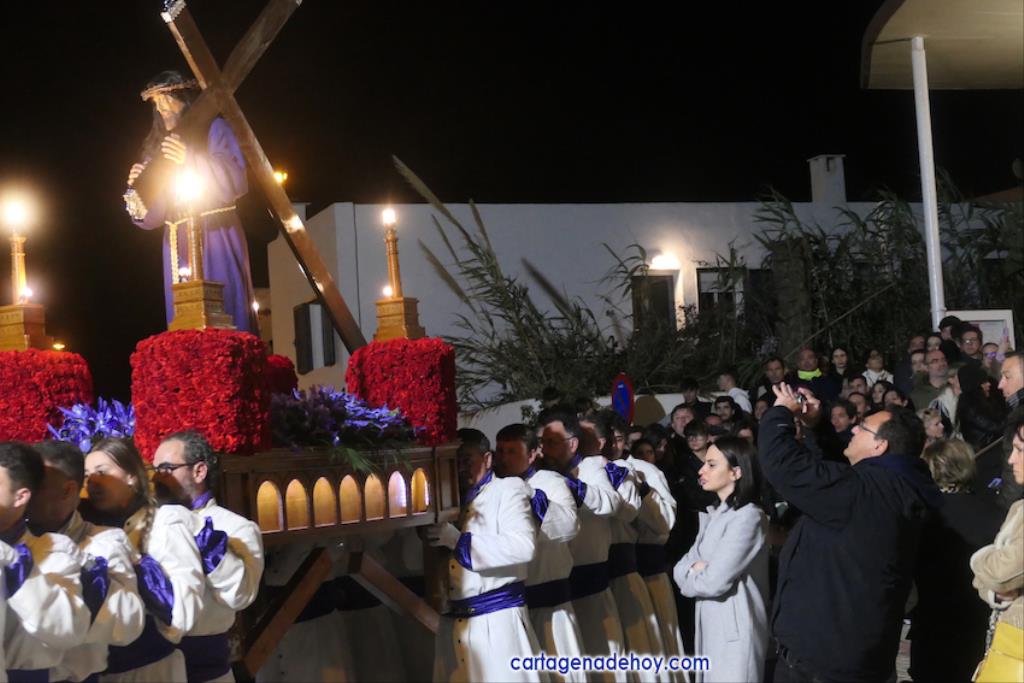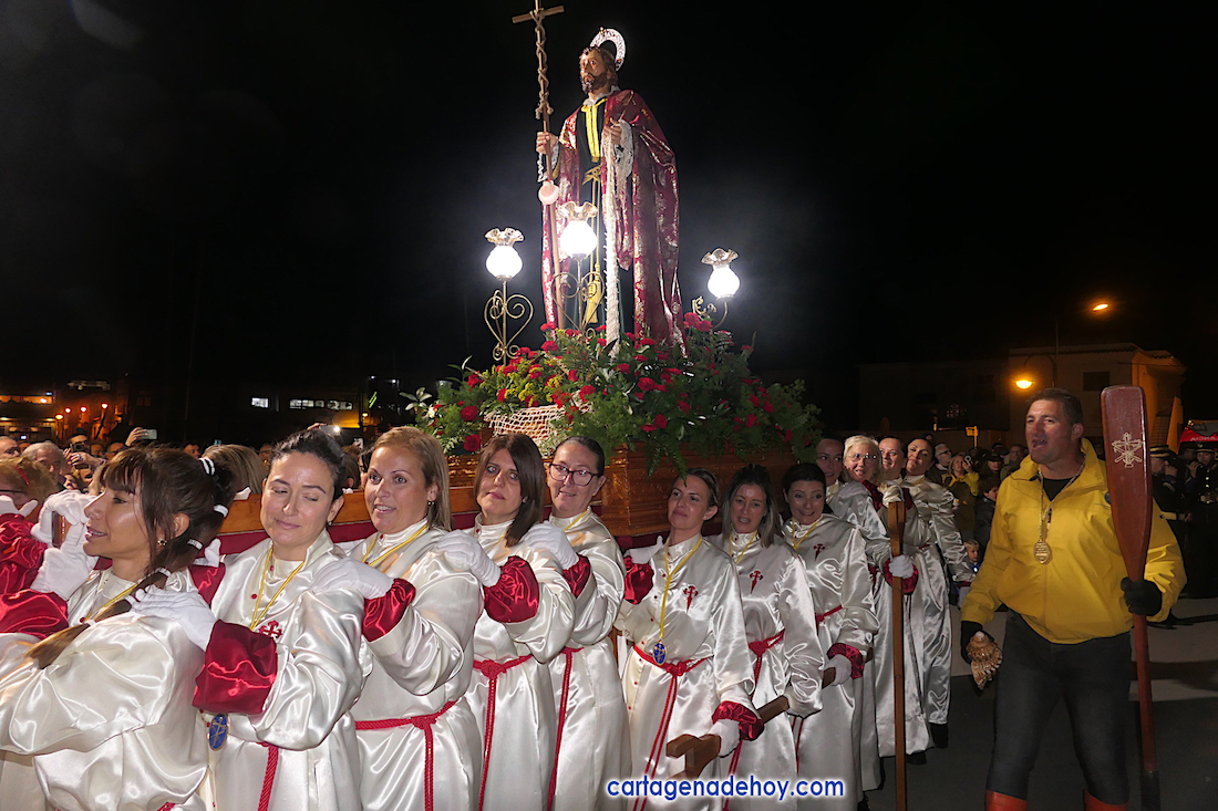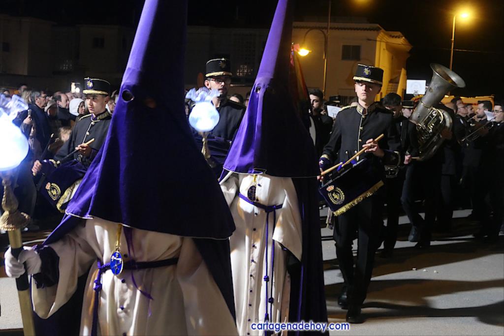 Es la noche de la muerte de Jesucristo, en este caso como Cristo de los Pescadores, quien cruza el pórtico de la iglesia a continuación, situándose por delante el protocolo con el hermano mayor, Pedro Solano; el pregonero de este año, Gonzalo Wandosell; la rectora de la UPCT, Beatriz Miguel; los ediles Cristina Mora y López Pretel, el consejero antes aludido y representantes militares de Marina.