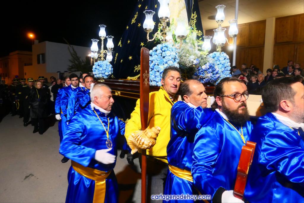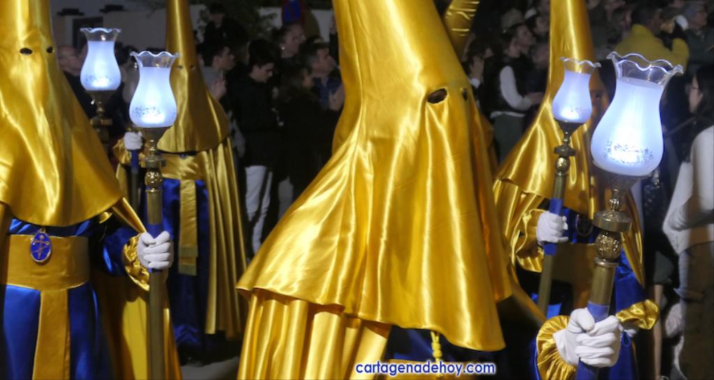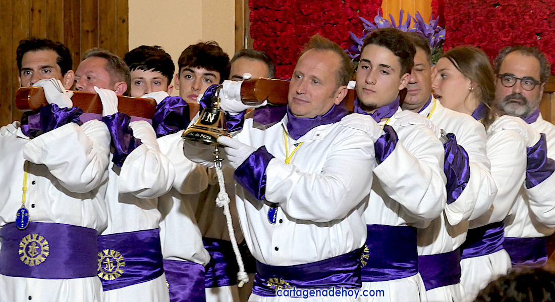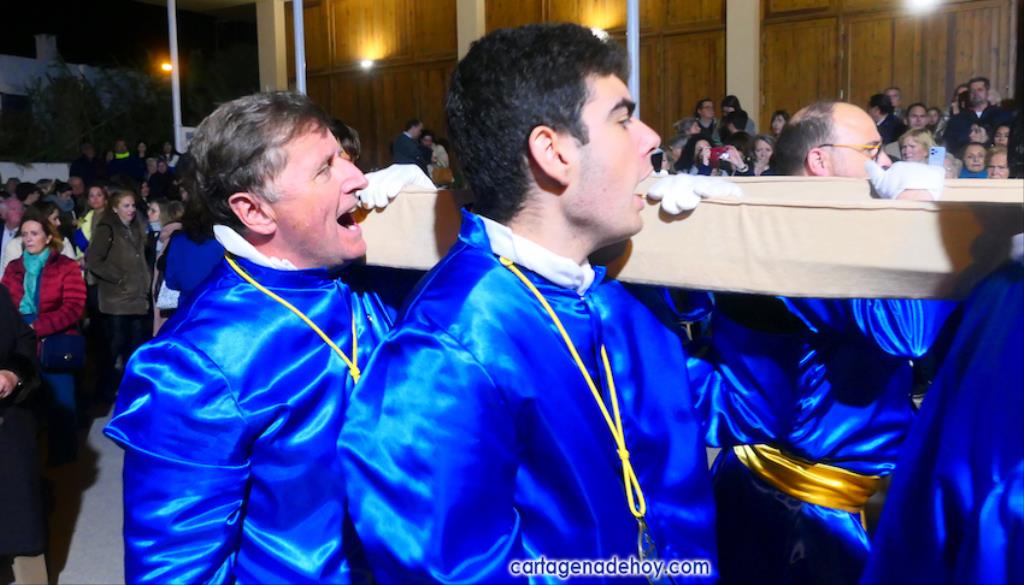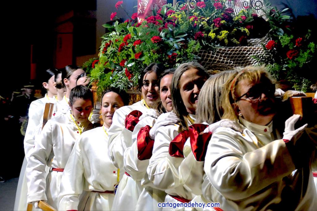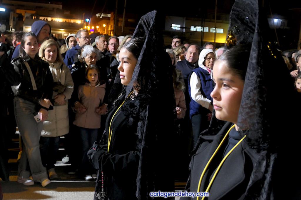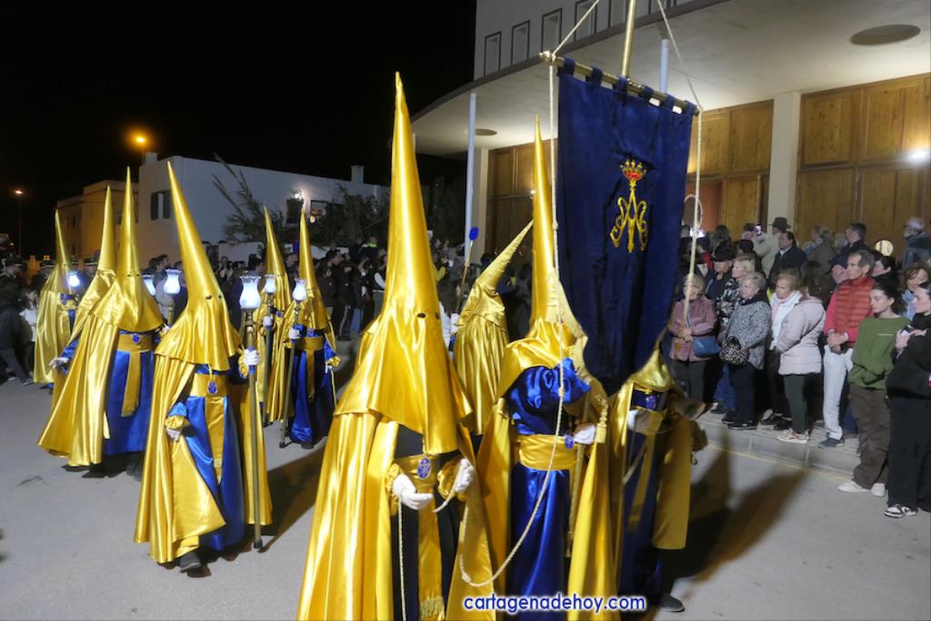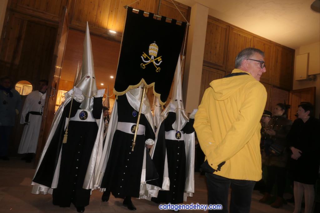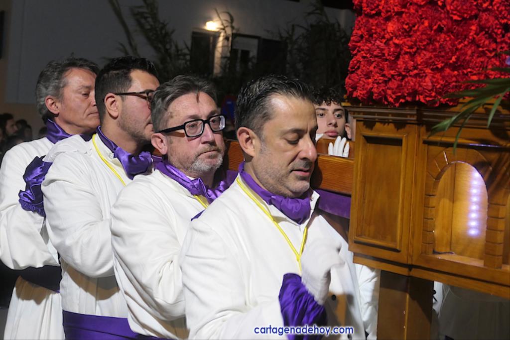 Es la noche de la muerte de Jesucristo, en este caso como Cristo de los Pescadores, quien cruza el pórtico de la iglesia a continuación, situándose por delante el protocolo con el hermano mayor, Pedro Solano; el pregonero de este año, Gonzalo Wandosell; la rectora de la UPCT, Beatriz Miguel; los ediles Cristina Mora y López Pretel, el consejero antes aludido y representantes militares de Marina.