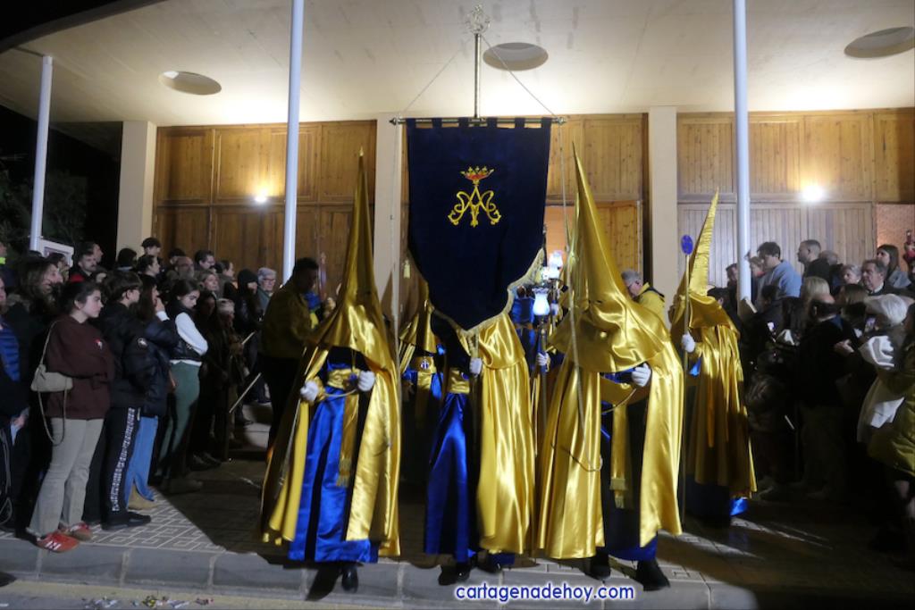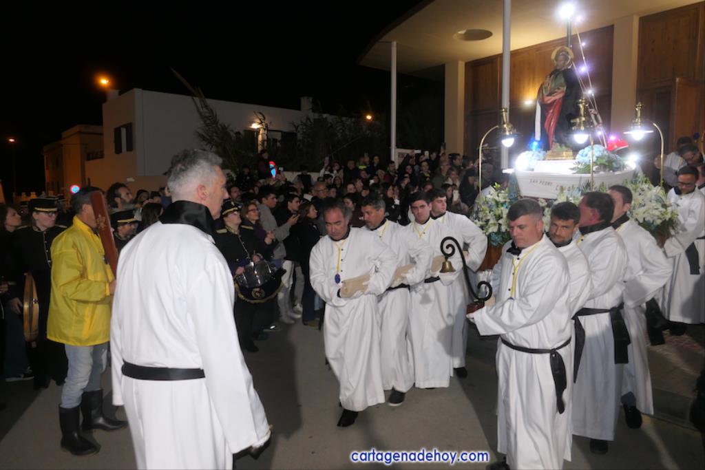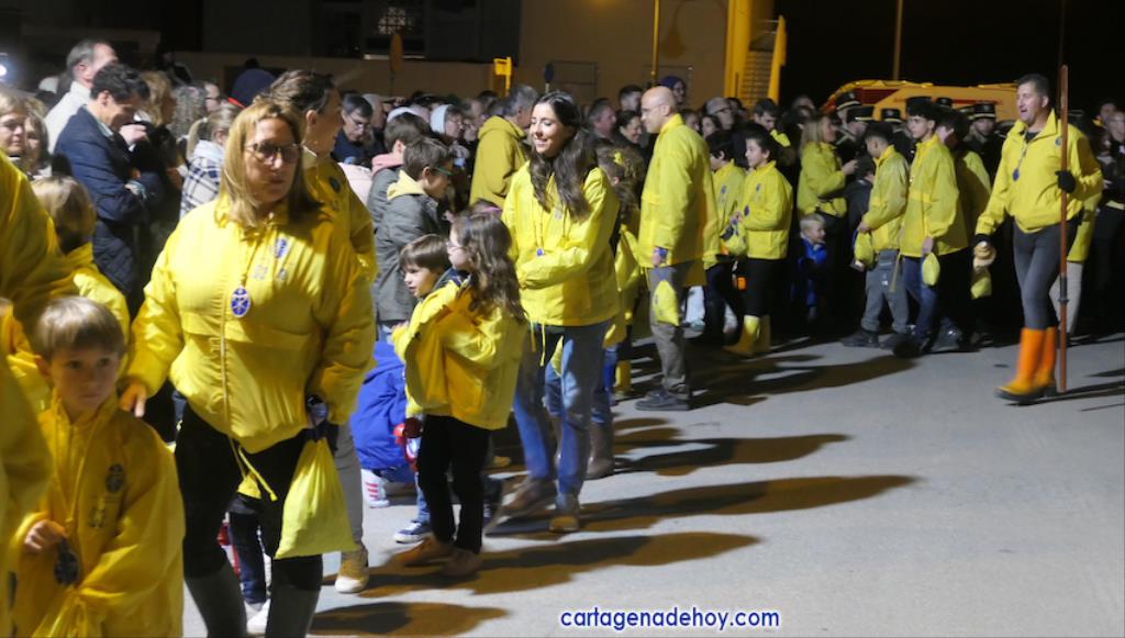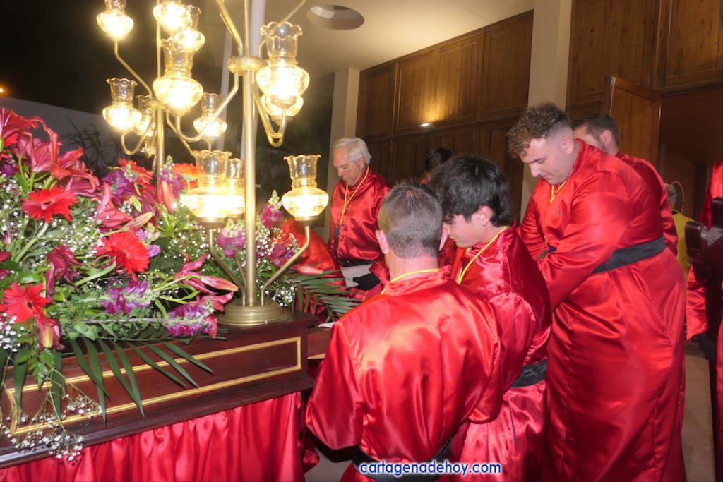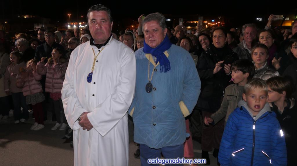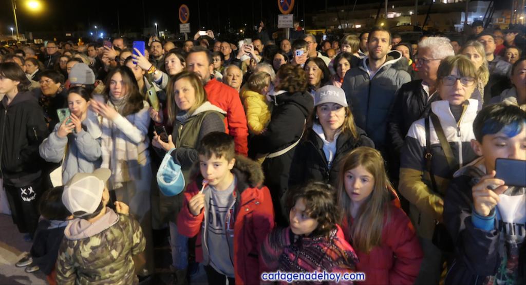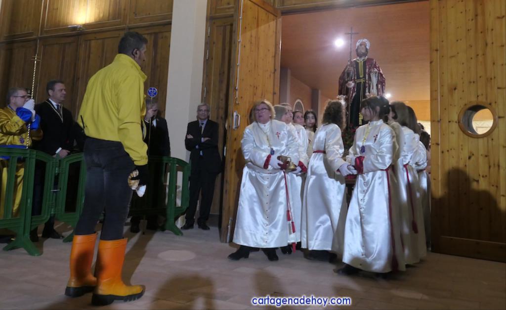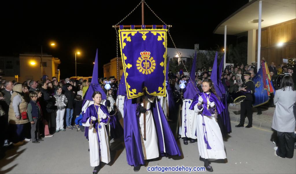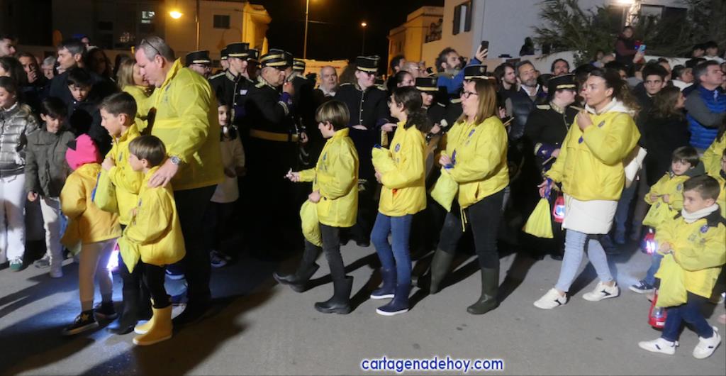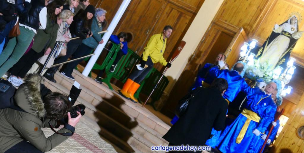 Es la noche de la muerte de Jesucristo, en este caso como Cristo de los Pescadores, quien cruza el pórtico de la iglesia a continuación, situándose por delante el protocolo con el hermano mayor, Pedro Solano; el pregonero de este año, Gonzalo Wandosell; la rectora de la UPCT, Beatriz Miguel; los ediles Cristina Mora y López Pretel, el consejero antes aludido y representantes militares de Marina.