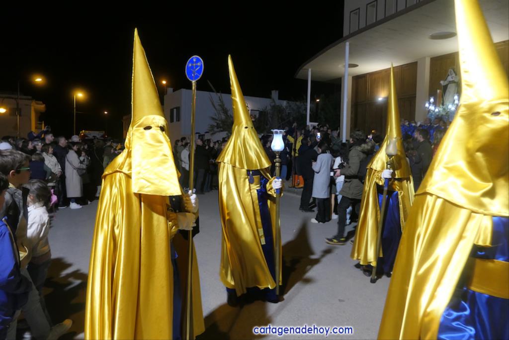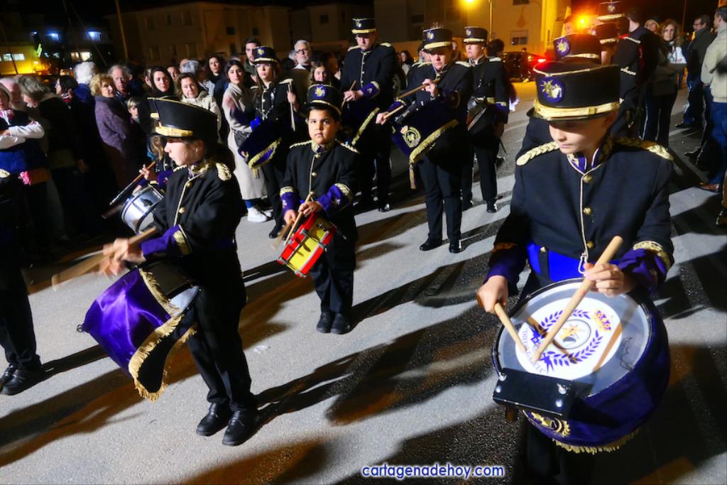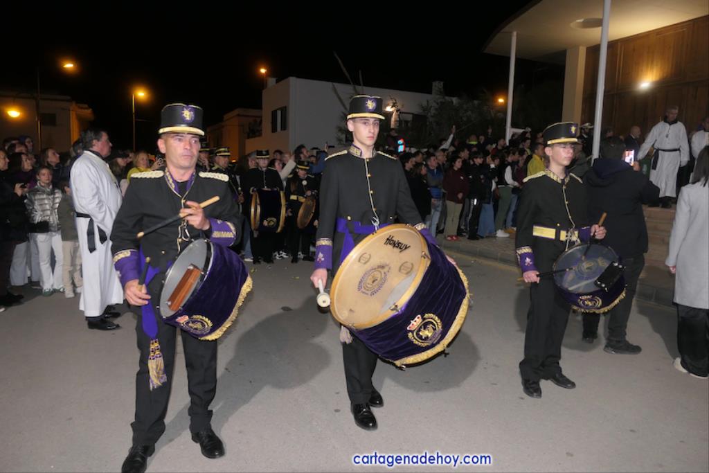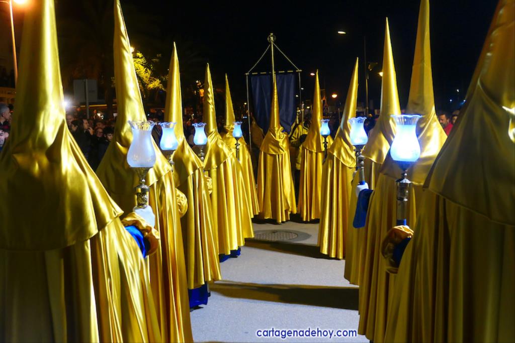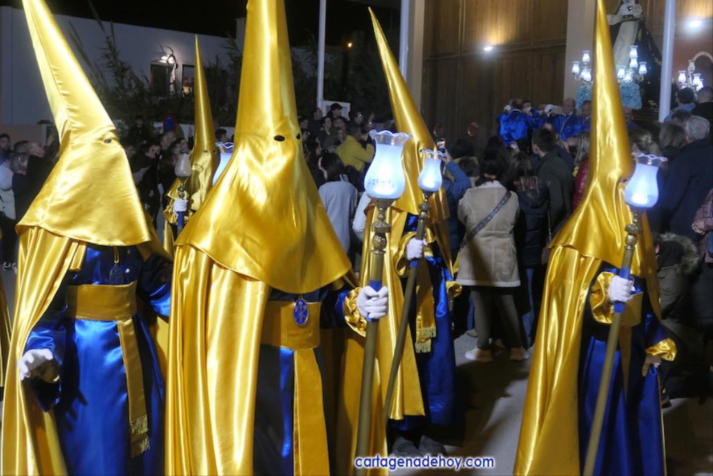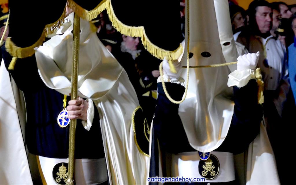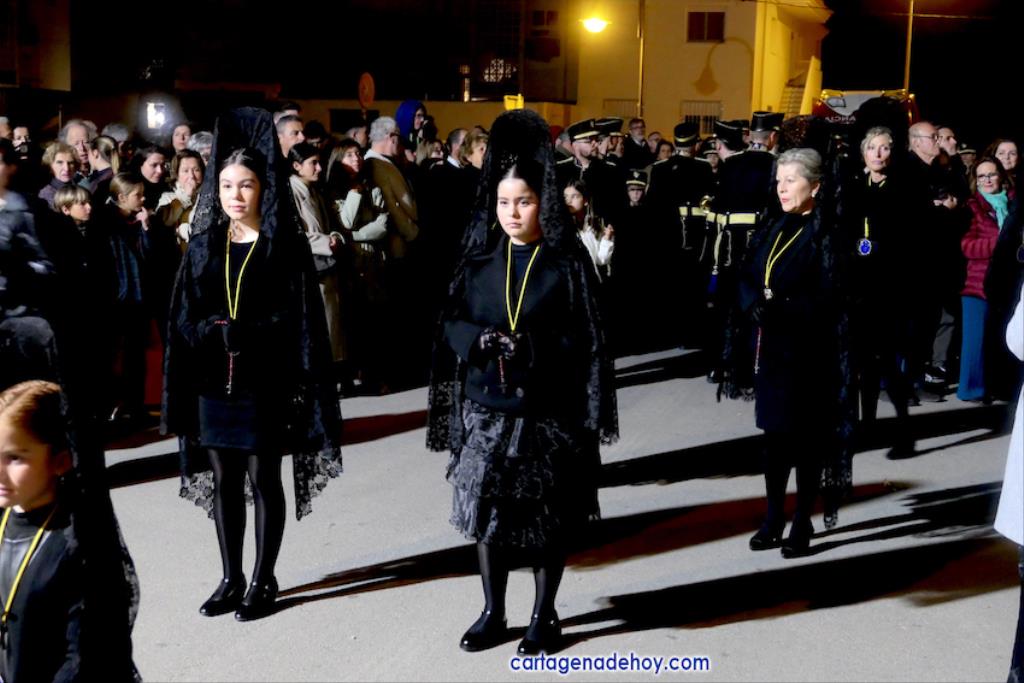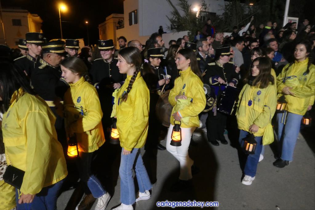 Es la noche de la muerte de Jesucristo, en este caso como Cristo de los Pescadores, quien cruza el pórtico de la iglesia a continuación, situándose por delante el protocolo con el hermano mayor, Pedro Solano; el pregonero de este año, Gonzalo Wandosell; la rectora de la UPCT, Beatriz Miguel; los ediles Cristina Mora y López Pretel, el consejero antes aludido y representantes militares de Marina.