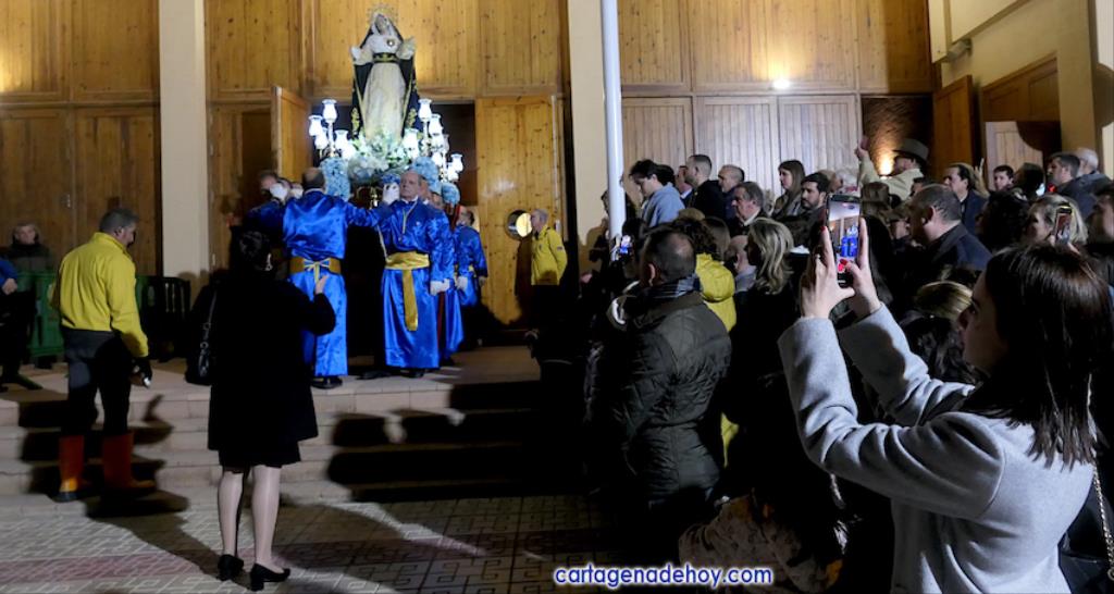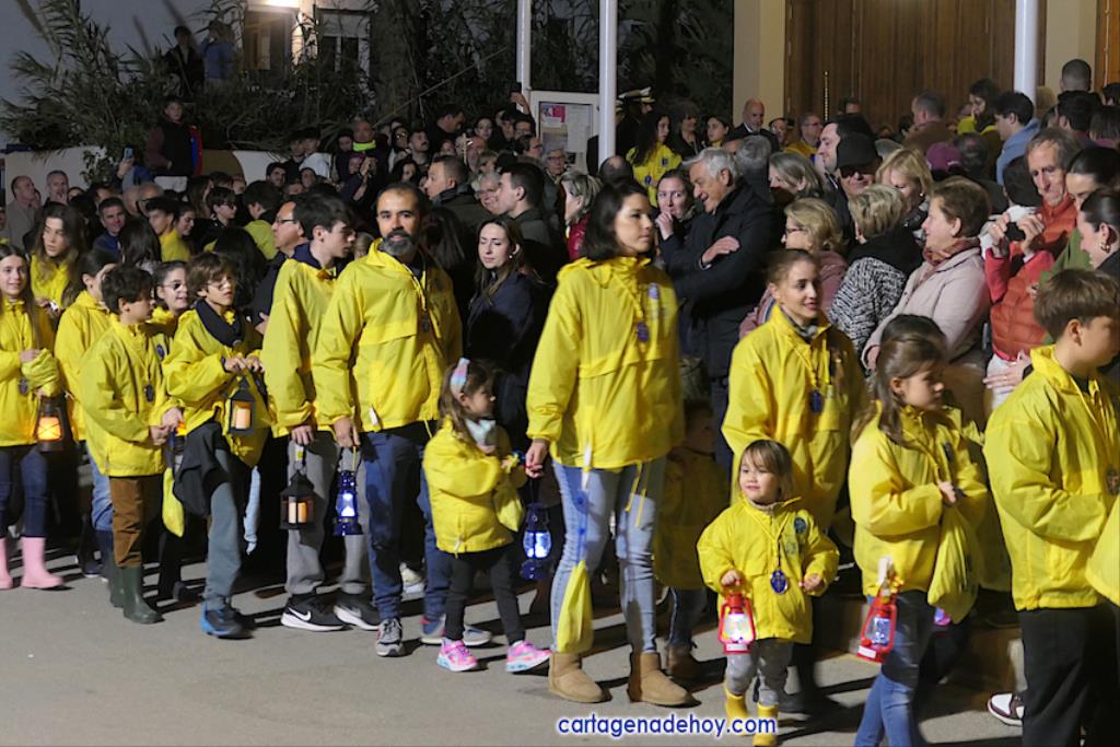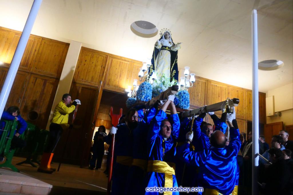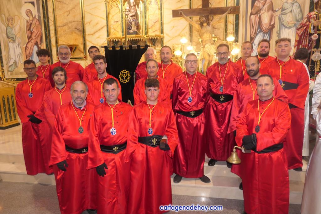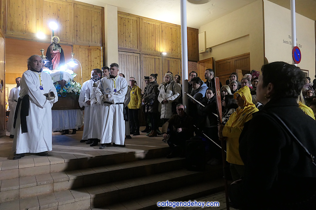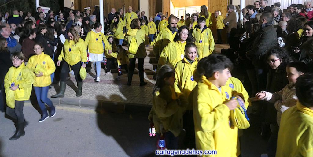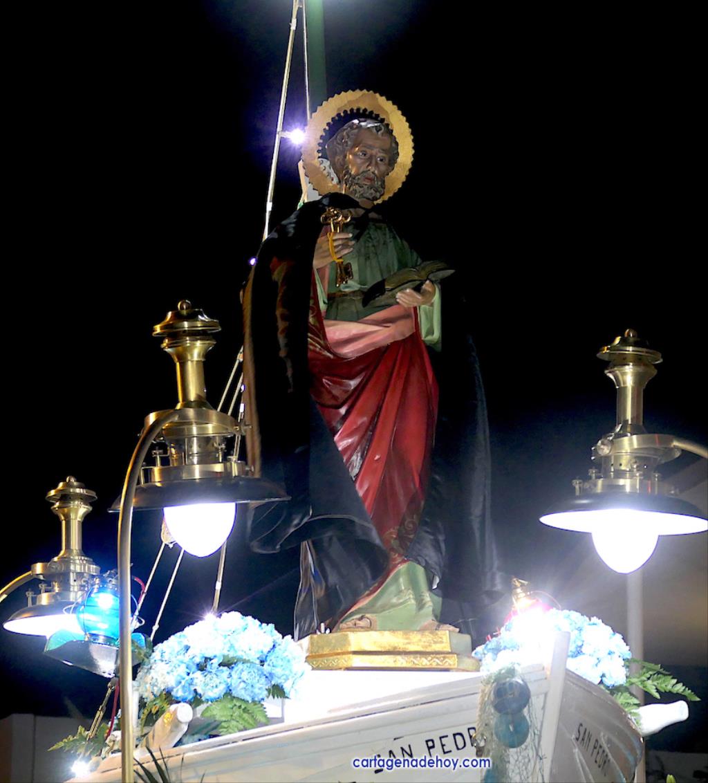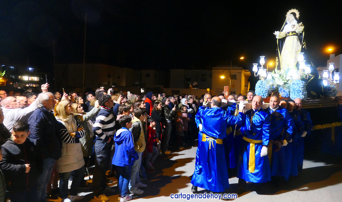 Es la noche de la muerte de Jesucristo, en este caso como Cristo de los Pescadores, quien cruza el pórtico de la iglesia a continuación, situándose por delante el protocolo con el hermano mayor, Pedro Solano; el pregonero de este año, Gonzalo Wandosell; la rectora de la UPCT, Beatriz Miguel; los ediles Cristina Mora y López Pretel, el consejero antes aludido y representantes militares de Marina.