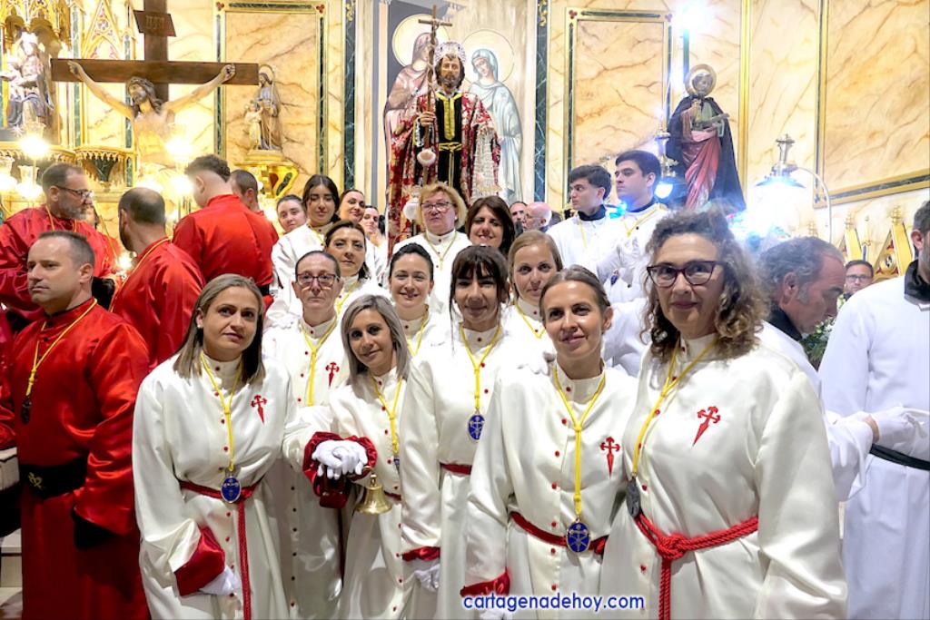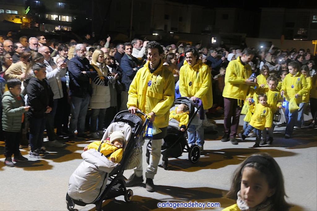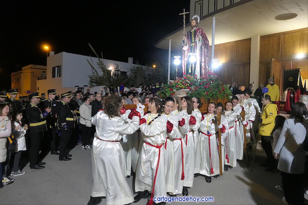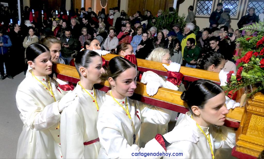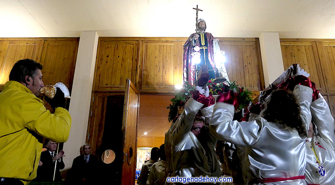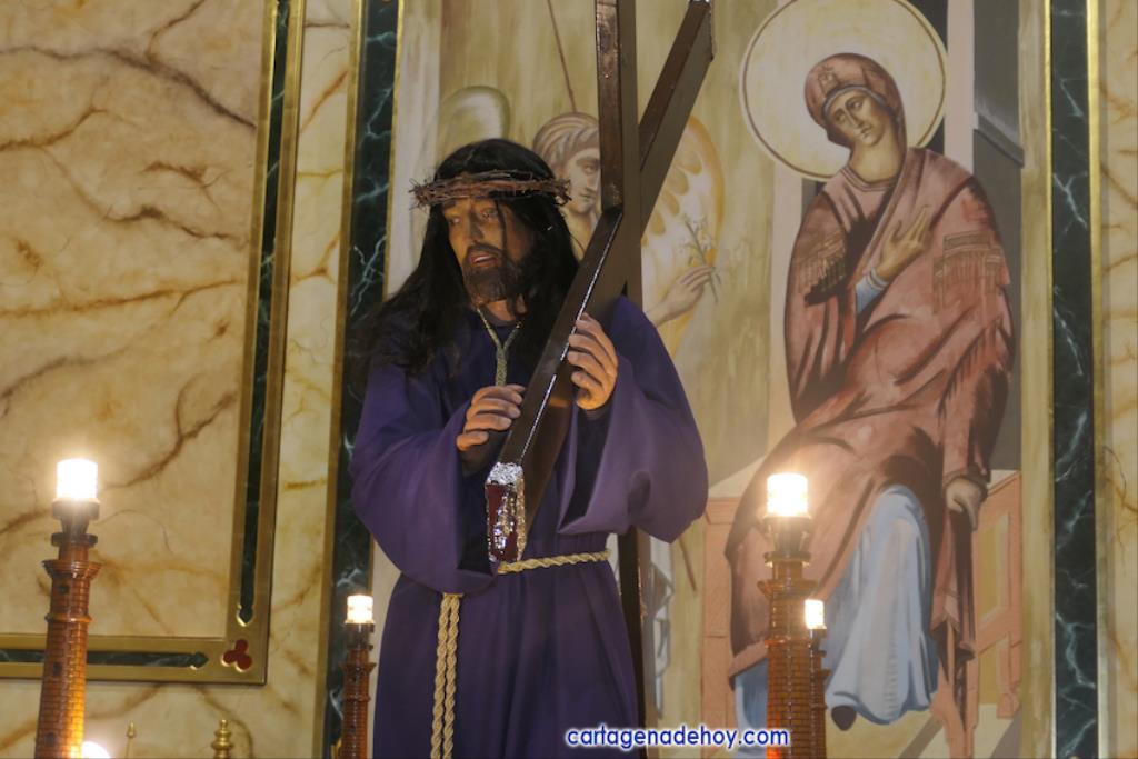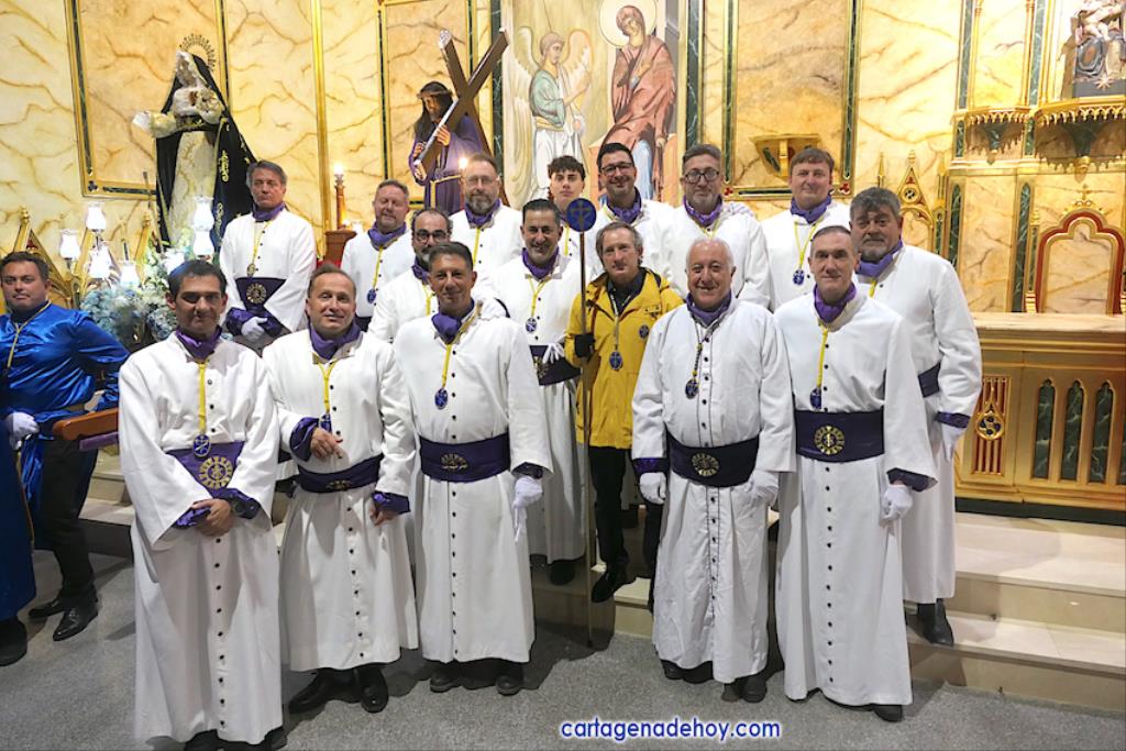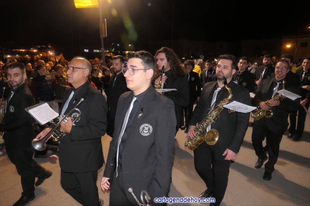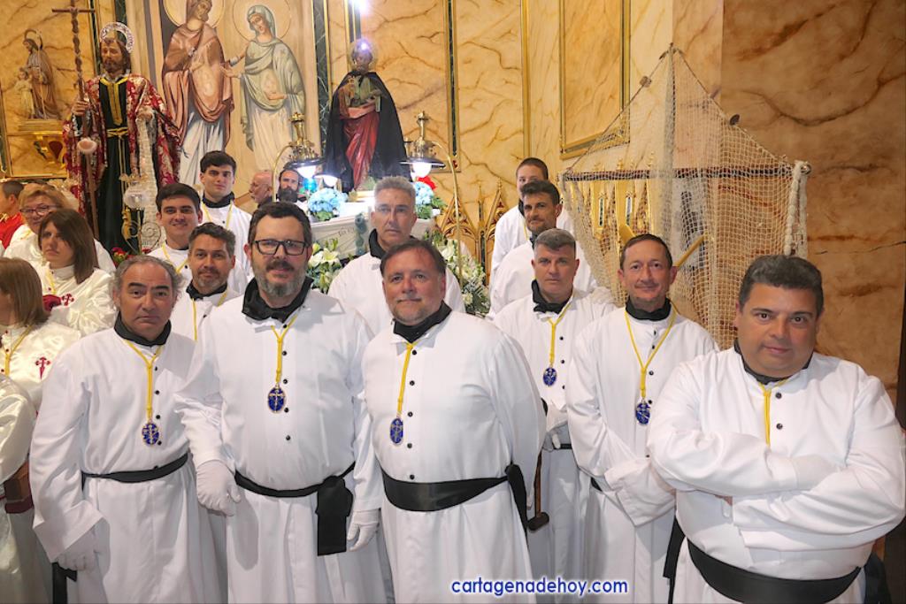 Es la noche de la muerte de Jesucristo, en este caso como Cristo de los Pescadores, quien cruza el pórtico de la iglesia a continuación, situándose por delante el protocolo con el hermano mayor, Pedro Solano; el pregonero de este año, Gonzalo Wandosell; la rectora de la UPCT, Beatriz Miguel; los ediles Cristina Mora y López Pretel, el consejero antes aludido y representantes militares de Marina.