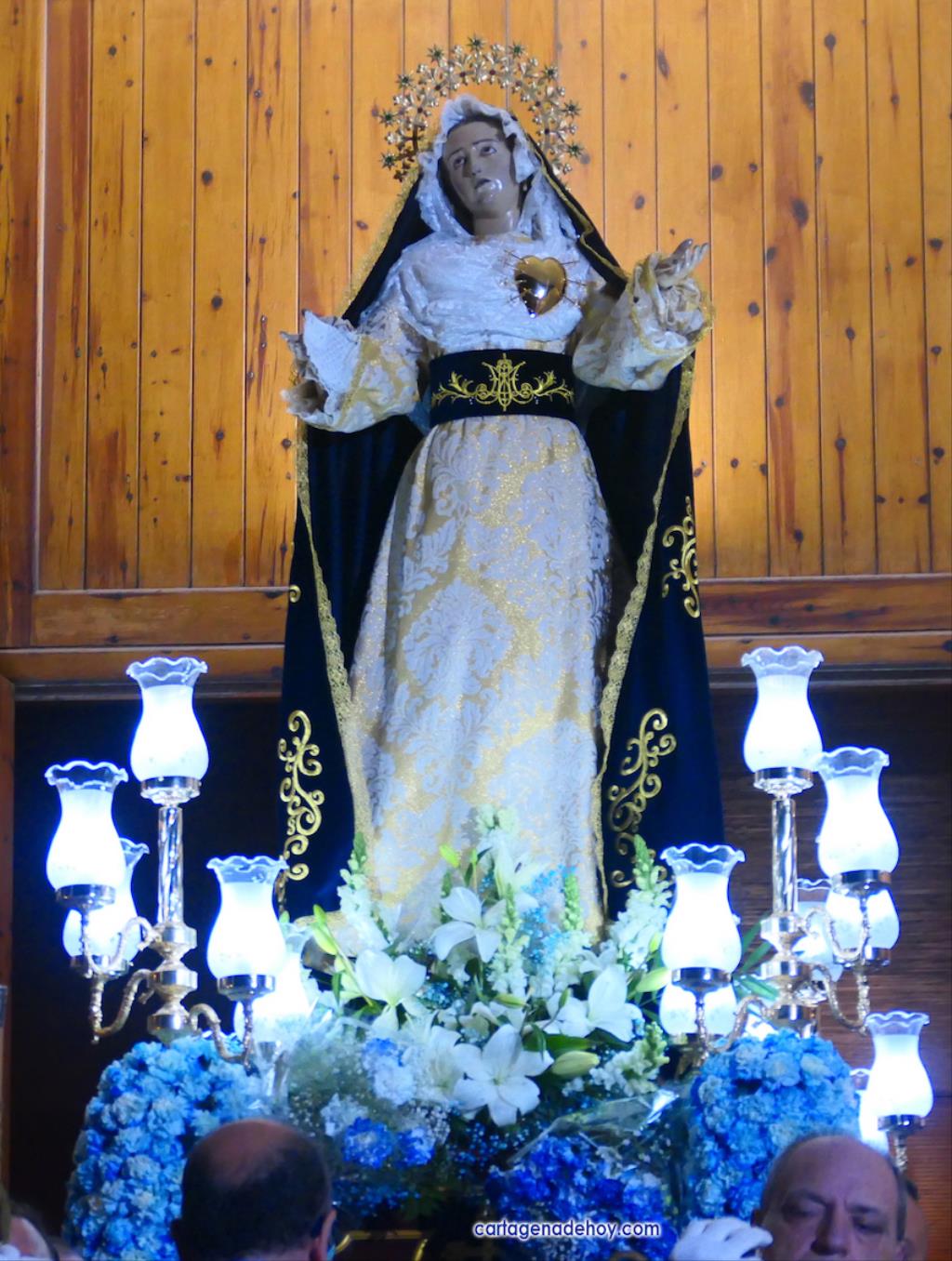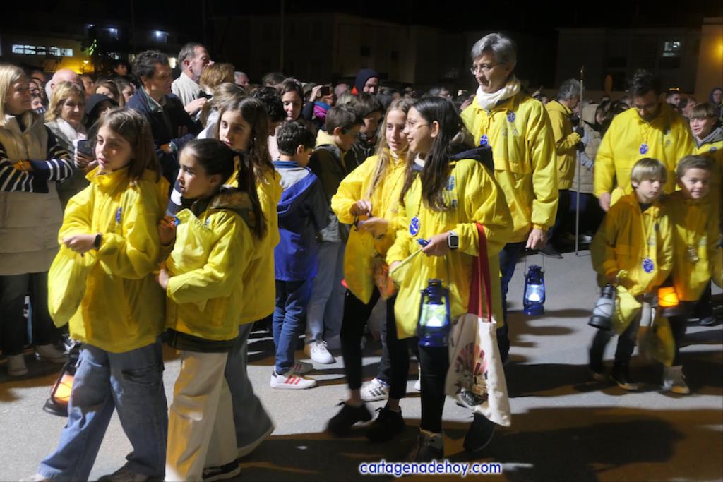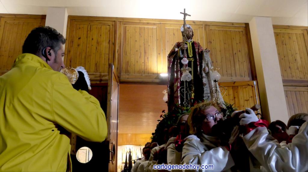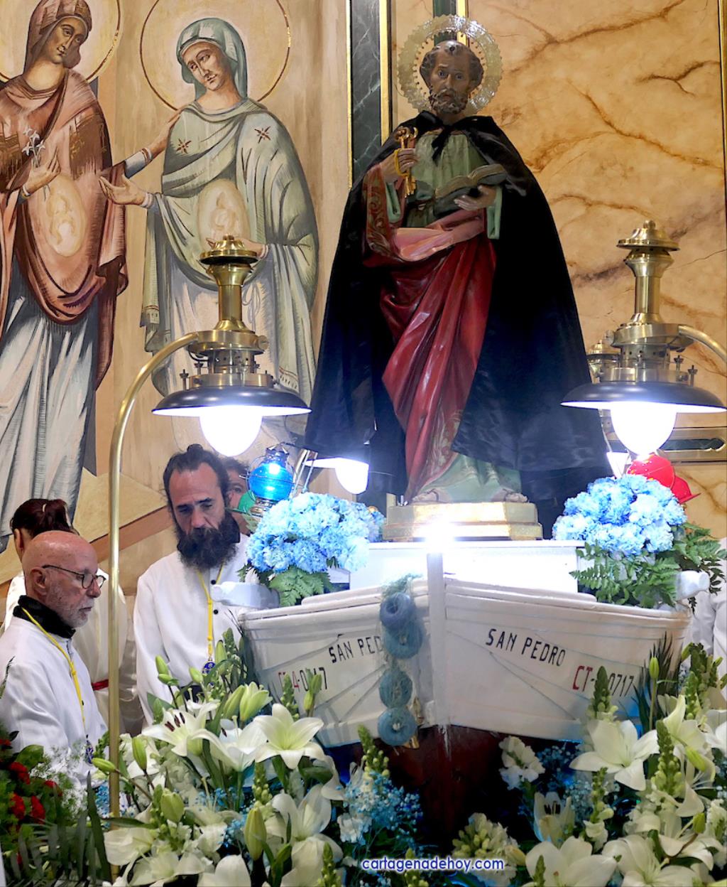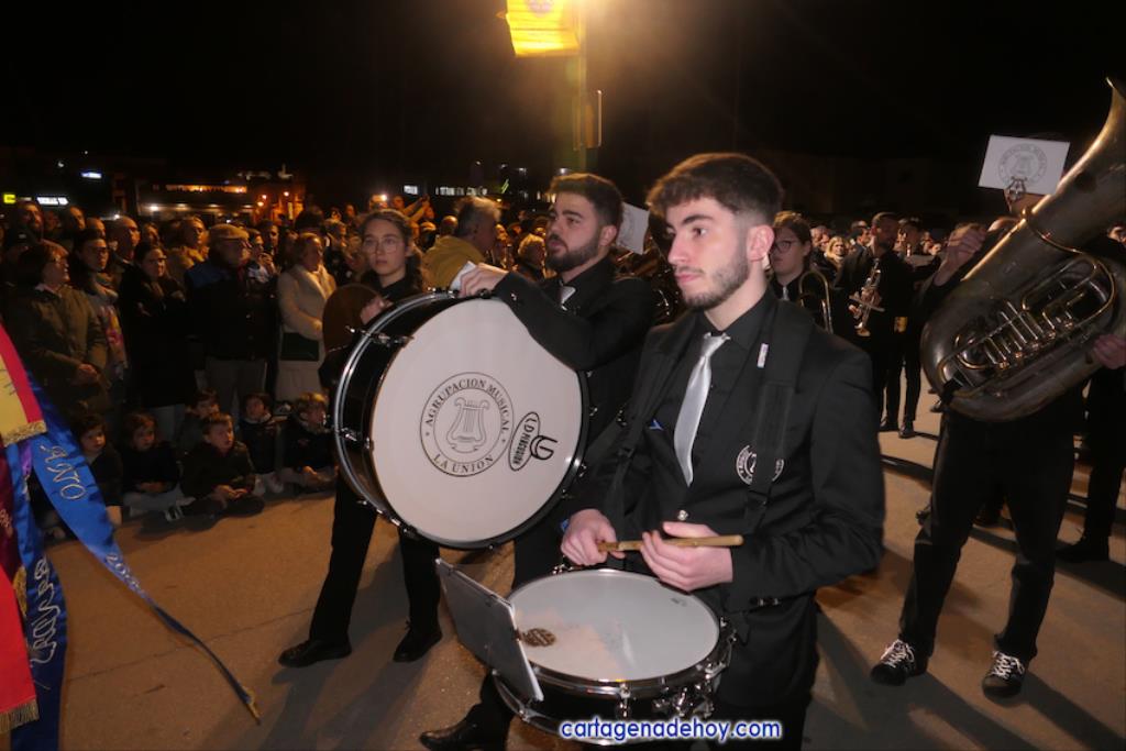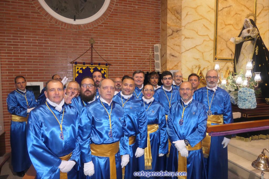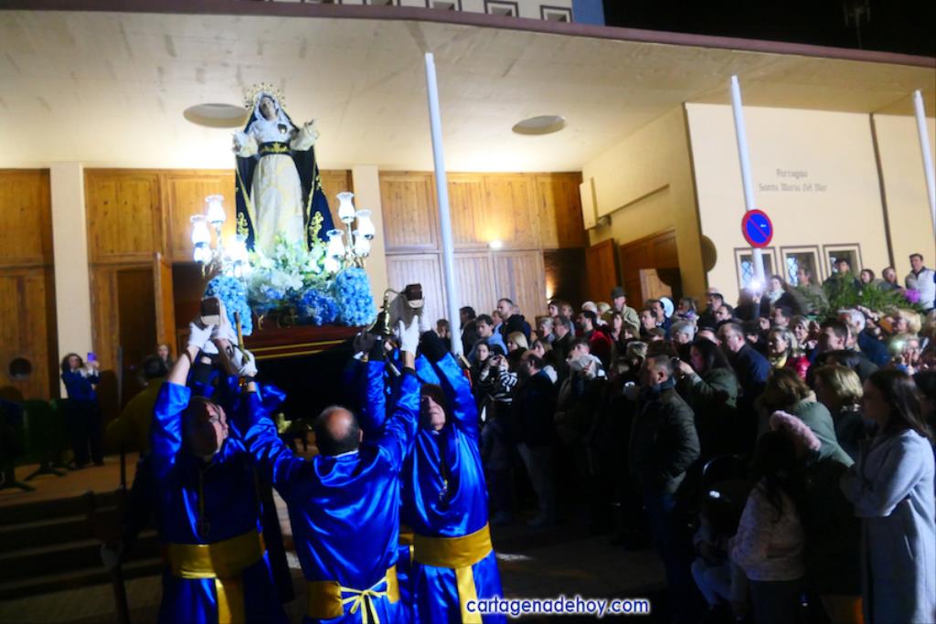 Es la noche de la muerte de Jesucristo, en este caso como Cristo de los Pescadores, quien cruza el pórtico de la iglesia a continuación, situándose por delante el protocolo con el hermano mayor, Pedro Solano; el pregonero de este año, Gonzalo Wandosell; la rectora de la UPCT, Beatriz Miguel; los ediles Cristina Mora y López Pretel, el consejero antes aludido y representantes militares de Marina.