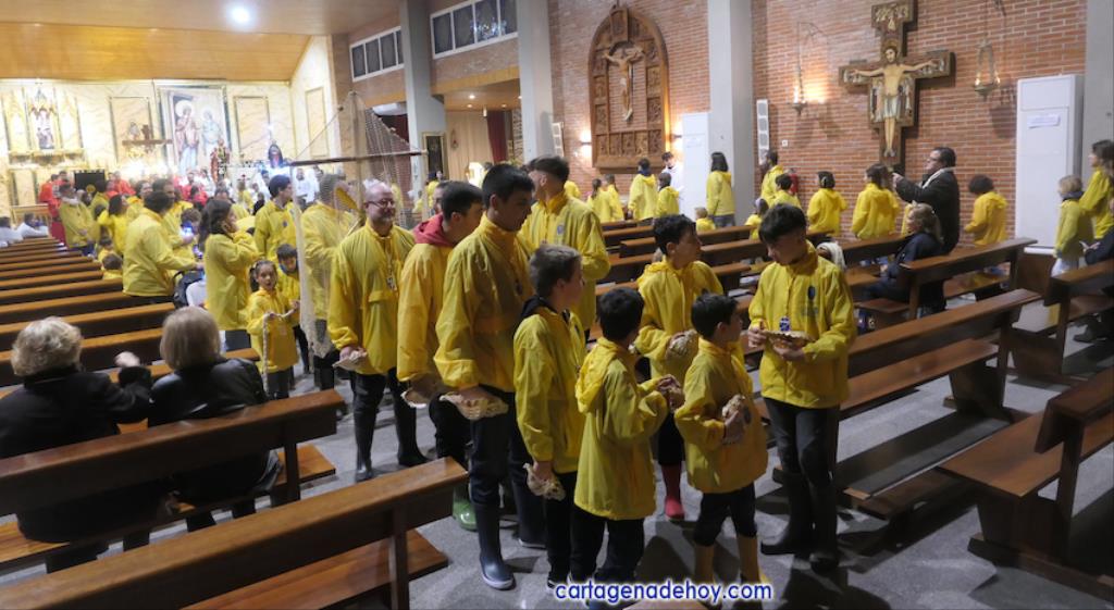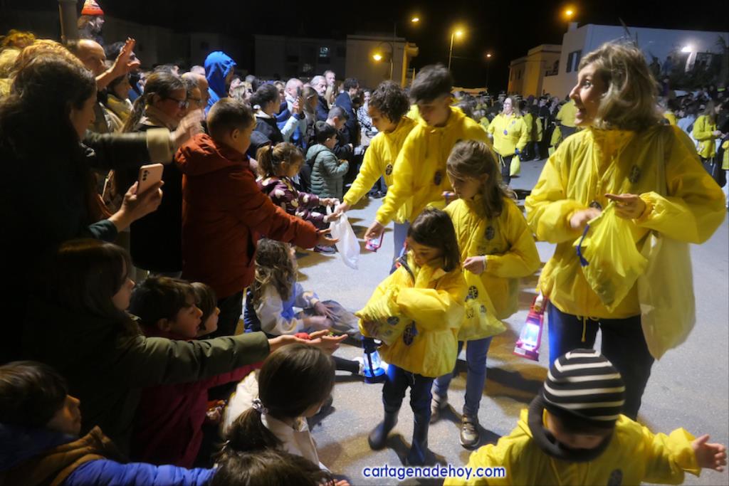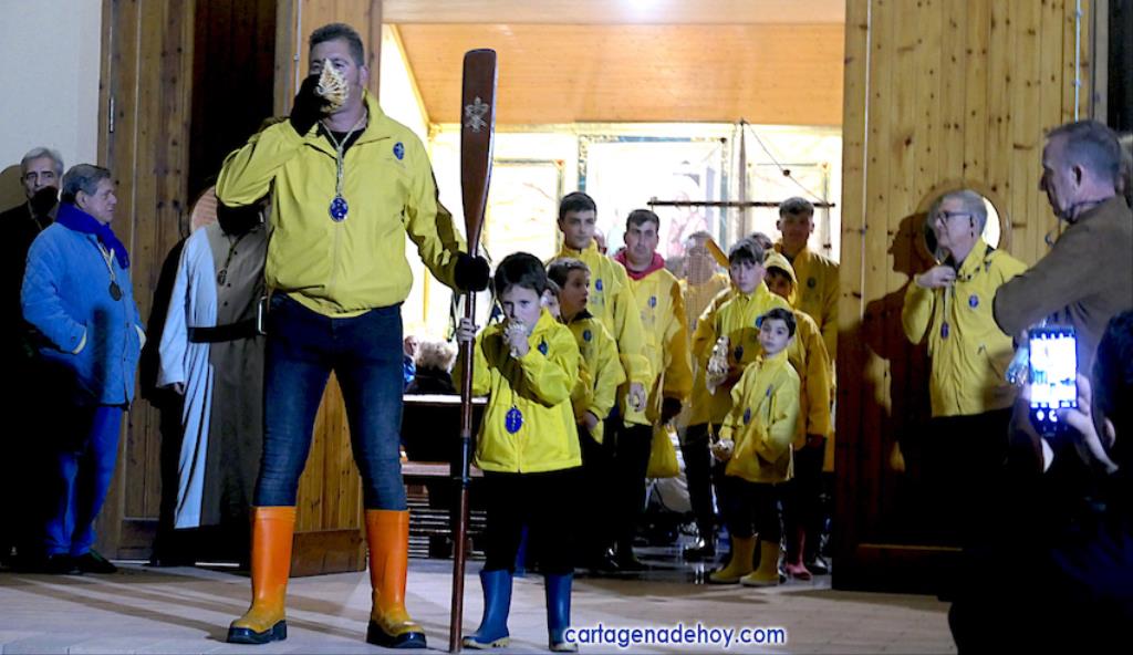 Nada más abrirse las puertas de la iglesia de Santa María del Mar se percibe que es la procesión más marítima, pues aparecen José María Méndez con diez chavales para hacer sonar las caracolas. Un sonido típico tras el cual aparecen otros doscientas personas, principalmente menores de edad, con el típico chubasquero amarillo. Al igual que en 2023, esas prendas ya estaban cogidas todas semanas antes de esta fecha.