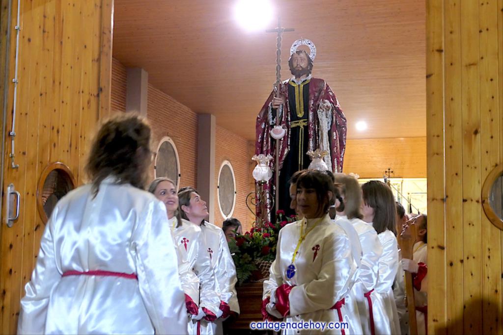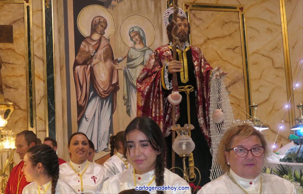 Y llega la gran novedad, Santiago Apóstol, talla creada por el imaginero cartagenero Juan José Quirós Illán, que se ha estrenado en este 2024 junto al tercio de penitentes y el primer grupo de damas portapasos que tiene Cabo de Palos desde que en 1969 se inició su gran desfile de Semana Santa. Como patrón de España, 'escucha' el himno de España, siendo la peana bailada mientras. Por cierto, el capítulo musical de la noche corresponde a la 'Banda de educación y descanso Diego García' y a la Agrupación Musical La Unión.