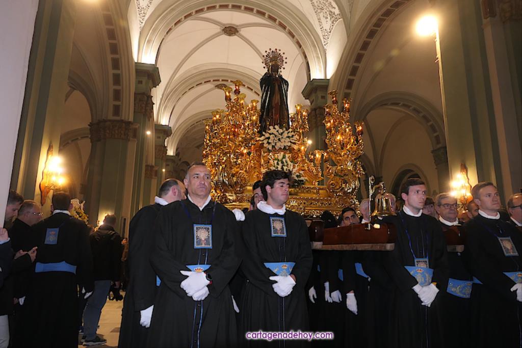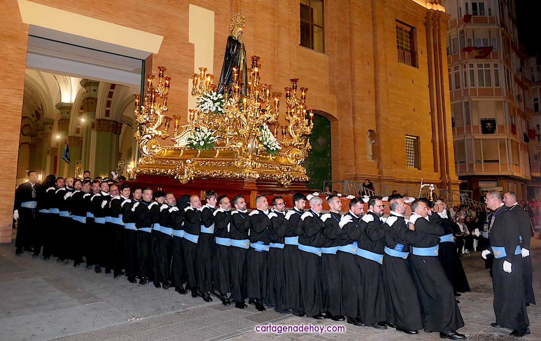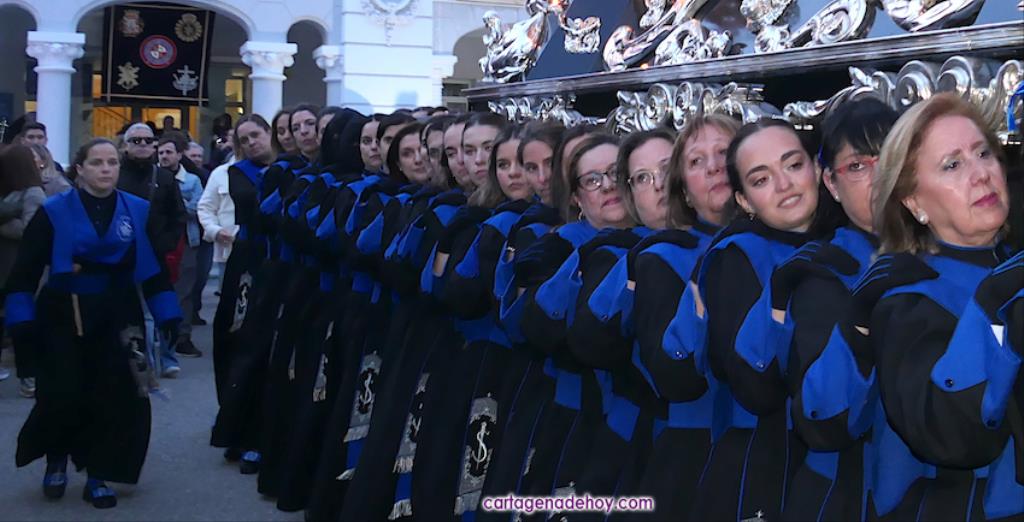 El trono que lleva el único grupo de 140 damas portapasos de la Cofradía Marraja, creado en 2002, cruzar la histórica puerta y bajar por la calle del Duque, incorporándose en la calle de la Caridad a la procesión, que diez minutos antes ha iniciado su marcha desde la iglesia de Santa María, con el grupo de la cofradía en cabeza, yendo detrás los cadetes de los granaderos y el Santo Cáliz (omnipresente en todos los desfiles marrajos) con el antiguo ‘carro bocina’ de la hermandad.