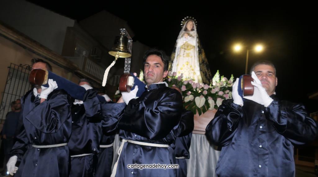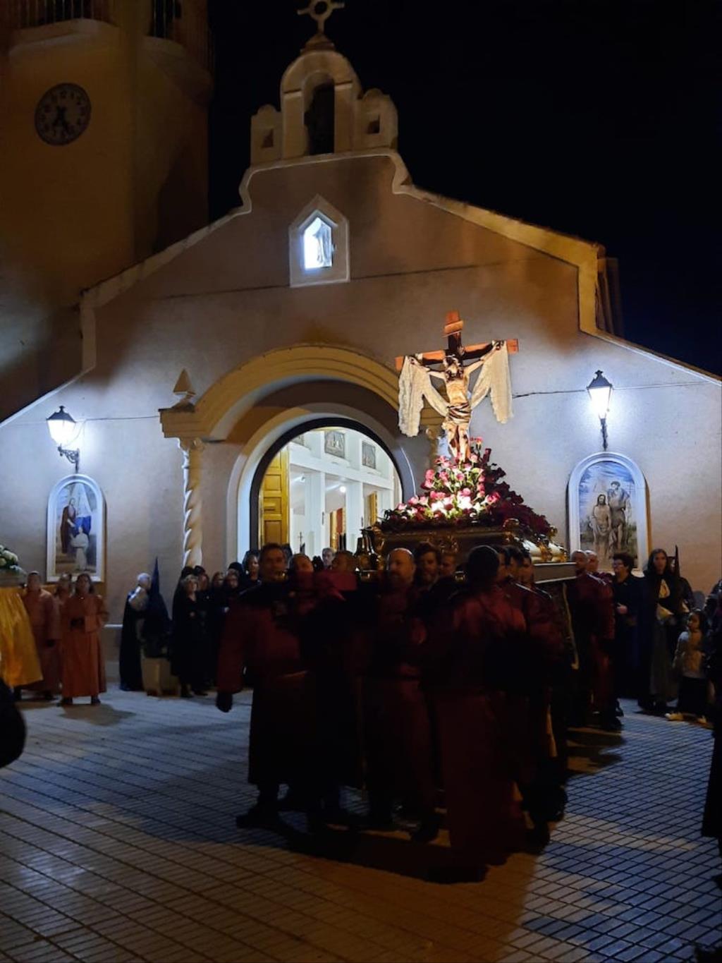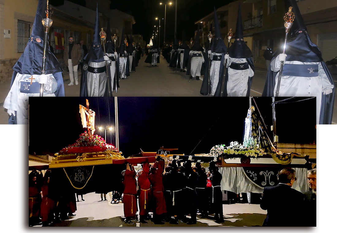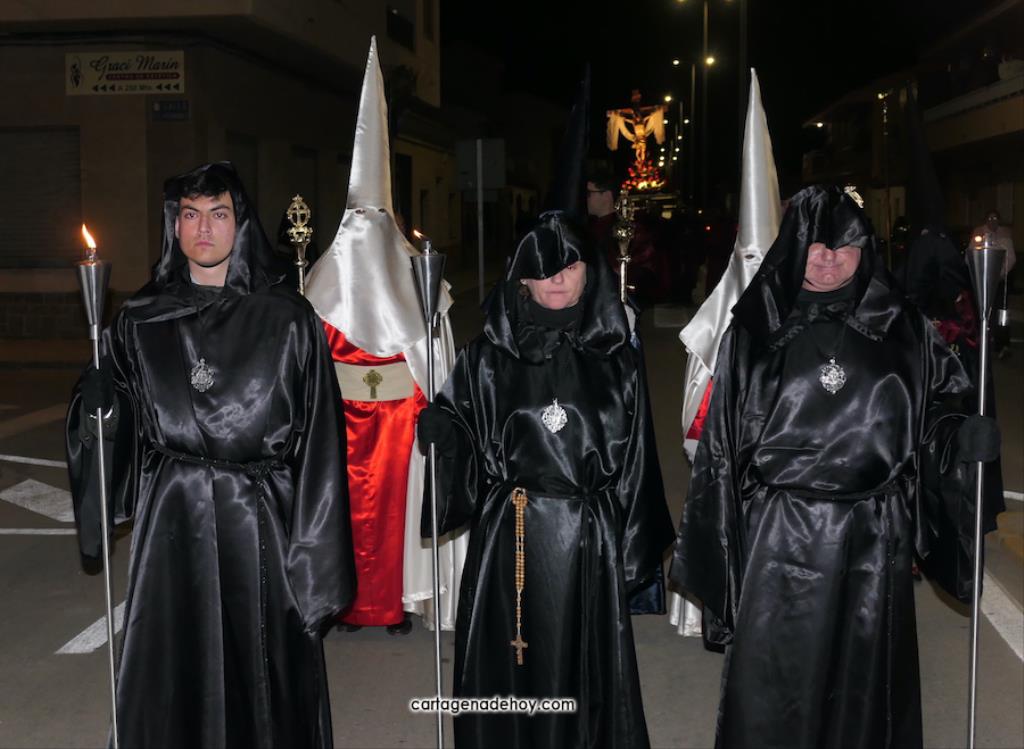 Mujeres portan el primer trono, la Cruz Vacía, insignia de la cofradía. Detrás avanza el tercio del Cristo de la Agonía (talla del siglo XVIII), cerrando el cortejo de los penitentes, imagen y portapasos de la Virgen. Las tres peanas van a hombros, siendo llevados los dos últimos por varones.