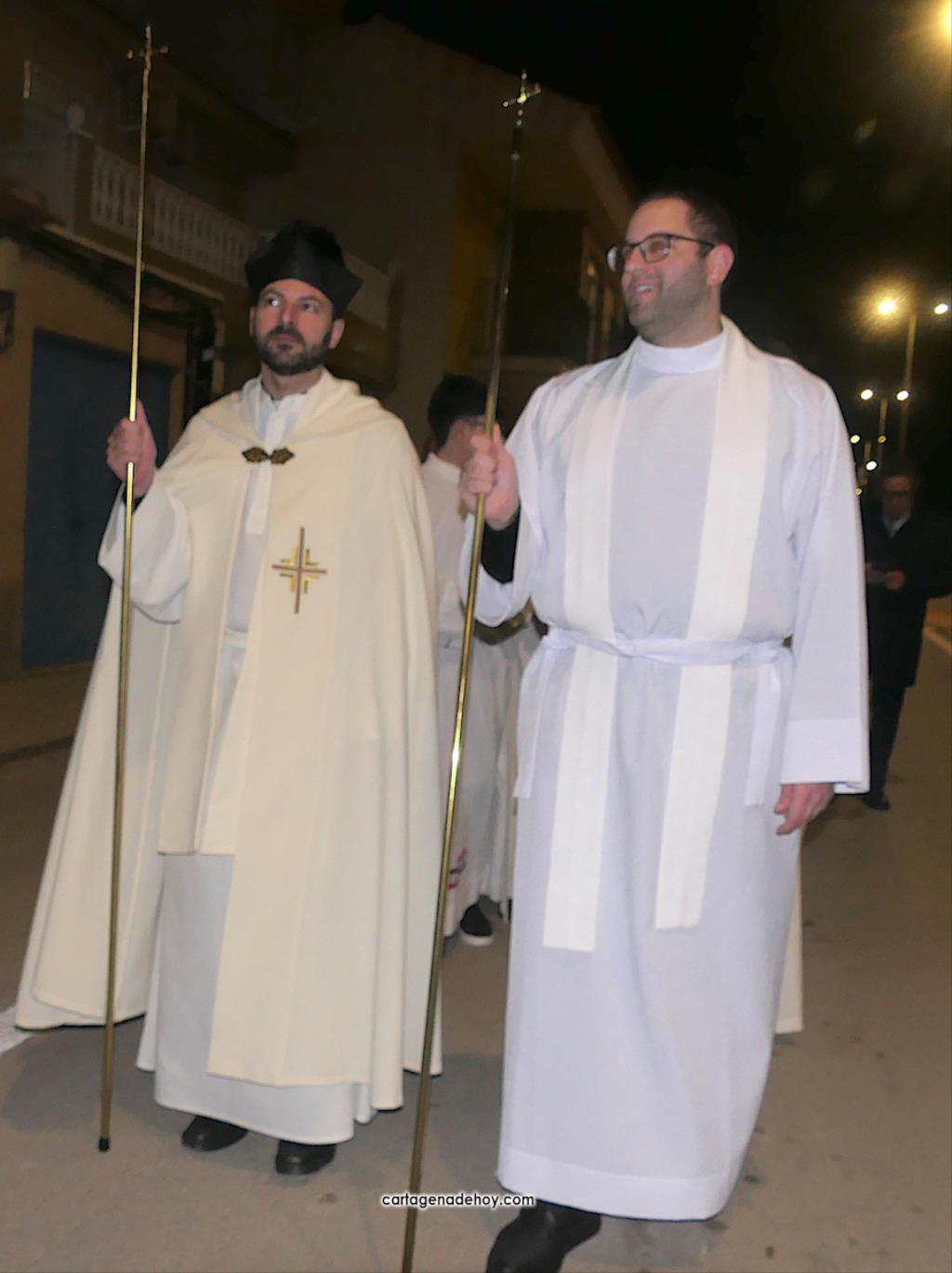 En el cortejo pasionario, que abren dos chicas a golpe de tambor, hay una escuadra de la Legión de Sagunto de Carthagineses y Romanos representando a los 'judíos' de la época y también desde 2017, un quinteto de la Escolta y Honores de la Cofradía de Jesús Resucitado abriendo paso a la Virgen. Este año ha sido novedad la presencia de tres integrantes de la Cofradía de las Ánimas de La Palma, con la que se están estableciendo vínculos (el pasado año procesionistas poblenses estuvieron en la procesión del cementerio palmesano) por parte de la Cofradía del Cristo de la Agonía.