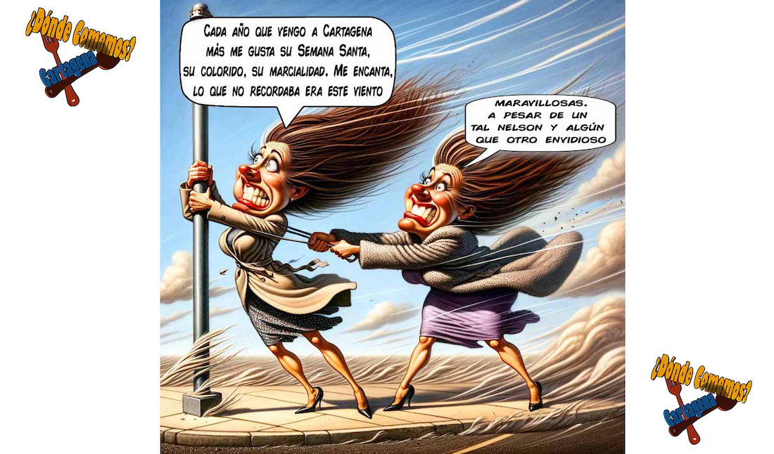 La recién finalizada Semana Santa de Cartagena pasará a la historia, principalmente, por la indeseada compañía del fuerte viento. Este asunto ha merecido esta simpática viñeta del portal ‘¿Dónde comemos?, Cartagena’, que dirigen Aida Belmonte y Enrique Costa.