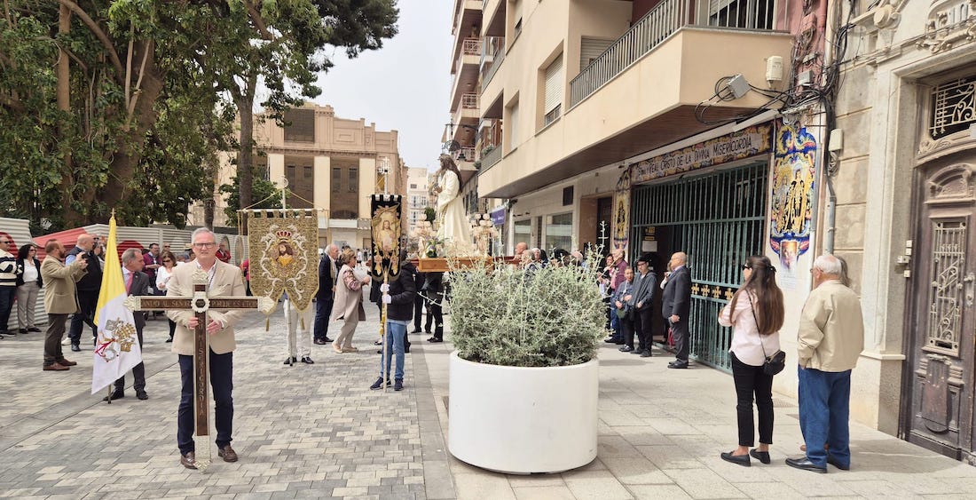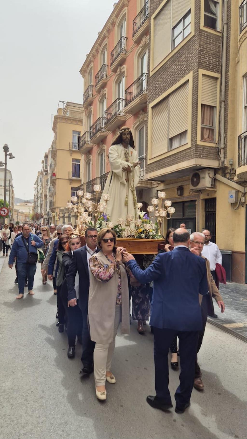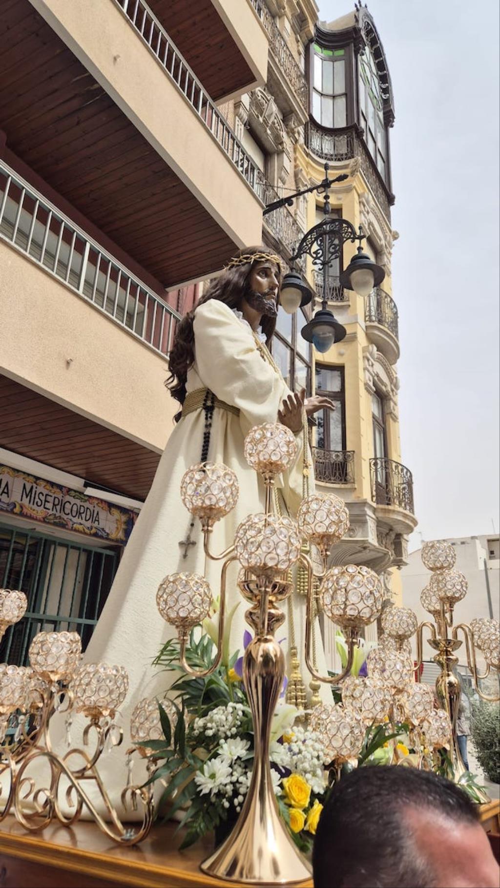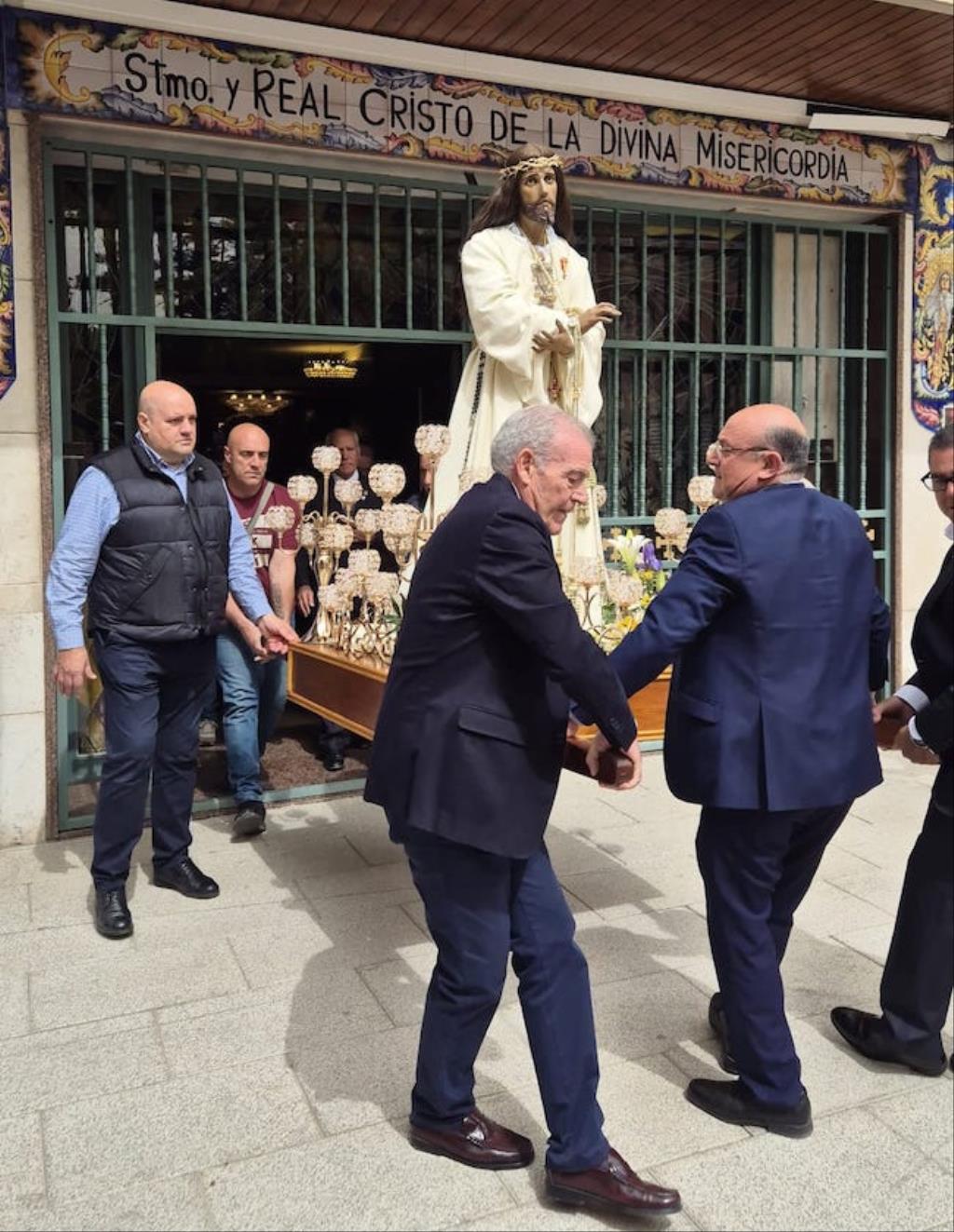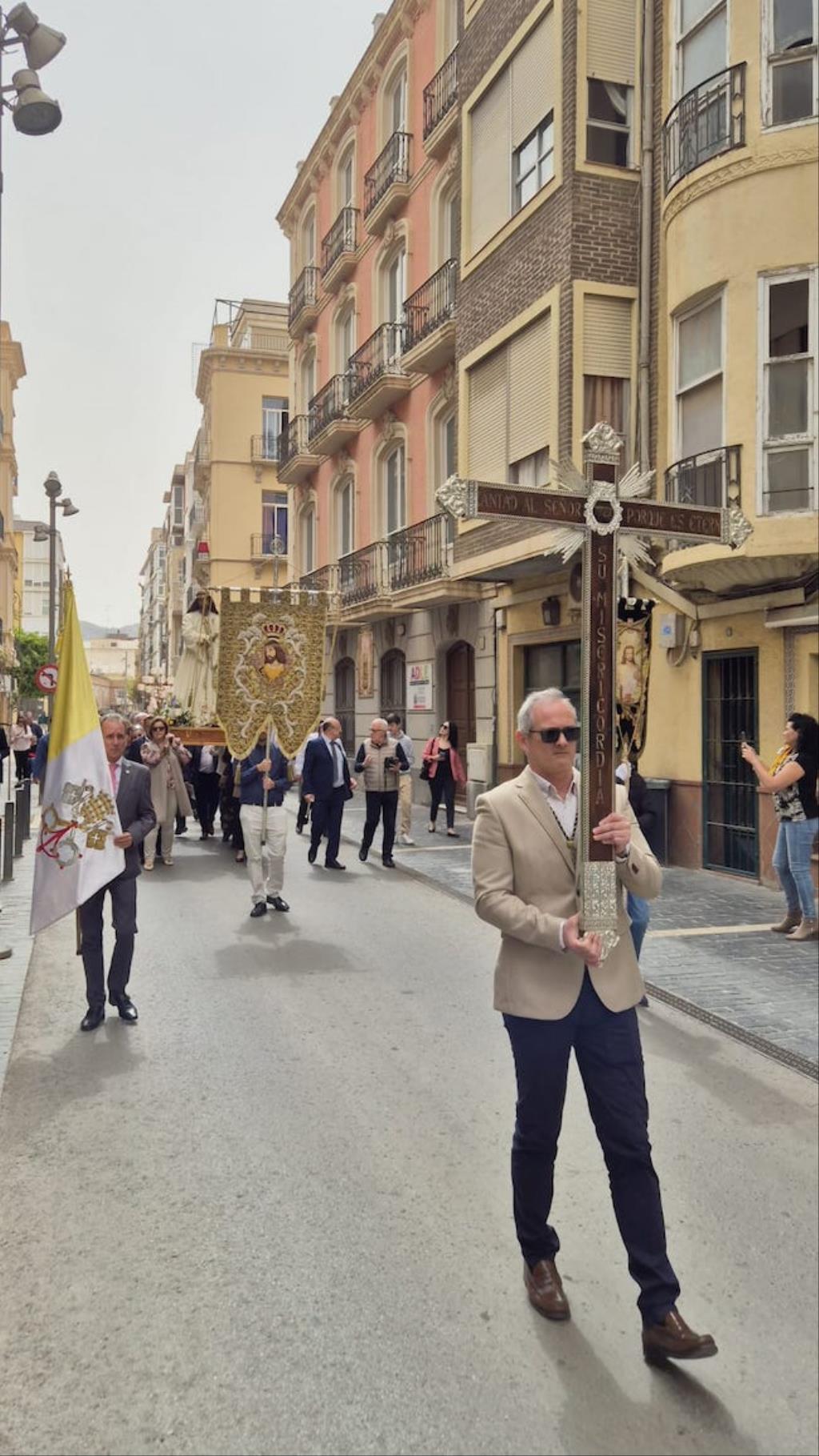 Cristo de la Divina Misericordia salió en la matinal del domingo de su capilla de la plaza de la Merced de Cartagena ('Plaza del Lago') con túnica blanca y a hombros para recorrer, en procesión, el trayecto hacia al Real Basílica Menor de la Virgen de la Caridad, donde presidió la celebración de la festividad de la 'Divina misericordia', la cual proclamó San Juan Pablo II, en su etapa como papa, en el año 2000.