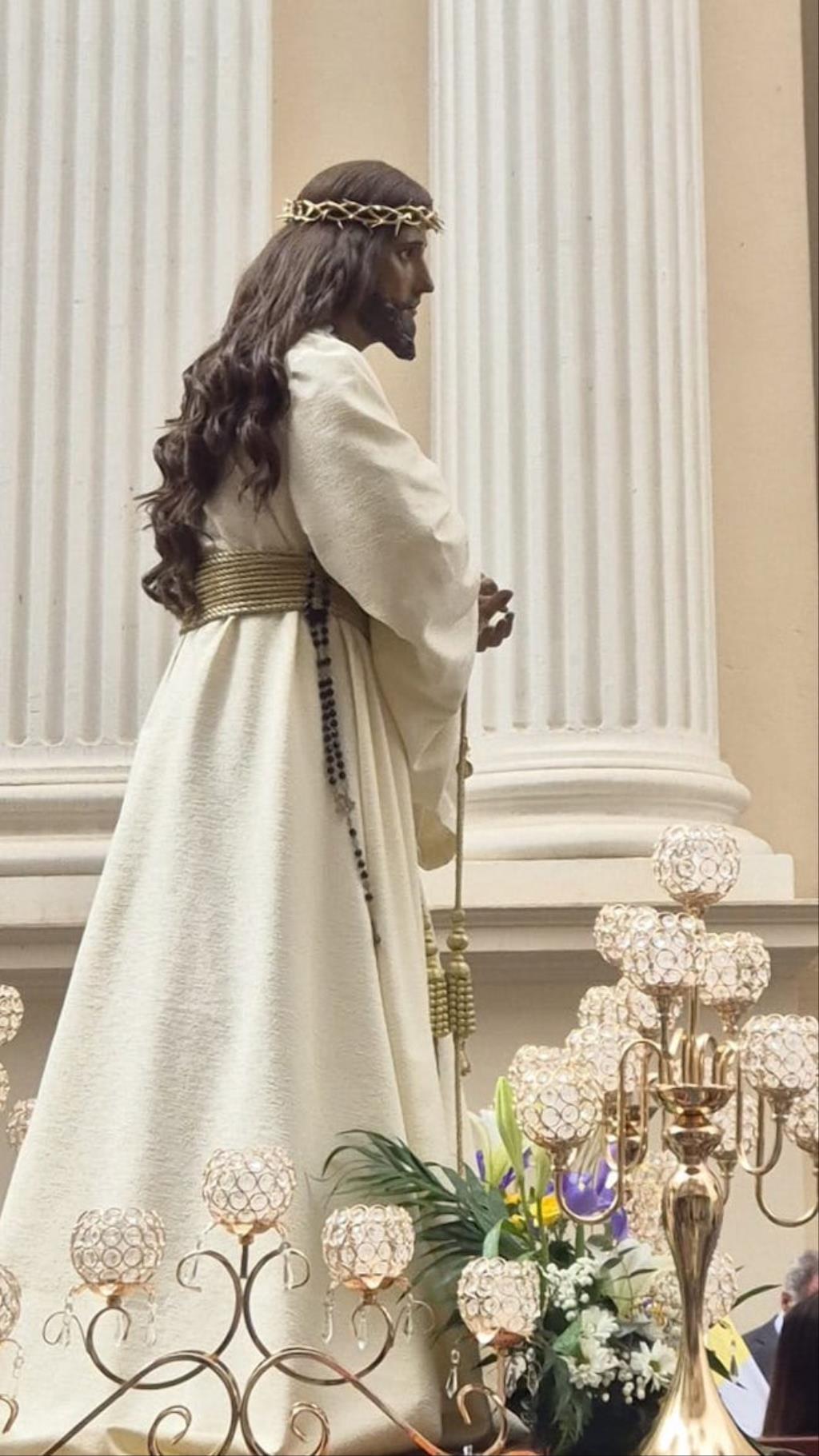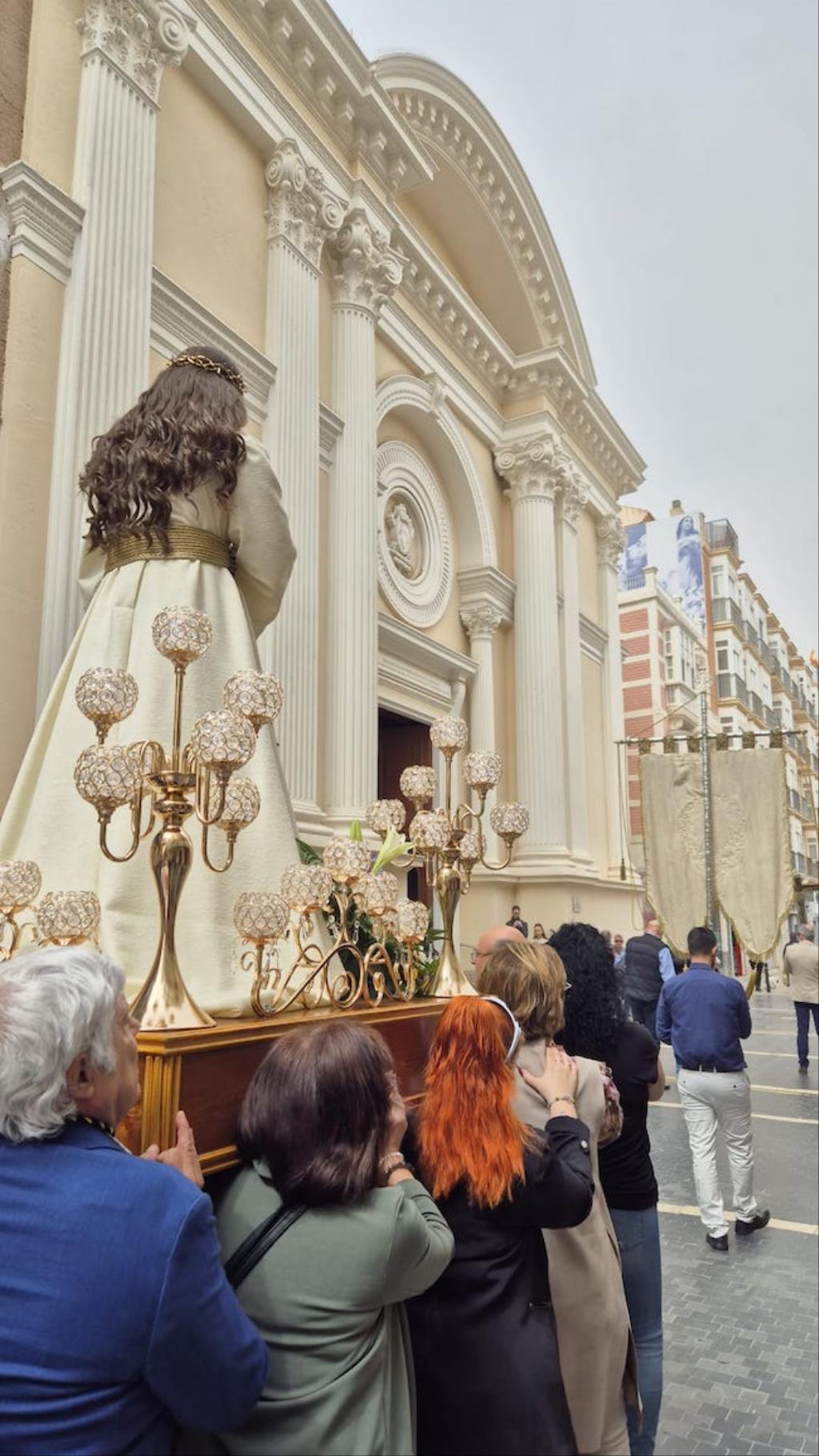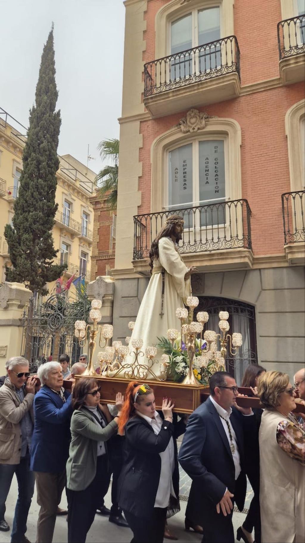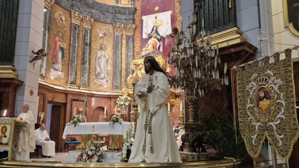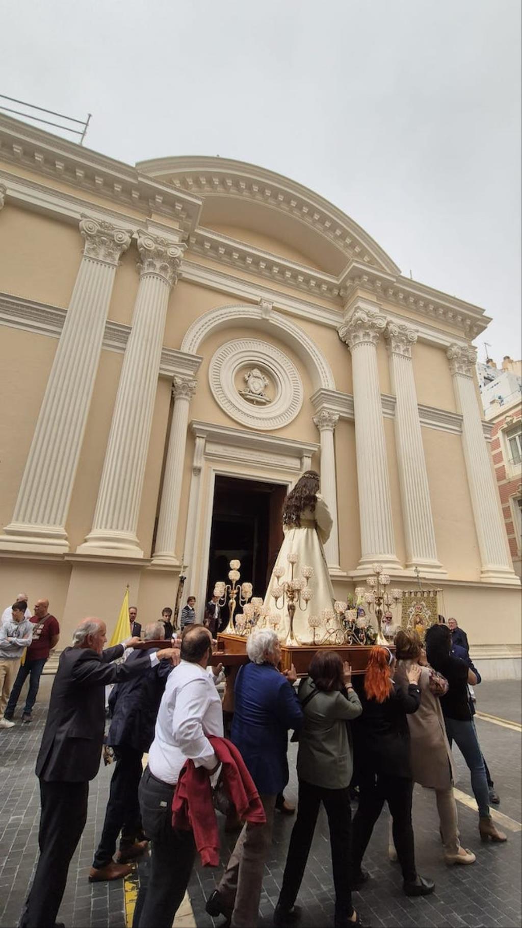 Cristo de la Divina Misericordia salió en la matinal del domingo de su capilla de la plaza de la Merced de Cartagena ('Plaza del Lago') con túnica blanca y a hombros para recorrer, en procesión, el trayecto hacia al Real Basílica Menor de la Virgen de la Caridad, donde presidió la celebración de la festividad de la 'Divina misericordia', la cual proclamó San Juan Pablo II, en su etapa como papa, en el año 2000.