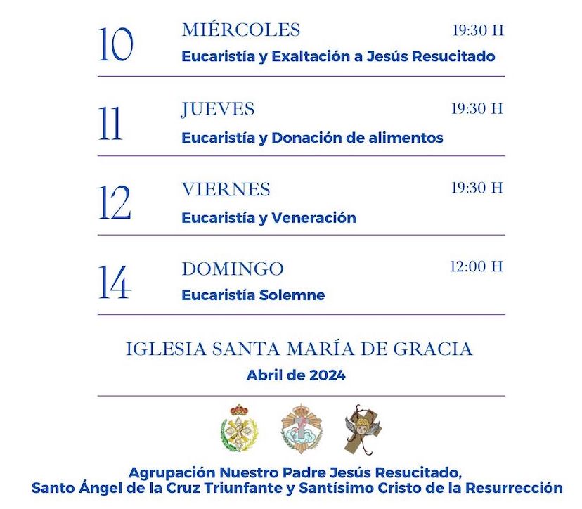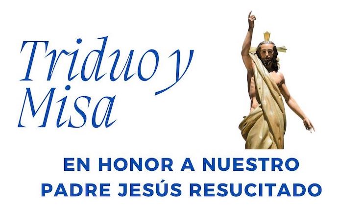 Hoy comienza el triduo al titular de la cofradía y de la agrupación de Nuestro Padre Jesús Resucitado con una exaltación a la imagen a cargo de Manuel Salmerón Martínez, hermano mayor de la Cofradía de la Virgen del Rosell y los Cuatro Santos, además de ser presidente de Honor de la Agrupación Santiago Apóstol. La misa estará presidida por el capellán californio, Francisco Pagán. Mañana, además del oficio, habrá una donación de alimentos para Cáritas; el viernes es la veneración de la talla y el domingo es para la eucaristía solemne.