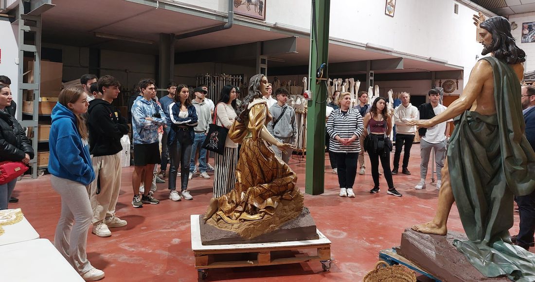 Un grupo de jóvenes estudiantes de la Universidad Católica San Antonio (UCAM) han visitado el almacén de tronos de la Real e Ilustre Cofradía de Nuestro Padre Jesús Resucitado, donde han podido descubrir las maravillas que procesionan, tanto imágenes, como tronos, galas, etc. Entre las cosas que más le han llamado la atención están las varas que portan los penitentes durante las procesiones, que los han dejado sorprendidos.