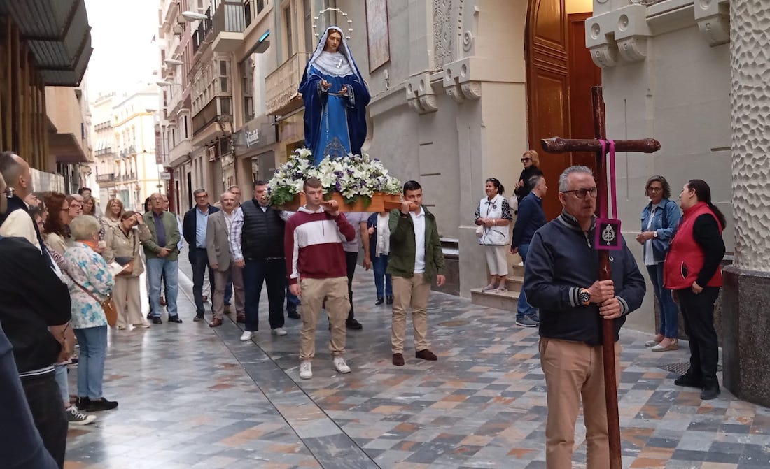 Desde allí, han ido rezando los misterios gozosos por las calles del Casco Histórico de Cartagena hasta llegar a la Capilla del Colegio del Patronato del Sagrado Corazón de Jesús donde D. Lázaro Gomáriz López, capellán de la cofradía, ha oficiado una Eucaristía.