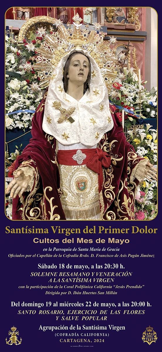 El sábado 18 de mayo de 2024, a las 20:30 horas, se realizará el tradicional Besamano a la Stma Virgen del Primer Dolor, que tendrá lugar en el Altar Mayor de la Parroquia de Santa María de Gracia.