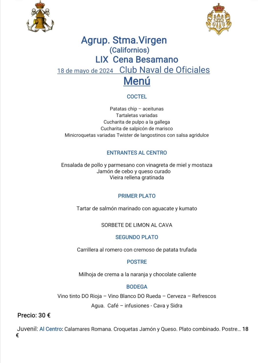 Está permitido el envío de flores como ofrenda a la Stma. Virgen que serán recibidas en la Cofradía California, en la mañana del mismo sábado 18 de mayo.En la noche del 18 de mayo, tras finalizar el Besamano, se celebrará la Cena Oficial de la Agrupación en el Club Naval de Oficiales, sobre las 22:30 horas. Se acompaña menú. Los interesados en acudir deben ponerse en contacto con el Mayordomo de Protocolo, D. Juan Cegarra Ruiz (630708845) y el ingreso se efectuará en la cuenta de la Agrupación (ES59-3018-5751-8820-4679-0826) indicando el nombre y el concepto.