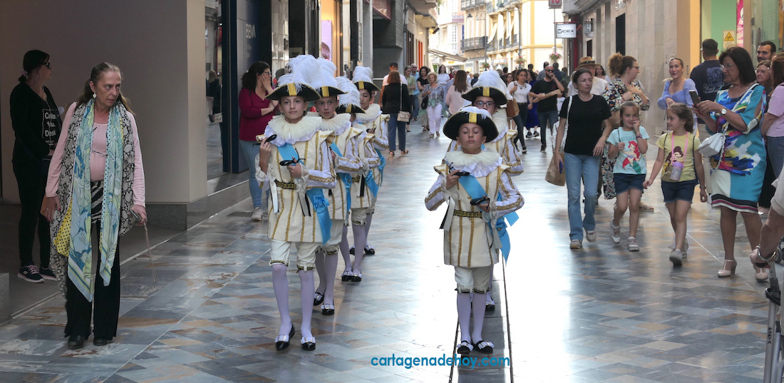 En este caso, son niñas, de nombres Daniela, Marian, Sara, Eva, Paola, India, Leo y Gimena quienes lucieron el traje de bolillo con galernas doradas que, nuevamente, llamó la atención (y generó muchas fotos con móviles) de numerosos viandantes cuando el grupo pisó la calle del Aire para dirigirse hacia la parroquia de Santo Domingo por la ruta del 'Monumento al procesionista' y calle Mayor con el contagioso sonido de castañuelas.