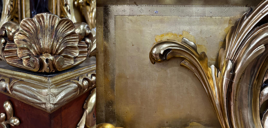 En el dorado del trono trabajaron tres generaciones de artesanos: Bartolomé García Boluda, su yerno Enrique Carabal Rubio y el nieto del primero, Bartolomé Carabal García, residentes en Valencia y que se trasladaron a Cartagena para realizar su trabajo.