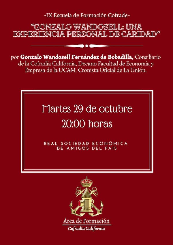 El consilidario de la Cofradía del Cristo del Prendimiento de Cartagena ofrecerá esta tarde, en el inicio de la novena edición del curso de la escuela cofrade, la conferencia 'Una experiencia personal de caridad' en el salón de actos de la Real Sociedad Económica de Amigos del País, en la calle del Aire.