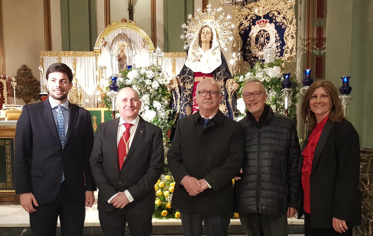 En la imagen se observa, con la talla y el estandarte detrás, al concejal Ignacio Jaúdenes, Luis Francisco Linares, Pedro Ayala (hermano mayor de la Cofradía California), el capellán californio Francisco de Asís Pagán y la presidenta de la agrupación de la Virgen del Primer Dolor, Elena Ramón.