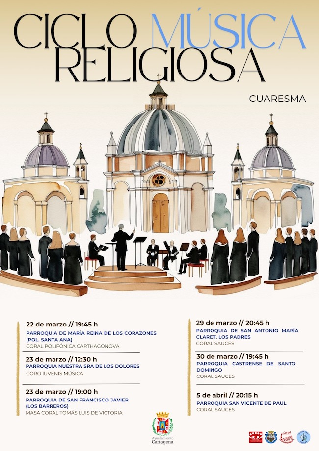 El primero de los conciertos lo ofrecerá la Coral Polifónica Carthagonova este 22 de marzo, a las 19:45 horas, desde la parroquia de María Reína de los Corazones en el Polígono Santa Ana. El 23 de marzo será el turno del Coro Iuvenis Música, quien interpretará varias piezas musicales, a las 12:30 horas, desde la parroquia Nuestra Señora de Los Dolores. Ese mismo domingo, pero a las 19:00 horas, será la Masa Coral Tomás Luis de Victoria la que actuará en la Parroquia de San Francisco Javier en Los Barreros.
