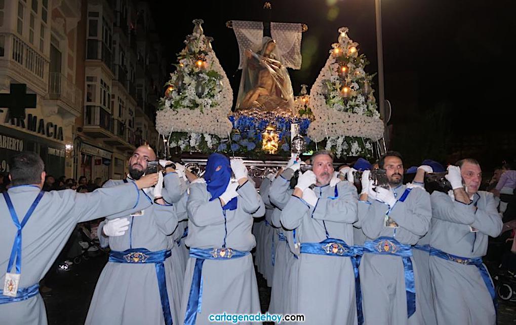 Cartagena conmemora este domingo la llegada de la imagen marraja a la ciudad, en 1925, de la talla creada por Capuz, reproduciendo el traslado desde la estación de tren hasta la iglesia de Santa María. Con el lema 'Con ella', la Virgen irá acompañada por más de cien tambores y músicos voluntarios de diversas agrupaciones. El carrillón de campanas del reloj del Ayuntamiento interpretará la marcha 'Plegaria', de forma ininterrumpida, desde entre las 9 y las 22 horas. Foto con la imagen en su última salida del 25 de marzo de 2024 con motivo del Lunes Santo