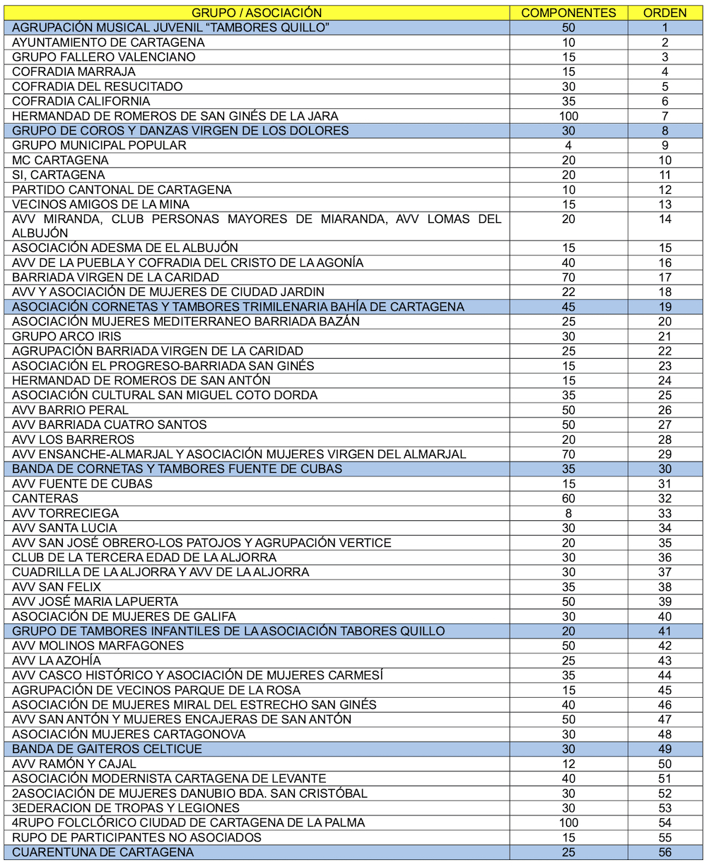 Tambores Quillo y el ayuntamiento abrirán, como es habitual, a las 17 horas del Viernes de Dolores la gran marcha de 56 colectivos y pueblos de Cartagena, que volverá a cerrar la 'Cuarentuna'. La mayoría son asociaciones de vecinos, a los que se suman partidos políticos, cofradías, Carthagineses y Romanos, grupo folclórico, grupso femeninos, modernistas, clubes de tercera edad, romeros de San Ginés y, entre otros, será novedad un grupo fallero valenciano. En penúltimo lugar va el apartado parea participantes no asociados.