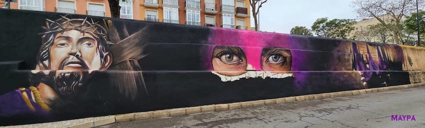 El rostro de titular de la Cofradía Marraja y una muestra de su tercio de penitentes ya luce en la pared de la subida de la plaza del Pescador, que es por donde pasa 'el Jesús del madero' en la madrugada del Viernes Santo hacia el 'encuentro' con 'La Pequeñica'.