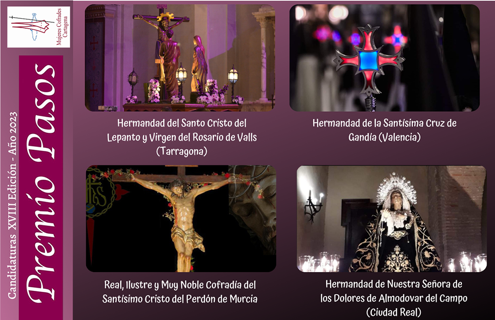 'Cofradía del Santísimo Cristo del Perdón', de Murcia; 'Hermandad de la Santísima Cruz', de Gandía; y 'Germandat del Sant Crist del Lepant i Mare de Deu del Roser de Valls', de Tarragona, repiten como aspirantes al galardón que distingue la labor de colectivos procesionistas que llevan a cabo acciones para la plena integración femenina y que no sean de Cartagena, al ser la localidad de la organización (Mujeres Cofrades). Es novedad la 'Hermandad de Nuestra Señora de los Dolores', de Almodóvar del Campo (Ciudad Real).