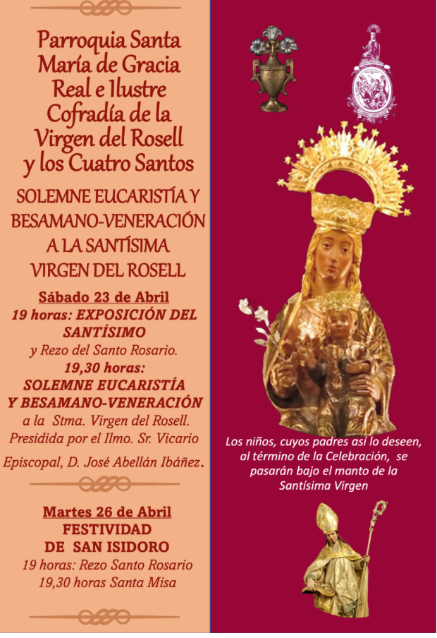 La Cofradía de la Virgen del Rosell y los Cuatro Santos invitan a los cartageneros a la celebración de la solemne Eucaristía y besamano-veneración a la Stma. Virgen del Rosell en la iglesia de Santa María de Gracia, que tendrá lugar esta tarde.